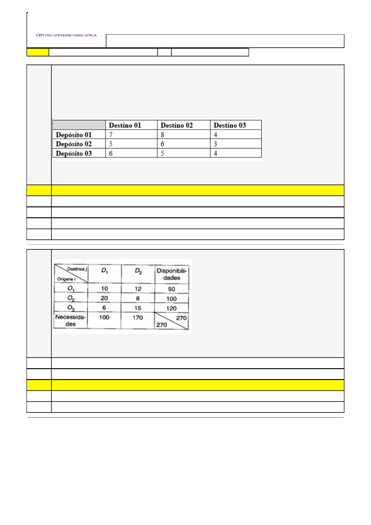 14/11/2024 12:13:53 1/4 Nome: JULIA TRINDADE SOUZA Disciplina: Pesquisa Operacional Respostas corretas são marcadas em amarelo Respostas marcardas por você. REVISÃO DE SIMULADO X A) B) C) X D) E) A) B) C) X D) E) Questão 001 Questão 002 Resolvendo pelo Método Vogel, quanto será transportado ao calcular a primeira penalidade? 120 170 100 50 140 Resolvendo pelo Método de Aproximação de Vogel, qual cédula vai receber a primeira carga? O1D3 O3D2 01D2 01D1 02D3 (Livro- Silva, Ermes Medeiros/ Adaptada) Considere a seguinte tabela do transporte: (UFJF/Adaptada) A prefeitura de uma cidade está fazendo obras em três bairros. O material para essas obras é transportado de três depósitos O1, O2 e O3 de onde são retiradas 57, 76 e 93 toneladas de material, respectivamente. As obras são destinadas para os bairros D1, D2 e D3, que necessitam diariamente de 41, 80 e 105 toneladas, respectivamente. Os custos unitários para o transporte desse material estão na tabela a seguir. 14/11/2024 12:13:53 2/4 A) B) C) D) X E) X A) B) C) D) E) X A) B) C) D) E) Questão 003 Questão 004 Questão 005 Resolvendo o modelo pelo canto noroeste, quanto será transportado da O1D1? 2. 8. 1. 5. 3. Para resolver o problema dos transportes pelo método Vogel, calculamos primeiro as penalidades. O que são penalidades? A diferença entre os dois menores custos unitários de transporte somente nas colunas. A diferença entre os dois maiores custos unitários de transporte na respectiva linha ( e coluna). A diferença entre os dois menores custos unitários de transporte na respectiva linha (e coluna). A soma entre os dois maiores custos unitários de transportes somente nas linhas. A diferença entre os dois menores custos unitários de transporte somente nas linhas. (UFJF-Adaptada) A prefeitura de uma cidade está fazendo obras em três bairros. O material para essas obras é transportado de três depósitos O1, O2 e O3 de onde são retiradas 57, 76 e 93 toneladas de material, respectivamente. As obras são destinadas para os bairros D1, D2 e D3, que necessitam diariamente de 41, 80 e 105 toneladas, respectivamente. Os custos unitários para o transporte desse material estão na tabela a seguir: Resolvendo pelo Método de Aproximação de Vogel, quanto foi encaminhado para O2D1? 26 45 24 23 28 Um produto deve ser distribuído para três destinos, a partir de quatro origens. Os lucros unitários de distribuição e as disponibilidades e necessidades do produto está no quadro abaixo: 14/11/2024 12:13:53 3/4 A) X B) C) D) E) A) B) X C) D) E) A) B) X C) D) E) Questão 006 Questão 007 Questão 008 (Livro- Silva, Ermes Medeiros/ Adaptada) Considere o quadro a seguir. Ao determinar o plano do transporte, utilizando o método canto noroeste, quanto iremos transportar O2D1 40. 50. 15. 10. 20. Resolvendo pelo método Vogel. Qual cédula será feita o primeiro transporte? 04D2 02D2 01D1 03D1 03D2 No quadro de transporte a seguir,a quarta linha mostra as necessidades nos destinos e a quarta coluna as disponilidades nas origens. Os outros dados representam os custos unitáriosde transposte das origens para os respectivos destinos. Resolvendo o problema do transporte, pelo Método Canto Noroeste, quanto será transportado da O2D2? 170 120 50 25 15 Um produto deve ser distribuído para três destinos, a partir de quatro origens. Os lucros unitários de distribuição e as disponibilidades e necessidades do produto está no quadro abaixo: