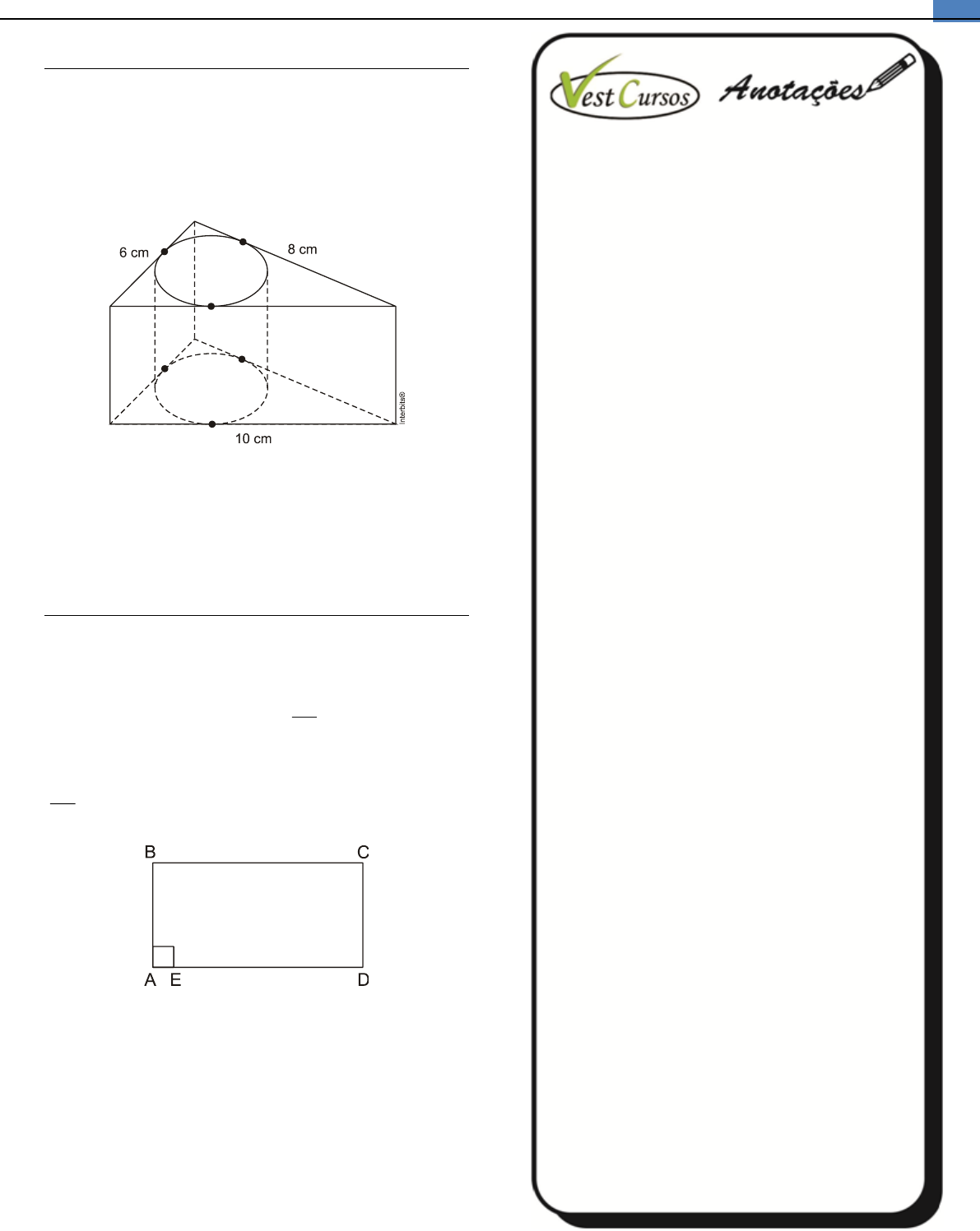 10 CURSO DE MATEMÁTICA ANUAL – AULA 9 – Prof Raul Brito GEOMETRIA PLANA Questão 07 Uma metalúrgica recebeu uma encomenda para fabricar, em grande quantidade, uma peça com o formato de um prisma reto com base triangular, cujas dimensões da base são 6 cm, 8 cm e 10 cm e cuja altura é 10 cm. Tal peça deve ser vazada de tal maneira que a perfuração na forma de um cilindro circular reto seja tangente as suas faces laterais, conforme mostra a figura. O raio da perfuração da peça é igual a a) 1 cm. b) 2 cm. c) 3 cm. d) 4 cm. e) 5 cm. Questão 08 O governo cedeu terrenos para que famílias construíssem suas residências com a condição de que no mínimo 94% da área do terreno fosse mantida como área de preservação ambiental. Ao receber o terreno retangular ABCD, em que AB = BC 2 , Antônio demarcou uma área quadrada no vértice A, para a construção de sua residência, de acordo com o desenho, no qual AE = AB 5 é lado do quadrado. Nesse caso, a área definida por Antônio atingiria exatamente o limite determinado pela condição se ele a) duplicasse a medida do lado do quadrado. b) triplicasse a medida do lado do quadrado. c) triplicasse a área do quadrado. d) ampliasse a medida do lado do quadrado em 4%. e) ampliasse a área do quadrado em 4%.