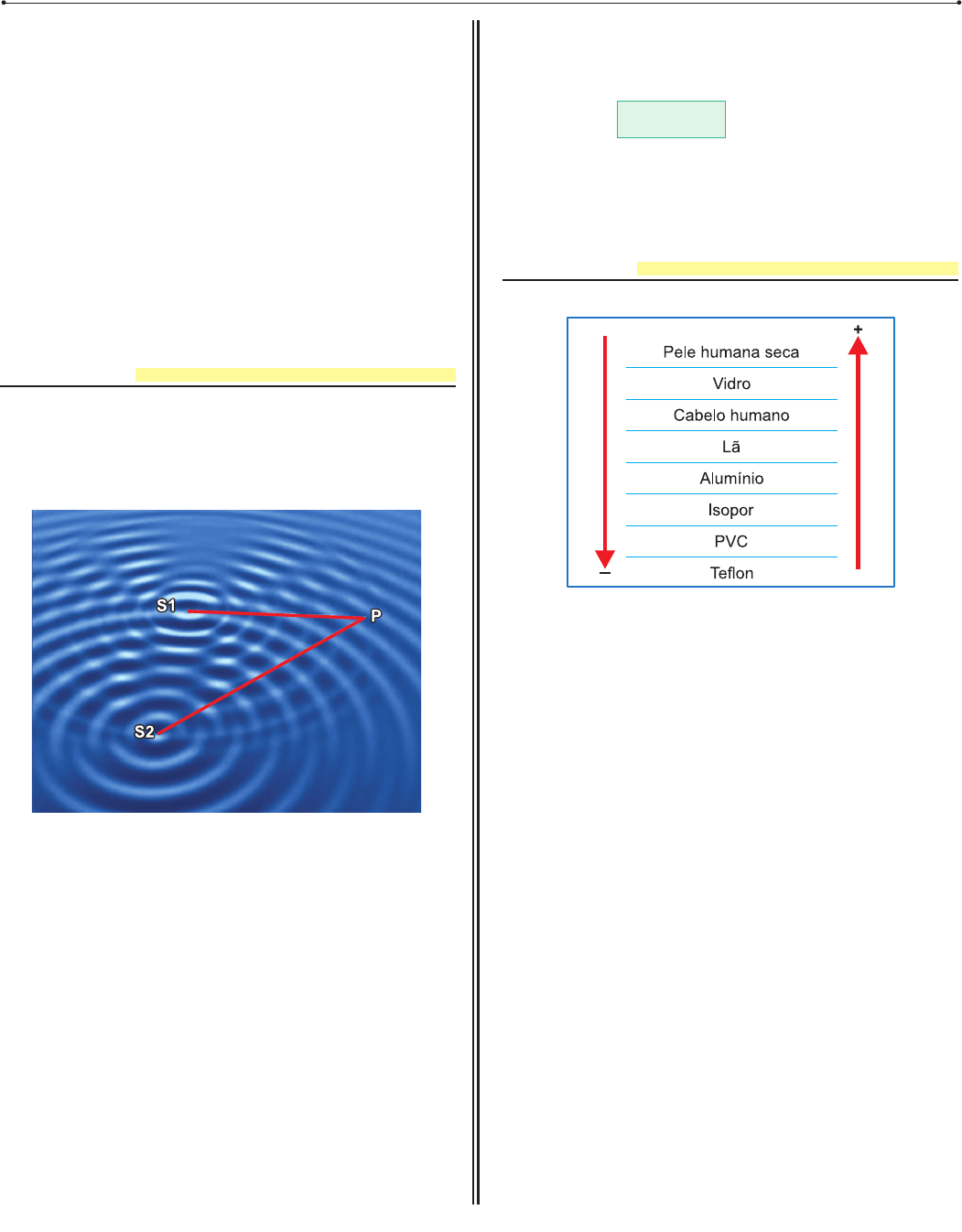 � C, tem-se, somente, água na fase sólida. � T, as três fases coexistem em equilíbrio. � D, coexistem as fases vapor e líquida. Resolução Ponto T (triplo): H2O(s) →← H2O(l) →← H2O(v) Ponto A: H2O(s) →← H2O(l) Ponto B: H2O(l) →← H2O(v) Ponto C: somente H2O(v) Ponto D: H2O(s) →← H2O(v) Resposta: D QUESTÃO 114 Ondas são formadas num lago por meio de duas fontes S1 e S2, que produzem pulsos simultâneos, com a mesma frequência e estão em fase, como na figura abaixo. Pelo ponto P passa uma linha nodal. (Disponível em: https//vestibulandoonline.blogspot.com/2011/09/ ondas.html. Adaptado.) A distância entre S1 e P é de 60cm e de S2 a P, 62cm. O comprimento de onda das ondas produzidas pode ser igual a � 2,0cm � 4,0cm � 6,0cm � 8,0cm � 10,0cm Resolução Sendo a interferência destrutiva, temos: x2 – x1 = (2n – 1) λ —— 2 62cm – 60cm = (2n – 1) λ —— 2 λ = 4,0 ———– 2n – 1 (cm) Para n = 1 ´ λ1 = 4,0cm Resposta: B Caderno 6 – Frente 2 – Módulo 26 – Média QUESTÃO 115 A figura representa uma série triboelétrica É correto afirmar que � ao se atritar lã com a pele humana seca, a pele ficará com carga positiva e a lã com carga negativa. � ao se atritar lã com isopor, a lã ficará com carga negativa e o isopor com carga positiva. � ao se atritar o PVC com vidro, ambos ficarão com o mesmo tipo de carga elétrica. � ao se atritar a lã com o PVC, eles não serão eletrizados por serem isolantes. � ao se aproximar o cabelo humano do teflon, eles serão repelidos. Resolução Na eletrização por atrito há transferência de elétrons de um corpo para o outro, de modo que os corpos ficarão eletrizados com cargas de sinais contrários e mesmo módulo. Na série triboelétrica fica com carga positiva o material que estiver acima, pele com lã: pele positiva e lã negativa. Resposta: A Caderno 4 – Frente 3 – Módulo 35 – Fácil 2DIA_ENEM_PROVA3_AMARELO_Tony_2024-PC.indd 142DIA_ENEM_PROVA3_AMARELO_Tony_2024-PC.indd 14 04/09/2024 10:20:2904/09/2024 10:20:29