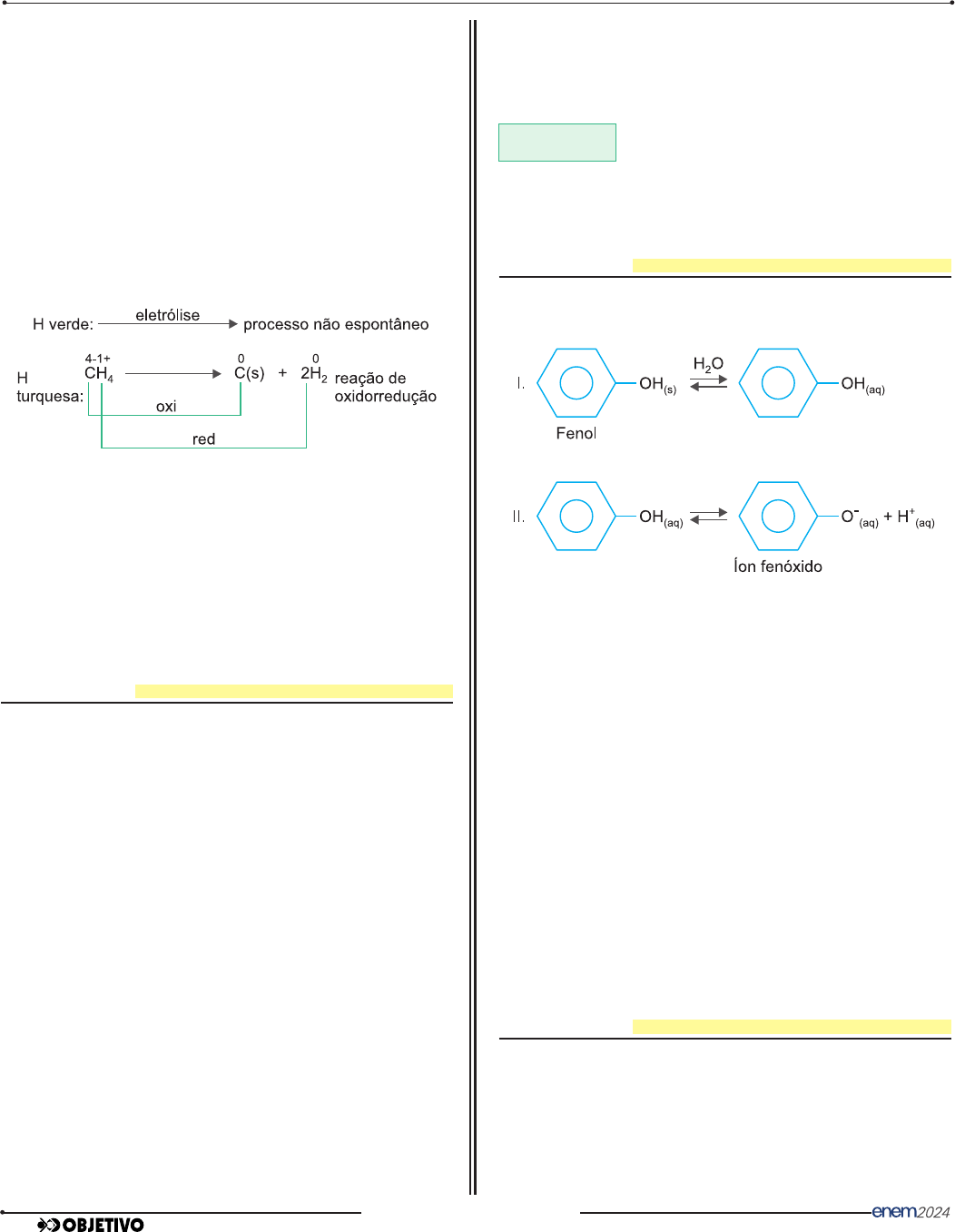 10 CN • 2.o dia • RESOLUÇÕES � Na eletrólise da água, o hidrogênio verde é obtido no anodo da célula eletrolítica. Resolução CH4(g) + H2O(v) →← CO(g) + 3 H2(g) 2V 4V Um aumento de pressão desloca o equilíbrio no sentido dos reagentes (contração de volume), portanto, diminui o rendimento em relação ao H2. H marrom: dois óxidos: H2O e CO H verde: H2 é obtido no catodo 2 H+ + 2e– → H2 Resposta: C QUESTÃO 105 Um bartender precisa de água a 0ºC para preparar os sucos de um restaurante, que possui apenas água a 20ºC e 4,0kg de gelo a –15ºC disponíveis. A fim de maximizar a produção de suco, ele coloca todo esse gelo em um recipiente termicamente isolado e adiciona água. Considere que o gelo possua calores específico sensível e latente específico de, respectivamente, 0,5 cal/gºC e 80 cal/g, e a água possua calor específico sensível de 1,0 cal/gºC. Para que se atinja o equilíbrio térmico a 0ºC, com toda a massa de gelo sendo derretida, a quantidade de água que o bartender deve adicionar ao recipiente térmico é de � 17,5kg � 20,5kg � 23,0kg � 25,5kg � 28,0kg Resolução |Qcedido pela água| = |Qrecebido pelo gelo| m c |Δθ| = mg cg Δθg + mg Lf m . 1,0 . 20 = 4,0 . 103 . 0,5 . 15 + 4,0 . 103 . 80 20m = 4,0 . 103 . 87,5 m = 17,5 . 103g m = 17,5kg Resposta: A Caderno 1 – Frente 2 – Módulo 5 – Média QUESTÃO 106 A solubilidade do fenol em água depende do pH do meio: O fenol dissolve-se mais em meio: � ácido, de pH = 8 ou maior. � básico, de pH = 6 ou menor. � neutro, de pH = 7. � ácido, de pH = 6 ou menor. � básico, de pH = 8 ou maior. Resolução O fenol dissolve-se mais em meio básico, de pH = 8 ou maior, pois a concentração dos íons H+ diminui na presença de íons OH– (H+ + OH– → H2O), deslocando o equilíbrio no sentido do íon fenóxido, portanto, aumentando a solubilidade do fenol. Resposta: E QUESTÃO 107 O Acordo de Paris tem por objetivo alcançar a descarbonização do planeta e estabelece como meta limitar o aumento da temperatura global a 1,5ºC. Nesse contexto, o hidrogênio verde mostra-se como uma alternativa promissora por tratar-se de um vetor energético obtido a partir da tecnologia limpa. 2DIA_ENEM_PROVA3_AMARELO_Tony_2024-PC.indd 102DIA_ENEM_PROVA3_AMARELO_Tony_2024-PC.indd 10 04/09/2024 10:20:2904/09/2024 10:20:29