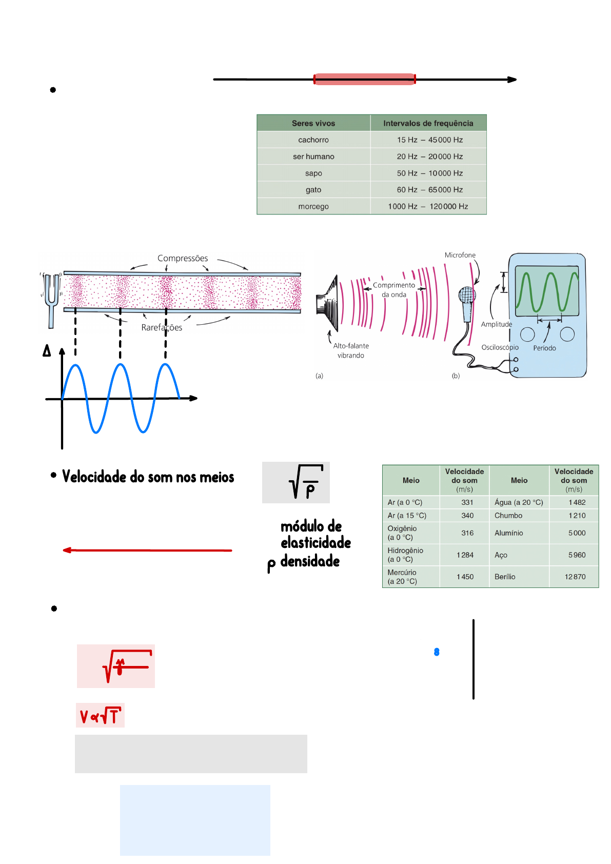 # SOM —Onda mecânica -Longitudinal (nos fluidos) -Tridimensional Vsólidos > Vlíquidos > Vgases Em geral: + rígidos V = Y Velocidade do som nos gases V = .R.T M maior temperatura: som mais rápido menor temperatura: som mais lento a 15&C V = 340 m/s (Fórmula de Laplace) infrassom som audível ultrassom 20 Hz 20000 Hz frequência Velocidade do som nos meios módulo de elasticidade densidade V T a 0&C Classificação: ACÚSTICA V = 331 m/s a 20&C V = 343 m/s O som não se propaga no vácuo. No ar atmosférico: p x osciloscópioonda longitudinal de pressão Relâmpago x Trovão somluz Y: : OBS: O vento influência na velocidade do som no ar em relação à Terra. Caso tenha vento, é necessário fazer um composição vetorial. 3 x 10 m/s 340 m/s : # QUALIDADES FISIOLÓGICAS DO SOM 1) Altura Qualidade associada à frequência do som Alto Baixo f f 2) Intensidade Qualidade associada à amplitude do som. Forte Fraco A A Agudo "Fino" Grave "Grosso" p x ou t p p p x ou t x ou t x ou t # REFLEXÃO SONORA Persistência auditiva t 0,1 s Eco Reverberação Prolongamento do som d > v. t 2.x > 340.0,1 2.x > 34 x > 17 m Tempo que uma onda sonora persiste em nosso sistema auditivo. Som direto e o som refletido chegam praticamente no mesmo instante. Nosso sistema auditivo consegue distinguir o som direto do som refletido. Distância mínima entre o ouvinte e o obstáculo para que aconteça o ECO: navios com sonar morcegos Onda mecânica I = k.f .A Onda eletromagnética I = k'.A Amplitude do campo elétrico Intensidade de ondas harmônicas: = ou T ou T A A "volume" "nota musical" f 1 T=ouv = .f som agudo f 1 T=ouv = .f som grave. 3) Timbre Qualidade associada ao formato da onda. Quando um instrumento musical emite uma nota, diversos sons de frequências múltiplas se superpõem para constituir essa nota. O som de menor frequência constitui o som fundamental (primeiro harmônico) e os sons de frequências múltiplas constituem os demais harmônicos. O primeiro harmônico sempre está presente e é ele quem determina a frequência do som resultante (emitido pelo instrumento). Os harmônicos que constituem o som resultante variam de instrumento para instrumento. Portanto, timbre é a qualidade fisiológica que permite distinguir sons de diferentes instrumentos musicais, mesmo que apresentem mesma altura e intensidade. violão trompete : I = E t.A I = Pot A [I] = J s.m W m= # INTENSIDADE SONORA A intensidade sonora é a quantidade de energia sonora que atravessa a unidade de área de uma superfície disposta perpendicularmente à direção de propagação, na unidade de tempo. Unidade no SI: Considerando ondas esféricas, temos: I = Pot A 4. RA = 4. d Área da esfera: I = Pot d F I 4 Ao dobrar a distância em relação à fonte, a intensidade diminui 4 vezes. # NÍVEL DE INTENSIDADE SONORA (N ou B) N = 10.log I I unid (N) = B (bel) Costuma-se representar a unidade do nível sonoro como sendo uma fração do bel: o decibel (dB). 1 B = 10 dB Plural: "bels", "decibels". Limiar da audição Limiar da dor I = 10 W m N = 0 dB I = 1 W m N = 120 dB Grandeza associada à sensibilidade sonora do ouvido humano. 2d I I = 10 W m N = 0 B N = log I I I = 10 W m N = 1 B N = 0 dB N = 10 dB I = 10 W m N = 2 B N = 20 dB I = 10 W m N = 3 B N = 30 dB I = 10 W m N = 9 B N = 90 dB I = 1 W m N = 12 B N = 120 dB x10 +10 valor de referência dB OBS: ·..... 2 2 2 2 2 - : · - 3: 2 # EFEITO DOPPLER Fenômeno associado à mudança da frequência aparente percebida por um observador devido à um movimento relativo entre fonte e observador. OO f OO fff >