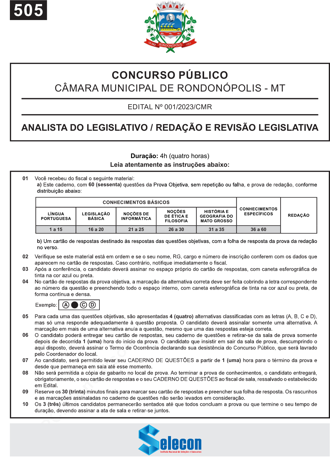 pcimarkpci MjgwNDowMTRkOjc4ZDM6NDlkZTo2OTcwOjcwNzI6ZjFiMjplMzQy:RnJpLCAyMiBOb3YgMjAyNCAwMDowMTo0NiAtMDMwMA== www.pciconcursos.com.br 01 a) 60 (sessenta) b) . 02 03 04 A C D 05 4 (quatro) 06 1 (uma) 07 1 (uma) 08 09 30 (trinta) 10 3 (três) EDITAL Nº 001/2023/CMR CONCURSO PÚBLICO CÂMARA MUNICIPAL DE RONDONÓPOLIS - MT Leia atentamente as instruções abaixo: Duração: 4h (quatro horas) CONHECIMENTOS BÁSICOS CONHECIMENTOS ESPECÍFICOS REDAÇÃOLÍNGUA PORTUGUESA LEGISLAÇÃO BÁSICA NOÇÕES DE INFORMÁTICA NOÇÕES DE ÉTICA E FILOSOFIA HISTÓRIA E GEOGRAFIA DO MATO GROSSO 1 a 15 16 a 20 21 a 25 26 a 30 31 a 35 36 a 60 ANALISTA DO LEGISLATIVO / REDAÇÃO E REVISÃO LEGISLATIVA 505 pcimarkpci MjgwNDowMTRkOjc4ZDM6NDlkZTo2OTcwOjcwNzI6ZjFiMjplMzQy:RnJpLCAyMiBOb3YgMjAyNCAwMDowMTo0NyAtMDMwMA== www.pciconcursos.com.br Leia o texto a seguir: Nasa adia missões para enviar astronautas à Lua Viagem à órbita do satélite passa para 2025 e tentativa de pouso, para 2026 das datas das próximas duas missões com astronautas à Lua. Ambas foram adiadas quase um ano para dar mais tempo às LÍNGUA PORTUGUESA 1. Folha de São Paulo Ciência 2. 3. Artemis 3: distintos 4. ciência essência anuência coerência 5. Com parceiros enfrentando para o mudança das datas das próximas duas missões com 6. Ambas foram adiadas quase um ano para dar mais tempo equipes da Artemis próximas duas missões com astronautas à Lua 7. foram enfrentados por nossos parceiros da 8. cápsula satélite proparoxítonas ANALISTA DO LEGISLATIVO / REDAÇÃO E REVISÃO LEGISLATIVA 2 pcimarkpci MjgwNDowMTRkOjc4ZDM6NDlkZTo2OTcwOjcwNzI6ZjFiMjplMzQy:RnJpLCAyMiBOb3YgMjAyNCAwMDowMTo0NyAtMDMwMA== www.pciconcursos.com.br 9. “A missão deve ser comandada por Reid Wiseman” (5.º parágrafo). Se a palavra destacada fosse empregada no plural, à luz da norma-padrão, a frase seria reescrita da seguinte forma: A) “As missões devem ser comandada por Reid Wiseman”. B) “As missões devem ser comandadas por Reid Wiseman”. C) “As missões devem serem comandada por Reid Wiseman”. D) “As missões devem serem comandadas por Reid Wiseman”. 10. Em “Os outros dois tripulantes são a engenheira elétrica Christina Koch e o mestrando em física Jeremy Hansen, o único canadense” (5.º parágrafo), há: A) uma única oração absoluta B) duas orações coordenadas C) três orações coordenadas D) quatro orações coordenadas 16. O Governo Municipal é gerido em conformidade com os princípios da administração pública explicitados na Constituição Federal, tanto na administração direta quanto na indireta. Além da é previsto expressamente, na Lei Orgânica de Rondonópolis que rege a gestão municipal, o princípio da: A) motivação B) especialidade C) participação popular D) presunção de legitimidade LEGISLAÇÃO BÁSICA 15. No título do texto (“Nasa adia missões para enviar astronautas à Lua”), se a palavra destacada fosse substituída por “Marte e Júpiter”, à luz da norma-padrão, a reescrita seria: A) Nasa adia missões para enviar astronautas à Marte e à Júpiter. B) Nasa adia missões para enviar astronautas a Marte e a Júpiter. C) Nasa adia missões para enviar astronautas a Marte e à Júpiter. D) Nasa adia missões para enviar astronautas à Marte e a Júpiter. 11. Em “Essa deve ser a primeira vez que quatro pessoas voam para o satélite. Nas missões do programa Apollo, eram três” (6º parágrafo), considerando o contexto, o verbo destacado foi empregado com um sentido análogo ao de: A) certeza B) conselho C) obrigação D) probabilidade 12. alunissagem no destacada. O termo indica: A) saída da lua B) pouso na lua C) alucinação na lua D) 13. Em “Caso horas para comer e descansar antes de iniciar uma série de experimentos” (8.º parágrafo), a palavra destacada, no texto, é um/uma: A) B) C) D) 14. Em “Durante as caminhadas no satélite, estão previstas captação de fotos e vídeos, pesquisa geológica e coleta de amostras” (9.º parágrafo), a palavra destacada faz referência à: A) lua B) Nasa C) D) Artemis 3 17. Mediante lei municipal, observada a legislação estadual, distrito político administrativo. As condições para que um território A) Plebiscito B) Lei Ordinária C) Decreto Municipal D) Lei Complementar 18. Na prática legislativa, uma moção é o instrumento utilizado para expressar a manifestação da Casa Legislativa em razão Regimento Interno da Câmara Municipal de Rondonópolis, moção é uma espécie de: B) Proposição C) Requerimento D) Ato normativo 19. Na organização da Câmara Legislativa, funcionam comissões permanentes e temporárias. Entre esses órgãos técnicos do Poder Legislativo, há o que tem como uma de suas destinações a apuração de infrações político-administrativas do Prefeito e dos Vereadores, no desempenho de suas funções e nos termos desempenhada pela Comissão: A) de Representação B) Especial de Inquérito C) de Investigação e Processante D) de Constituição, Justiça e Segurança Pública 20. Além do vencimento e da remuneração, poderá ser paga, ao funcionário do município, uma série de vantagens. Entre elas, A) indevida quando concedida ao funcionário que se afastou do cargo em virtude de mandato eletivo B) calculada sobre os proventos do funcionário, não podendo exceder a importância correspondente ao seu salário mensal C) destinada ao funcionário que, no interesse do serviço, passa a ter exercício fora da sede do município, com mudança de residência em caráter permanente D) obrigatoriamente exigível mediante restituição quando o nova localidade para o trabalho ANALISTA DO LEGISLATIVO / REDAÇÃO E REVISÃO LEGISLATIVA 3 pcimarkpci MjgwNDowMTRkOjc4ZDM6NDlkZTo2OTcwOjcwNzI6ZjFiMjplMzQy:RnJpLCAyMiBOb3YgMjAyNCAwMDowMTo0NyAtMDMwMA== www.pciconcursos.com.br 21. Um usuário de computador com o sistema operacional MS Windows 11 precisa acessar, de forma rápida, a funcionalidade de Snap Lay