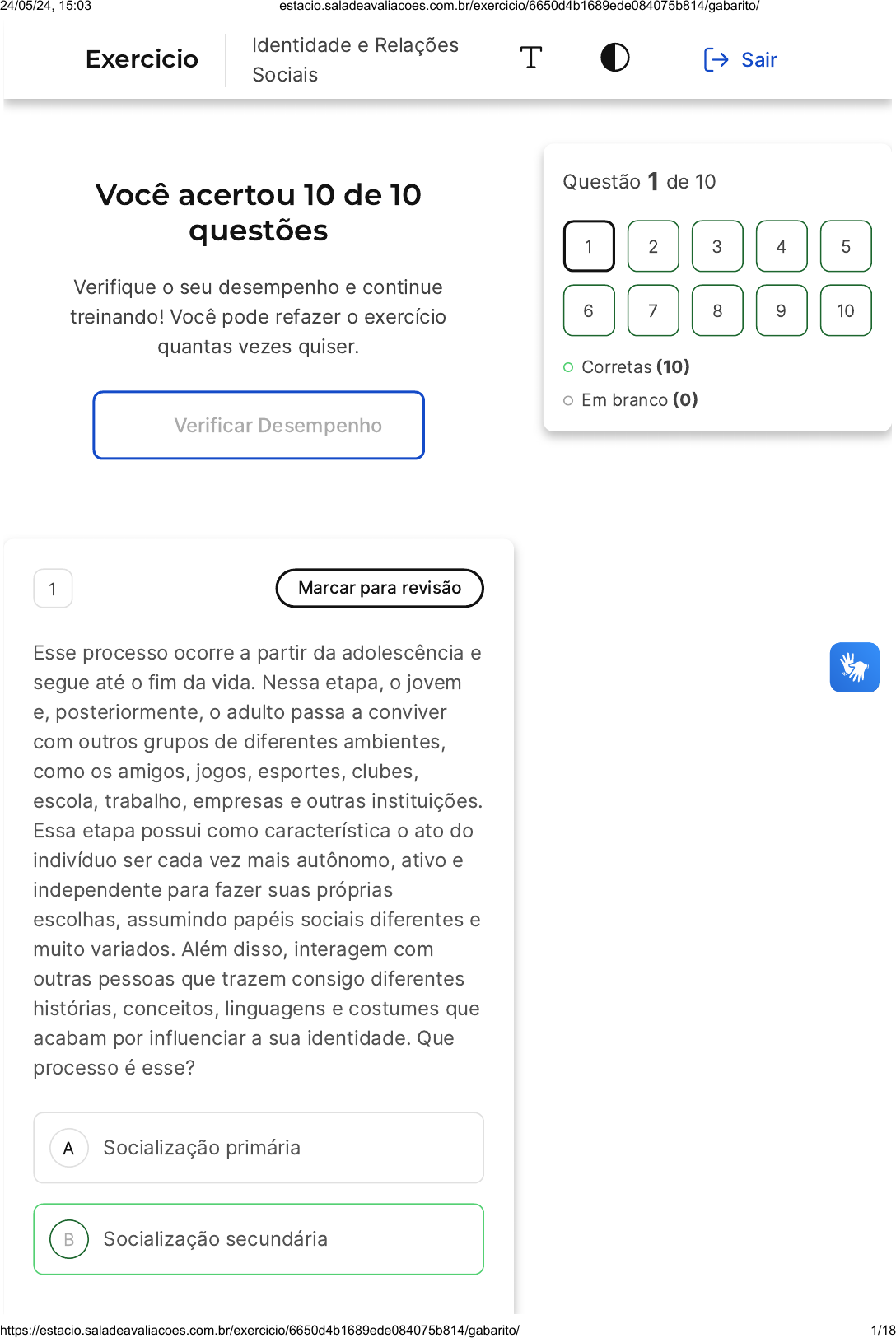 Você acertou 10 de 10 questões Verifique o seu desempenho e continue treinando! Você pode refazer o exercício quantas vezes quiser. Verificar Desempenho A B 1 Marcar para revisão Esse processo ocorre a partir da adolescência e segue até o fim da vida. Nessa etapa, o jovem e, posteriormente, o adulto passa a conviver com outros grupos de diferentes ambientes, como os amigos, jogos, esportes, clubes, escola, trabalho, empresas e outras instituições. Essa etapa possui como característica o ato do indivíduo ser cada vez mais autônomo, ativo e independente para fazer suas próprias escolhas, assumindo papéis sociais diferentes e muito variados. Além disso, interagem com outras pessoas que trazem consigo diferentes histórias, conceitos, linguagens e costumes que acabam por influenciar a sua identidade. Que processo é esse? Socialização primária Socialização secundária Questão 1 de 10 Corretas �10� Em branco �0� 1 2 3 4 5 6 7 8 9 10 Exercicio Identidade e Relações Sociais Sair 24/05/24, 15:03 estacio.saladeavaliacoes.com.br/exercicio/6650d4b1689ede084075b814/gabarito/ https://estacio.saladeavaliacoes.com.br/exercicio/6650d4b1689ede084075b814/gabarito/ 1/18 C D E Socialização terciária Subjetividade Identidade Resposta correta Parabéns, você selecionou a alternativa correta. Confira o gabarito comentado! Gabarito Comentado O processo descrito no enunciado é a socialização secundária. Esta ocorre a partir da adolescência e se estende até o fim da vida, sendo a etapa em que o indivíduo passa a conviver com diferentes grupos sociais, como amigos, colegas de trabalho, entre outros. Nesse processo, o indivíduo torna-se cada vez mais autônomo, ativo e independente, assumindo diferentes papéis sociais. A interação com pessoas de diferentes histórias, conceitos, linguagens e costumes influencia a formação da sua identidade. A socialização terciária não existe como conceito sociológico. A subjetividade refere-se à singularidade de cada indivíduo, enquanto a identidade é o conjunto de características e atributos que identificam um indivíduo. 2 Marcar para revisão 24/05/24, 15:03 estacio.saladeavaliacoes.com.br/exercicio/6650d4b1689ede084075b814/gabarito/ https://estacio.saladeavaliacoes.com.br/exercicio/6650d4b1689ede084075b814/gabarito/ 2/18 A B C D E A Constituição Federal de 1988 promoveu profundas mudanças na concepção do conceito família. Atualmente, o ambiente familiar, qualquer que seja sua composição, pode também ser considerado: Apenas um grupo constituído de pai, mãe e filho(s) que precisa passar por casamento civil e religioso. Um ambiente de violência, insegurança, regras e valores civilizatórios da cultura vigente, que devem ser transmitidos aos seus novos membros durante o processo de socialização. Um ambiente de coerção que se caracteriza pela opressão e ameaça de autoridades governamentais, que obrigam as pessoas a pensar e agir da maneira que elas acreditam ser a única correta e aceitável. Uma comunidade formada por indivíduos unidos por laços naturais, afinidades e afetividade ou por vontade expressa, que vivem em uma unidade doméstica. Um ambiente de alienação onde um grupo menor ou menos poderoso tem suas crenças, valores e visão de mundo destituída ou substituída. 24/05/24, 15:03 estacio.saladeavaliacoes.com.br/exercicio/6650d4b1689ede084075b814/gabarito/ https://estacio.saladeavaliacoes.com.br/exercicio/6650d4b1689ede084075b814/gabarito/ 3/18 Resposta correta Parabéns, você selecionou a alternativa correta. Confira o gabarito comentado! Gabarito Comentado A Constituição Federal de 1988 ampliou a concepção de família, que antes era restrita a um grupo constituído de pai, mãe e filho(s) que precisava passar por casamento civil e religioso. Atualmente, a família pode ser compreendida como uma comunidade formada por indivíduos unidos por laços naturais, afinidades e afetividade ou por vontade expressa, que vivem em uma unidade doméstica. Isso significa que a família não é apenas um grupo de pessoas unidas por laços de sangue ou casamento, mas também por laços de afeto e vontade expressa. Portanto, a alternativa D é a correta, pois reflete essa concepção ampliada de família. As outras alternativas apresentam concepções equivocadas ou limitadas do que é uma família, associando-a a ambientes de violência, coerção ou alienação, o que não condiz com a realidade e a diversidade das famílias na sociedade contemporânea. 3 Marcar para revisão Essas são ações coletivas de um grupo social organizado que busca ou a manutenção ou algumas transformações na sociedade, como alteração das políticas públicas. Estamos falando de: 24/05/24, 15:03 estacio.saladeavaliacoes.com.br/exercicio/6650d4b1689ede084075b814/gabarito/ https://estacio.saladeavaliacoes.com.br/exercicio/6650d4b1689ede084075b814/gabarito/ 4/18 A B C D E Família Identidade Movimentos sociais Família informal Ideologia Resposta correta Parabéns, você selecionou a alternativa correta. Confira o gabarito comentado! Gabarito Comentado A questão se refere a ações coletivas de um grupo social organizado que busca manter ou transformar aspectos da sociedade, incluindo a alteração de políticas públicas. Essa descrição se encaixa perfeitamente na definição de movimentos sociais. A alternativa A, "Família", é uma instituição social, mas não se enquadra na descrição dada, pois não busca necessariamente a manutenção ou transformação da sociedade como um todo. A alternativa B, "Identidade", é um conjunto de conceitos que definem um indivíduo, mas não se refere a ações coletivas para mudança social. A alternativa D, "Família informal", não é um termo comumente usado para descrever ações coletivas de mudança social. A alternativa E, "Ideologia", é um conjunto de ideias, crenças e valores que orientam a 24/05/24, 15:03 estacio.saladeavaliacoes.com.br/exercicio/6650d4b1689ede084