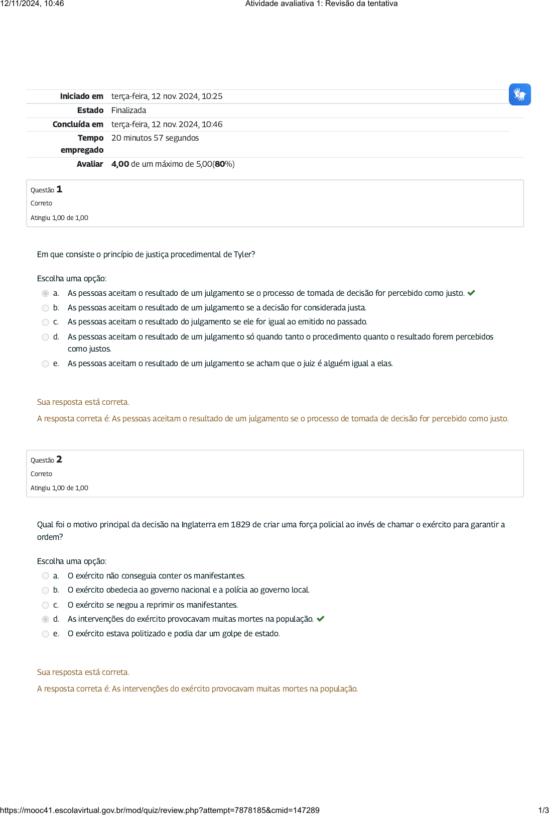 Iniciado em terça-feira, 12 nov. 2024, 10:25 Estado Finalizada Concluída em terça-feira, 12 nov. 2024, 10:46 Tempo empregado 20 minutos 57 segundos Avaliar 4,00 de um máximo de 5,00(80%) Questão 1 Correto Atingiu 1,00 de 1,00 Questão 2 Correto Atingiu 1,00 de 1,00 Em que consiste o princípio de justiça procedimental de Tyler? Escolha uma opção: a. As pessoas aceitam o resultado de um julgamento se o processo de tomada de decisão for percebido como justo. b. As pessoas aceitam o resultado de um julgamento se a decisão for considerada justa. c. As pessoas aceitam o resultado do julgamento se ele for igual ao emitido no passado. d. As pessoas aceitam o resultado de um julgamento só quando tanto o procedimento quanto o resultado forem percebidos como justos. e. As pessoas aceitam o resultado de um julgamento se acham que o juiz é alguém igual a elas. Sua resposta está correta. A resposta correta é: As pessoas aceitam o resultado de um julgamento se o processo de tomada de decisão for percebido como justo. Qual foi o motivo principal da decisão na Inglaterra em 1829 de criar uma força policial ao invés de chamar o exército para garantir a ordem? Escolha uma opção: a. O exército não conseguia conter os manifestantes. b. O exército obedecia ao governo nacional e a polícia ao governo local. c. O exército se negou a reprimir os manifestantes. d. As intervenções do exército provocavam muitas mortes na população. e. O exército estava politizado e podia dar um golpe de estado. Sua resposta está correta. A resposta correta é: As intervenções do exército provocavam muitas mortes na população. 12/11/2024, 10:46 Atividade avaliativa 1: Revisão da tentativa https://mooc41.escolavirtual.gov.br/mod/quiz/review.php?attempt=7878185&cmid=147289 1/3 Questão 3 Correto Atingiu 1,00 de 1,00 Questão 4 Incorreto Atingiu 0,00 de 1,00 Questão 5 Correto Atingiu 1,00 de 1,00 O “Tenente Geral de Polícia” na França no século XVII... Escolha uma opção: a. Podia ditar normas e aplicar sanções, mas só para os crimes mais graves. b. Podia ditar normas, mas não aplicar sanções. c. Não podia ditar normas nem aplicar sanções. d. Podia ditar normas e aplicar sanções, mas só para os crimes menos graves. e. Podia aplicar sanções, mas não ditar normas. Sua resposta está correta. A resposta correta é: Podia ditar normas e aplicar sanções, mas só para os crimes menos graves. A polícia moderna: Escolha uma opção: a. Não pode criar normas nem aplicar sanções. b. Pode criar normas só em determinadas circunstâncias. c. Pode aplicar sanções, mas não criar normas. d. Pode aplicar sanções só em determinadas circunstâncias. e. Pode criar normas e aplicar sanções. Sua resposta está incorreta. A resposta correta é: Não pode criar normas nem aplicar sanções. O que signi�ca o conceito de “policiamento por consentimento” que inspira a polícia britânica? Escolha uma opção: a. Que a lei que criou a polícia deve ter sido aprovada democraticamente. b. Que a polícia precisa de apoio e aceitação popular para fazer o seu trabalho. c. Que os transgressores devem ser obrigados a cumprir a lei. d. Que os cidadãos precisam sustentar o regime político. e. Que a polícia só pode intervir se todos os envolvidos num incidente estiverem de acordo. Sua resposta está correta. A resposta correta é: Que a polícia precisa de apoio e aceitação popular para fazer o seu trabalho. 12/11/2024, 10:46 Atividade avaliativa 1: Revisão da tentativa https://mooc41.escolavirtual.gov.br/mod/quiz/review.php?attempt=7878185&cmid=147289 2/3 12/11/2024, 10:46 Atividade avaliativa 1: Revisão da tentativa https://mooc41.escolavirtual.gov.br/mod/quiz/review.php?attempt=7878185&cmid=147289 3/3