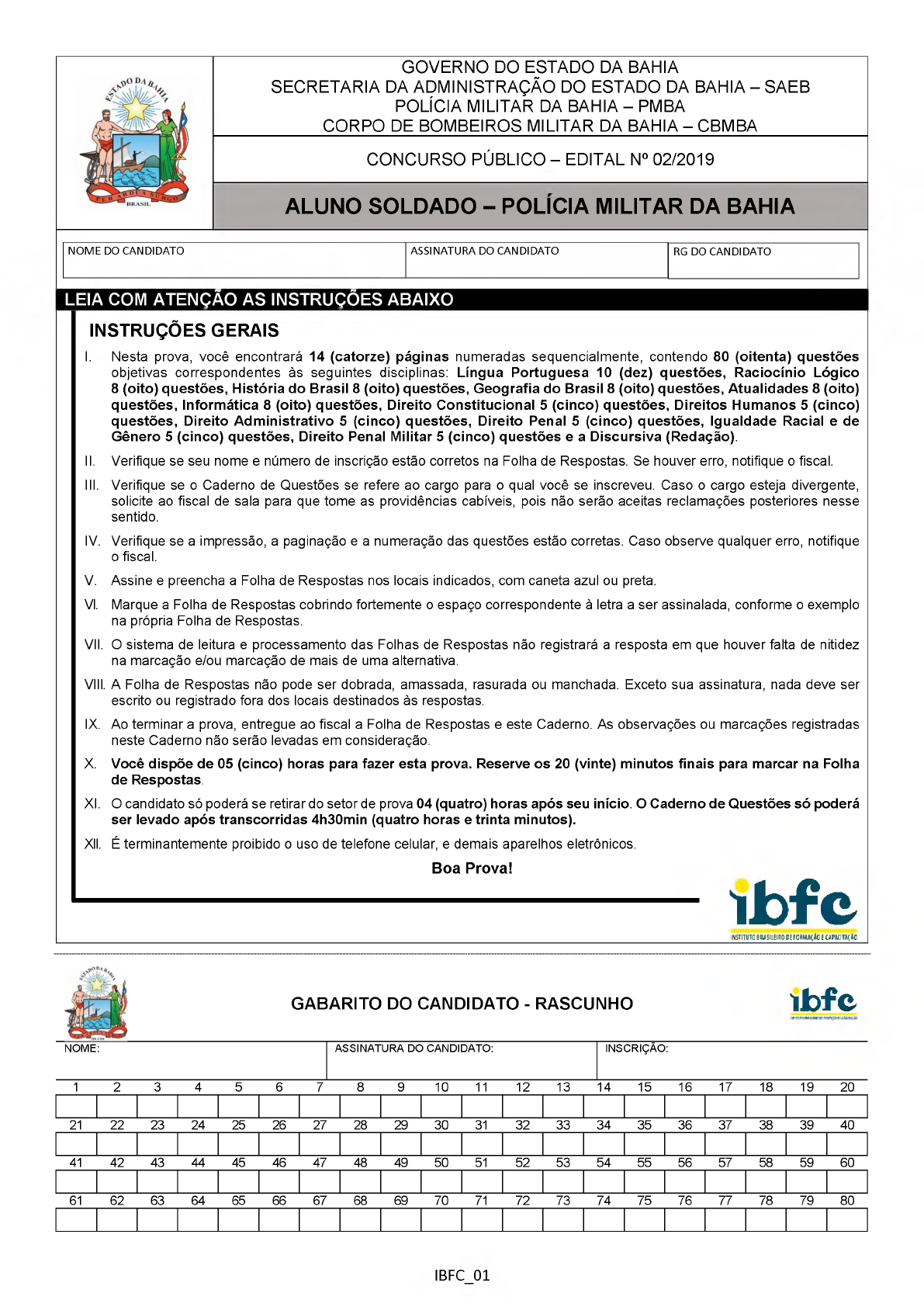 GOVERNO DO ESTADO DA BAHIA SECRETARIA DA ADMINISTRAÇÃO DO ESTADO DA BAHIA - SAEB POLÍCIA MILITAR DA BAHIA - PMBA CORPO DE BOMBEIROS MILITAR DA BAHIA - CBMBA CONCURSO PÚBLICO - EDITAL N° 02/2019 ALUNO SOLDADO - POLICIA MILITAR DA BAHIA NOME DO CANDIDATO ASSINATURA DO CANDIDATO RG DO CANDIDATO LEIA COM ATENÇÃO AS INSTRUÇÕES ABAIXO INSTRUÇÕES GERAIS I. Nesta prova, você encontrará 14 (catorze) páginas numeradas sequencialmente, contendo 80 (oitenta) questões objetivas correspondentes às seguintes disciplinas: Língua Portuguesa 10 (dez) questões, Raciocínio Lógico 8 (oito) questões, História do Brasil 8 (oito) questões, Geografia do Brasil 8 (oito) questões, Atualidades 8 (oito) questões, Informática 8 (oito) questões, Direito Constitucional 5 (cinco) questões, Direitos Humanos 5 (cinco) questões, Direito Administrativo 5 (cinco) questões, Direito Penal 5 (cinco) questões, Igualdade Racial e de Gênero 5 (cinco) questões, Direito Penal Militar 5 (cinco) questões e a Discursiva (Redação). II. Verifique se seu nome e número de inscrição estão corretos na Folha de Respostas. Se houver erro, notifique o fiscal. III. Verifique se o Caderno de Questões se refere ao cargo para o qual você se inscreveu. Caso o cargo esteja divergente, solicite ao fiscal de sala para que tome as providências cabíveis, pois não serão aceitas reclamações posteriores nesse sentido. IV. Verifique se a impressão, a paginação e a numeração das questões estão corretas. Caso observe qualquer erro, notifique o fiscal. V. Assine e preencha a Folha de Respostas nos locais indicados, com caneta azul ou preta. VI. Marque a Folha de Respostas cobrindo fortemente o espaço correspondente à letra a ser assinalada, conforme o exemplo na própria Folha de Respostas. VII. O sistema de leitura e processamento das Folhas de Respostas não registrará a resposta em que houver falta de nitidez na marcação e/ou marcação de mais de uma alternativa. VIII. A Folha de Respostas não pode ser dobrada, amassada, rasurada ou manchada. Exceto sua assinatura, nada deve ser escrito ou registrado fora dos locais destinados às respostas. IX. Ao terminar a prova, entregue ao fiscal a Folha de Respostas e este Caderno. As observações ou marcações registradas neste Caderno não serão levadas em consideração. X. Você dispõe de 05 (cinco) horas para fazer esta prova. Reserve os 20 (vinte) minutos finais para marcar na Folha de Respostas. XI. O candidato só poderá se retirar do setor de prova 04 (quatro) horas após seu início. O Caderno de Questões só poderá ser levado após transcorridas 4h30min (quatro horas e trinta minutos). XII. É terminantemente proibido o uso de telefone celular, e demais aparelhos eletrônicos. Boa Prova! ------------------------------ibfc _ _ _ _ _ _ _ _ _ _ _ _ _ _ _ _ _ _ _ _ _ _ _ _ _ _ _ _ _ _ _ _ _ _ _ _ _ _ _ _ _ _ _ _ _ _ _ _ _ _ _ _ _ _ _ _ _ _ _ _ _ _ _ _ _ _ _ _ _ _ _ _ _ _ _ _ _ _ _ _ _ _ _ _ _ _ _ _ _ _ _ _ _ _ _ _ _ _ _ _ _ _ _ _ _ _ _ _ _ _ _ _ _ _ _ _ _ _ _ _ _ _ _ _ _ _ _ _ _ _ _ _ _ _ _ _ _ _ _ _ _ _ _ _ _ _ _ _ _ _ _ _ _ _ _ _ _ _ _ _ _ _ _ _ _ _ _ _ _ _ _ _ _ _ _ _ _ _ _ _ _ _ _ _ _ _ _ _ _ _ INSTITUTO BRASILEIRO DE FORMAÇÃO E CAPACITARÃO GABARITO DO CANDIDATO - RASCUNHO íbfc N O M E: A S S IN A T U R A D O C A N D ID A T O : IN S C R IÇ Ã O : 1 2 3 4 5 6 7 8 9 10 11 12 13 14 15 16 17 18 19 20 21 22 23 24 25 26 27 28 29 30 31 32 33 34 35 36 37 38 39 40 41 42 43 44 45 46 47 48 49 50 51 52 53 54 55 56 57 58 59 60 61 62 63 64 65 66 67 68 69 70 71 72 73 74 75 76 77 78 79 80 IBFC 01 RASCUNHO íb fc ______________ LÍNGUA PORTUGUESA______________ Leia o texto abaixo para responder às questões de 1 a 7. Segurança O ponto de venda mais forte do condomínio era a sua segurança. Havia as mais belas casas, os jardins, os playgrounds, as piscinas, mas havia, acima de tudo, segurança. Toda a área era cercada por um muro alto. Havia um portão principal com muitos guardas que controlavam tudo por um circuito fechado de TV. Só entravam no condomínio os proprietários e visitantes devidamente identificados e crachados. Mas os assaltos começaram assim mesmo. Os ladrões pulavam os muros. Os condôminos decidiram colocar torres com guardas ao longo do muro alto. Nos quatro lados. [...] Agora não só os visitantes eram obrigados a usar crachá. Os proprietários e seus familiares também. Não passava ninguém pelo portão sem se identificar para a guarda. Nem as babás. Nem os bebês. Mas os assaltos continuaram. Decidiram eletrificar os muros. Houve protestos, mas no fim todos concordaram. O mais importante era a segurança. Quem tocasse no fio de alta tensão em cima do muro morreria eletrocutado. Se não morresse, atrairia para o local um batalhão de guardas com ordens de atirar para matar. Mas os assaltos continuaram. Grades nas janelas de todas as casas. Era o jeito. Mesmo se os ladrões ultrapassassem os altos muros, [...] não conseguiriam entrar nas casas. Todas as janelas foram engradadas. Mas os assaltos continuaram. Foi feito um apelo para que as pessoas saíssem de casa o mínimo possível. Dois assaltantes tinham entrado no condomínio no banco de trás do carro de um proprietário, com um revólver apontado para a sua nuca. Assaltaram a casa, depois saíram no carro roubado, com crachás roubados. [...] Foi reforçada a guarda. Construíram uma terceira cerca. As famílias de mais posses, com mais coisas para serem roubadas, mudaram-se para uma chamada área de segurança máxima. E foi tomada uma medida extrema. Ninguém pode entrar no condomínio. Ninguém. Visitas, só num local predeterminado pela guarda, sob sua severa vigilância e por curtos períodos. E ninguém pode sair. Agora, a segurança é completa. Não tem havido mais assaltos. Ninguém precisa temer pelo seu patrimônio. Os ladrões que passam pela calçada só conseguem espiar através do grande portão de ferro e talvez avistar um ou outro condômino agarra