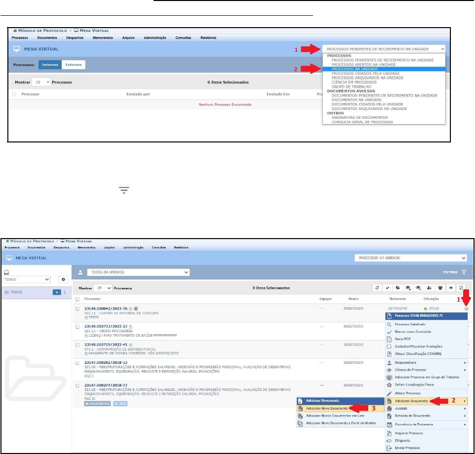 TUTORIAL SIPAC - ADICIONAR E ASSINAR DOCUMENTOS EM PROCESSO 1. No ambiente MESA VIRTUAL, acesse a caixa de opções no canto superior direito e selecione “PROCESSOS NA UNIDADE”. Via de regra, para adicionar documento(s) a um processo é necessário que este tenha sido previamente recebido na unidade (Figura 1). Figura 1 2. Clique no símbolo localizado no canto direito da opção correspondente ao processo desejado e, posteriormente, clique em Adicionar Documento > Adicionar Novo Documento (Figura 2). Figura 2 3. Após preencher os campos do documento, redija seu conteúdo no editor, u lizando a opção Escrever Documento ou insira o arquivo digital u lizando a opção Anexar Documento Digital. Após isso, clique em Adicionar Documento, conforme imagens abaixo (Figuras 3 e 4). Figura 3 Figura 4 4. Uma vez adicionado(s) o(s) documento(s), será possível visualizá-lo(s) listado(s) na sequência de documentos no processo. Neste momento é possível selecionar um ou mais documentos inseridos para a adição de um ou mais assinantes, clicando no botão Adicionar Assinante. (Figura 5). Figura 5 5. A imagem abaixo apresenta as opções de assinantes que poderão ser inseridos. Nesse caso, u lizamos somente o “Minha Assinatura”, que trata-se da assinatura do usuário que es ver inserindo o documento (Figura 6). Figura 6 6. Após adicionar o(s) assinante(s), o documento passa a apresentar o(s) ícone(s) do(s) assinante (s) com um pequeno círculo amarelo, representando que o documento está pendente de assinatura. Ao passar o mouse sobre o ícone, é possível visualizar os dados do assinante (Figura 7). Nesse ponto também é possível remover o(s) assinante(s) ao clicar no ícone , visualizar o conteúdo do documento selecionando o ícone , ou remover o documento através do ícone (Figura 7). Estando de acordo, clique em “Assinar”. Figura 7 7. Ao clicar em “Assinar”, o sistema abrirá uma nova janela para que seja informada a função do assinante. Clique no símbolo verde sinalizado na imagem abaixo e depois no outro símbolo verde referente à função desejada dentre as que irão aparecer, caso tenha mais de uma (Figuras 8 e 9). Figura 8 Figura 9 8. Feito isso, aparecerá a mensagem “Função selecionada com sucesso” no topo da página. Insira sua senha e, posteriormente, clique em Confirmar (Figura 10). Figura 10 9. Assinado o documento, é possível visualizar que agora o pequeno círculo estará verde. Estando tudo de acordo, clique em Finalizar. (Figura 11). Figura 11 10. Finalizado o procedimento de assinatura, é possível ver que o documento já estará de fato inserido no processo e outras opções se apresentarão para dar prosseguimento. (Figura 12). Figura 12 IMPORTANTE: Para assinatura de documentos adicionados em lote, o procedimento será o mesmo depois de inseridos os documentos desejados. Fim! Em caso de dúvidas, entre em contato com o setor responsável pelas funções de protocolo em sua Unidade.