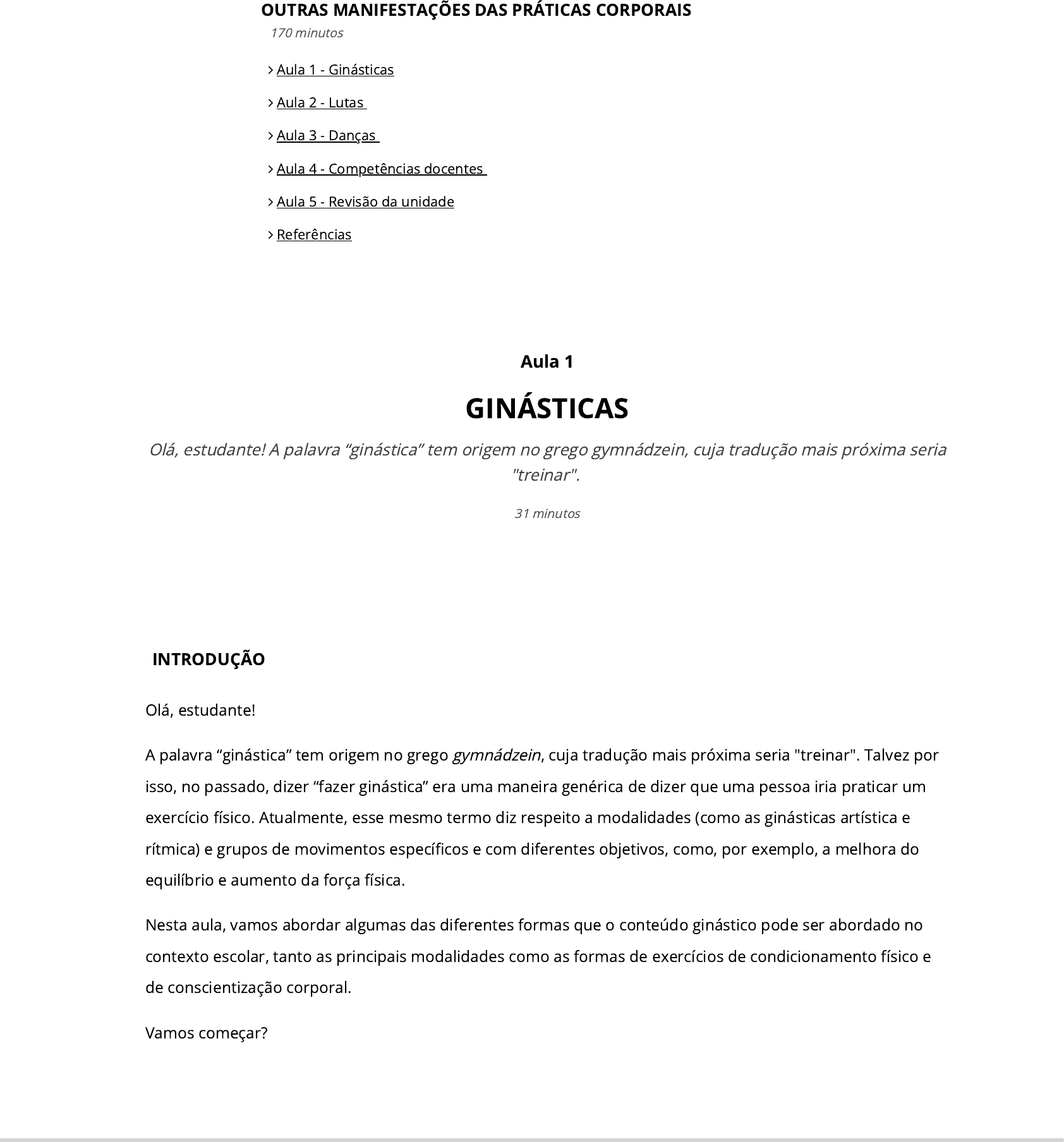 INTRODUÇÃO Olá, estudante! A palavra “ginástica” tem origem no grego gymnádzein, cuja tradução mais próxima seria "treinar". Talvez por isso, no passado, dizer “fazer ginástica” era uma maneira genérica de dizer que uma pessoa iria praticar um exercício físico. Atualmente, esse mesmo termo diz respeito a modalidades (como as ginásticas artística e rítmica) e grupos de movimentos especí�cos e com diferentes objetivos, como, por exemplo, a melhora do equilíbrio e aumento da força física. Nesta aula, vamos abordar algumas das diferentes formas que o conteúdo ginástico pode ser abordado no contexto escolar, tanto as principais modalidades como as formas de exercícios de condicionamento físico e de conscientização corporal. Vamos começar? Aula 1 GINÁSTICAS Olá, estudante! A palavra “ginástica” tem origem no grego gymnádzein, cuja tradução mais próxima seria "treinar". 31 minutos OUTRAS MANIFESTAÇÕES DAS PRÁTICAS CORPORAIS Aula 1 - Ginásticas Aula 2 - Lutas Aula 3 - Danças Aula 4 - Competências docentes Aula 5 - Revisão da unidade Referências 170 minutos MOVIMENTO GINÁSTICO EUROPEU Os PCNs (Parâmetros Curriculares Nacionais) da Educação Física é um documento considerável que auxilia professores a pensarem o ensino dos conteúdos, sejam eles procedimentais, conceituais ou atitudinais das diferentes manifestações da cultura corporal de movimento (danças, ginásticas, lutas, brincadeiras, jogos e esportes), no Ensino Fundamental e Médio. A ginástica, com suas diversas características, está presente em nossa sociedade, mídia, práticas discursivas, ginásios, clubes, diversos eventos esportivos e escolas de diversas formas. Partindo dessa premissa, compreende-se que é fundamental que os alunos possam conhecer, vivenciar e expressar as possibilidades da ginástica na escola. No âmbito conceitual, podemos apresentar aos alunos, através de aulas expositivas, a história, as principais competições, os atletas brasileiros e estrangeiros que mais se destacam, os principais aparelhos, os fundamentos e as capacidades físicas envolvidas na prática dessa modalidade. As três principais modalidades de ginásticas que podem ser abordadas em uma aula de Educação Física são a acrobática, artística e rítmica. Em princípio, pode ser explicado aos alunos o que são os esportes técnico- combinatórios de forma generalizada e, em seguida, abordar as modalidades de maneira especí�ca, levando em consideração as principais características de cada uma delas. Ginástica acrobática - o conteúdo da ginástica acrobática irá promover o contato físico entre os estudantes, para que seja possível trabalhar com técnicas especí�cas. Por isso, faz-se necessária a atenção redobrada do professor, para que não haja desrespeito entre as pessoas, evitando situações desconfortáveis e até mesmo de assédio. Serão demonstrados exemplos pelo professor e colocados em prática, como, por exemplo, a elaboração de uma “pirâmide humana” que pode ser somente feminina, somente masculina ou mista. Força, agilidade, equilíbrio e estabilidade são características fundamentais exigidas dos ginastas acrobatas pela modalidade. Ginástica artística - experimentar diferentes elementos da ginástica, como equilíbrio, saltos, giros, rotações e acrobacias. Vivenciar práticas da ginástica geral individualmente e em pequenos grupos. Através da exibição de vídeos pode-se mostrar aos alunos os principais nomes brasileiros no esporte, como Rebeca Andrade e Dayane dos Santos. Ginástica rítmica – o professor poderá levar os alunos a identi�car os principais aparelhos da modalidade, como a corda, o arco, as maças e a �ta. Alguns deles podem ser improvisados para que os alunos experimentem movimentos como lançar e recuperar, além de realizar movimentos circulares, giros e piruetas com os aparelhos. Por sua vez, deixando o caráter competitivo de lado, a ginástica de condicionamento físico também pode ser abordada nas aulas de Educação Física Escolar, uma vez que podemos traçar o paralelo do termo ginástica (que no passado se referia a qualquer tipo de exercício) com as práticas atuais de exercícios físicos nas academias. Pode-se apresentar os benefícios, capacidades físicas desenvolvidas e as principais características das práticas de musculação, spinning, zumba, cross�t, entre outras ginásticas contemporâneas que visam o condicionamento físico, saúde e estética. Em contraste à ginástica de condicionamento físico estão as ginásticas de conscientização corporal, popularmente conhecidas como ginásticas alternativas. Essas ginásticas possuem como principais características: a suavidade – movimentos leves e lentos; o holístico – visualizar e exercitar o ser humano como um todo e não somente as partes do corpo; e o lúdico – utilizar situações divertidas para se exercitar (como nas aulas de artes circenses). Essas ginásticas também fazem parte do currículo escolar e podem servir de base para re�exões sobre o motivo de podermos utilizar essas outras formas de se exercitar e, na prática, os alunos vivenciarem aulas mais relaxantes em contraste com as aulas quase sempre agitadas do cotidiano escolar. GINÁSTICAS DE CONDICIONAMENTO FÍSICO Na história da Educação Física no Brasil, a prática da ginástica já serviu como instrumento para higienizar e moralizar a população preparando indivíduos fortes para a guerra, educando e disciplinando os corpos que serviriam ao modelo econômico-industrial em ascensão (já que as longas jornadas de trabalho e as péssimas condições exigiam e/ou cobravam pessoas fortes e resistentes). Atualmente, ao analisar o âmbito esportivo, temos principalmente a ginástica rítmica (GR) e a ginástica artística (GA). Ambas aparecem tanto no currículo do Ensino Fundamental como no do Ensino Médio e podem ser adaptadas para prática escolar. A G