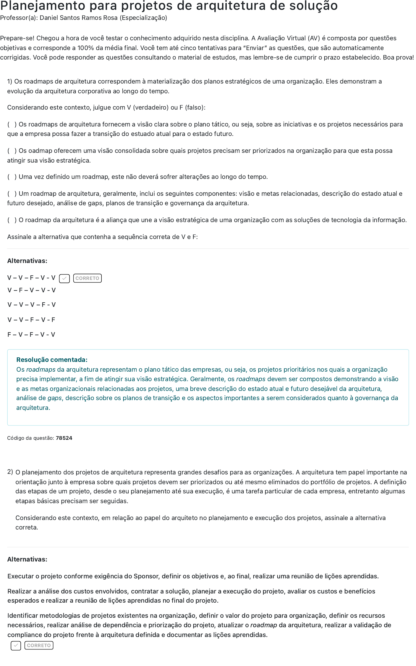 Planejamento para projetos de arquitetura de solução Professor(a): Daniel Santos Ramos Rosa (Especialização) 1) 2) Prepare-se! Chegou a hora de você testar o conhecimento adquirido nesta disciplina. A Avaliação Virtual (AV) é composta por questões objetivas e corresponde a 100% da média final. Você tem até cinco tentativas para “Enviar” as questões, que são automaticamente corrigidas. Você pode responder as questões consultando o material de estudos, mas lembre-se de cumprir o prazo estabelecido. Boa prova! Os roadmaps de arquitetura correspondem à materialização dos planos estratégicos de uma organização. Eles demonstram a evolução da arquitetura corporativa ao longo do tempo. Considerando este contexto, julgue com V (verdadeiro) ou F (falso): ( ) Os roadmaps de arquitetura fornecem a visão clara sobre o plano tático, ou seja, sobre as iniciativas e os projetos necessários para que a empresa possa fazer a transição do estuado atual para o estado futuro. ( ) Os oadmap oferecem uma visão consolidada sobre quais projetos precisam ser priorizados na organização para que esta possa atingir sua visão estratégica. ( ) Uma vez definido um roadmap, este não deverá sofrer alterações ao longo do tempo. ( ) Um roadmap de arquitetura, geralmente, inclui os seguintes componentes: visão e metas relacionadas, descrição do estado atual e futuro desejado, análise de gaps, planos de transição e governança da arquitetura. ( ) O roadmap da arquitetura é a aliança que une a visão estratégica de uma organização com as soluções de tecnologia da informação. Assinale a alternativa que contenha a sequência correta de V e F: Alternativas: V – V – F – V - V CORRETO V – F – V – V - V V – V – V – F - V V – V – F – V - F F – V – F – V - V Código da questão: 78524 O planejamento dos projetos de arquitetura representa grandes desafios para as organizações. A arquitetura tem papel importante na orientação junto à empresa sobre quais projetos devem ser priorizados ou até mesmo eliminados do portfólio de projetos. A definição das etapas de um projeto, desde o seu planejamento até sua execução, é uma tarefa particular de cada empresa, entretanto algumas etapas básicas precisam ser seguidas. Considerando este contexto, em relação ao papel do arquiteto no planejamento e execução dos projetos, assinale a alternativa correta. Alternativas: Executar o projeto conforme exigência do Sponsor, definir os objetivos e, ao final, realizar uma reunião de lições aprendidas. Realizar a análise dos custos envolvidos, contratar a solução, planejar a execução do projeto, avaliar os custos e benefícios esperados e realizar a reunião de lições aprendidas no final do projeto. Identificar metodologias de projetos existentes na organização, definir o valor do projeto para organização, definir os recursos necessários, realizar análise de dependência e priorização do projeto, atualizar o roadmap da arquitetura, realizar a validação de compliance do projeto frente à arquitetura definida e documentar as lições aprendidas. CORRETO Resolução comentada: Os roadmaps da arquitetura representam o plano tático das empresas, ou seja, os projetos prioritários nos quais a organização precisa implementar, a fim de atingir sua visão estratégica. Geralmente, os roadmaps devem ser compostos demonstrando a visão e as metas organizacionais relacionadas aos projetos, uma breve descrição do estado atual e futuro desejável da arquitetura, análise de gaps, descrição sobre os planos de transição e os aspectos importantes a serem considerados quanto à governança da arquitetura. 3) Identificar os stakeholders e suas preocupações, levantar os principais requisitos, definir a solução a ser implementada, executar o projeto e documentar os problemas ocorridos ao longo do projeto. Planejar a execução do projeto considerando as etapas e os prazos, realizar a execução de acordo com o planejamento e encerrar o projeto avaliando os custos que foram realizados. Código da questão: 78521 Os frameworks de arquitetura possibilitam uma análise padronizada sobre as necessidades estratégicas de uma organização, assim como ajudam na padronização das entregas que são realizadas pelas equipes de arquitetura. Atualmente, existem diversas ferramentas que possibilitam a modelagem da arquitetura e o armazenamento dos artefatos produzidos pelos arquitetos. Fazer arquitetura corporativa sem a adoção de ferramentas é possível, entretanto poderá não ser eficaz, podendo deixar lacunas em relação à análise, aos impactos e à compreensão sobre todos os componentes necessários para a construção de uma nova solução. Sobre os riscos envolvidos na modelagem das arquiteturas sem o uso de uma ferramenta, analise as afirmativas a seguir e assinale- as com V (verdadeiro) ou F (falso): ( ) Ao documentarmos toda arquitetura utilizando apenas documentos, como planilhas, ferramentas de desenho de diagramas, documentos Word e apresentações, corremos o risco de perder a rastreabilidade, ou seja, a clareza quanto à integração de todos os componentes de uma organização necessários ou impactados pelo projeto de arquitetura. ( ) Documentos, geralmente, são frios, então mantê-los atualizados poderá representar um esforço grande por parte do time de arquitetura. ( ) Ao utilizarmos documentos como produto final da arquitetura, corremos riscos em relação à capacidade de reutilização desses artefatos. Um documento que representa um diagrama de processo de negócio poderá estar desatualizado, gerando, a cada novo projeto de arquitetura, a necessidade de redesenhar o processo de negócio afetado. ( ) Seria possível implementar rastreabilidade entre os componentes de uma organização adotando um padrão de nomeação para todos os arquivos produzidos pelo time de arquitetura. ( ) Através do uso de uma ferramenta de arquit