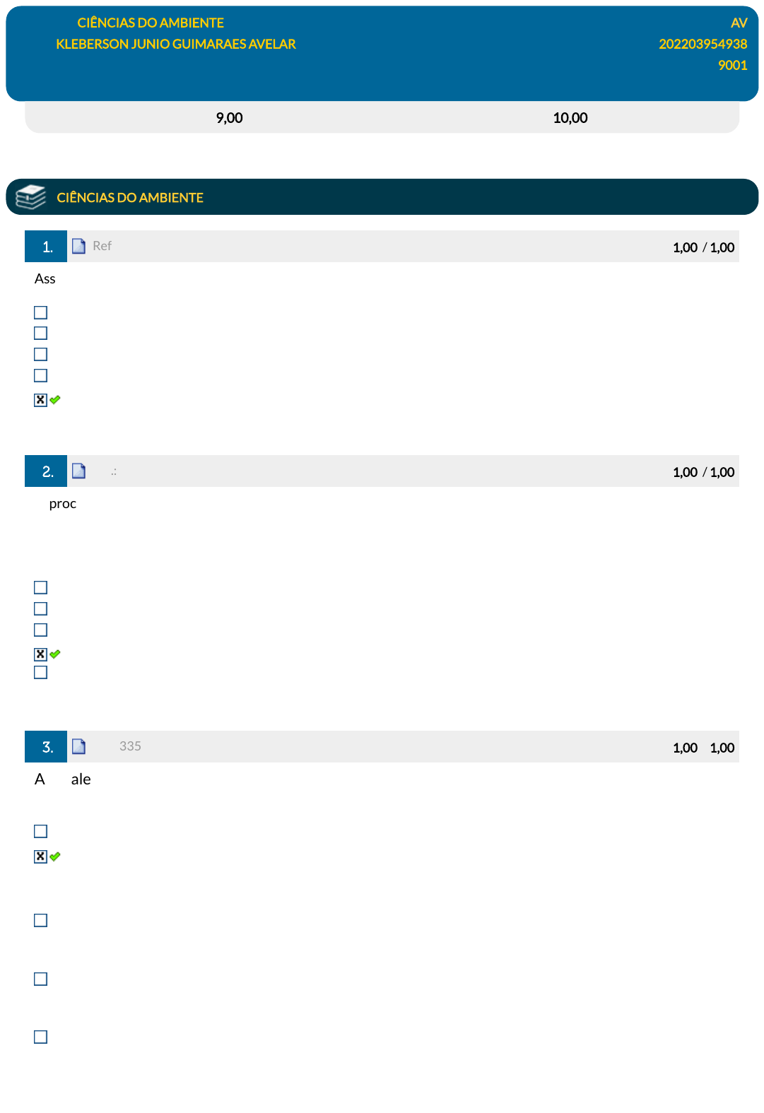 22/11/2024, 17:35 EPS https://simulado.estacio.br/alunos/ 1/3 Disciplina: CIÊNCIAS DO AMBIENTE AV Aluno: KLEBERSON JUNIO GUIMARAES AVELAR 202203954938 Turma: 9001 CCE1797_AV_202203954938 (AG) 15/06/2022 17:38:27 (F) Avaliação: 9,00 pts Nota SIA: 10,00 pts CIÊNCIAS DO AMBIENTE 1. Ref.: 3351977 Pontos: 1,00 / 1,00 Assinale a alternativa que contém as análises realizadas para o estudo das estruturas presentes no planeta. Angular, cinemática e dinâmica. Geométrica, cinemática e mnemônica. Geométrica, cinética e dinâmica. Geométrica, cinética e mnemônica. Geométrica, cinemática e dinâmica. 2. Ref.: 3564214 Pontos: 1,00 / 1,00 O processo de desagregação e remoção de partículas do solo ou de fragmentos de rochas, pela ação combinada da gravidade com a água, vento, gelo, vegetação e ação antrópica. Essa desagregação, causa desgaste na superfície terrestre, transporte e deposição de sedimentos nos leitos dos cursos de água e depressões. Essas características se referem a: Pedologia. Climatologia. Zona eutró�ca. Erosão. Altitude. 3. Ref.: 3352225 Pontos: 1,00 / 1,00 Assinale a alternativa incorreta quanto às características das camadas que compõem a atmosfera terrestre. A exosfera não possui delimitação exata, sendo a última camada atmosférica. A camada de ozônio (O3) concentra-se na termosfera e protege o planeta dos raios nocivos do sol, porém, em decorrência da emissão crescente de CO2 pelas sociedades modernas, abriram-se buracos enormes nessa camada, permitindo a entrada de tais raios. A mesosfera estende-se da estratosfera a até, aproximadamente, 80 quilômetros acima do nível do mar. É a faixa mais fria, porque nela não há nuvens nem gases capazes de absorver a energia do Sol. A troposfera é a camada mais baixa da atmosfera, onde ocorrem os principais fenômenos meteorológicos, tais como tempestades, chuvas, precipitações de neve ou granizo e formação de geadas. O efeito estufa é um fenômeno natural que mantém o planeta aquecido nos limites de temperatura necessários para a manutenção da vida. javascript:alert('C%C3%B3digo da quest%C3%A3o: 3351977.'); javascript:alert('C%C3%B3digo da quest%C3%A3o: 3564214.'); javascript:alert('C%C3%B3digo da quest%C3%A3o: 3352225.'); 22/11/2024, 17:35 EPS https://simulado.estacio.br/alunos/ 2/3 4. Ref.: 606132 Pontos: 1,00 / 1,00 Assinale a opção correta: O excesso de CO2 na atmosfera pode contribuir para: aquecimento global nenhuma das anteriores. resfriamento global. aumento da camada de ozônio. diminuição da fotossíntese. 5. Ref.: 3568565 Pontos: 1,00 / 1,00 O bioma brasileiro situado no planalto central, caracterizado por queimadas esporádicas, solo pobre em nutrientes e rico em metais como alumínio e ferro, abrigando plantas e espécies arbustivas de aparência seca e troncos com cascas grossas, o que permite um isolamento térmico e raízes longas que ajudam na contenção e na absorção da água do lençol freático, pode ser chamado de: restinga campos caatinga �oresta tropical cerrado 6. Ref.: 3570246 Pontos: 1,00 / 1,00 Qual alternativa abaixo diz respeito ao nome do ecossistema de�nido como "um ambiente aquático de transição entre um rio e o mar"? Amazônia Estuários Caatinga Mata Atlântica Campos rupestres 7. Ref.: 3571088 Pontos: 1,00 / 1,00 Os recursos energéticos de que se dispõem ainda estão fortemente baseados em combustíveis fósseis, tais como, EXCETO: Petróleo. Carvão. Vapor. Gás de xisto. Gás natural. 8. Ref.: 3571093 Pontos: 0,00 / 1,00 É uma forma de energia usada até hoje e cuja história inicia-se na Grécia Antiga, passando pela ideia do átomo como elemento constituinte da matéria e chegando a ser compreendida como sendo uma propriedade de partículas elementares que compõem o átomo: javascript:alert('C%C3%B3digo da quest%C3%A3o: 606132.'); javascript:alert('C%C3%B3digo da quest%C3%A3o: 3568565.'); javascript:alert('C%C3%B3digo da quest%C3%A3o: 3570246.'); javascript:alert('C%C3%B3digo da quest%C3%A3o: 3571088.'); javascript:alert('C%C3%B3digo da quest%C3%A3o: 3571093.'); 22/11/2024, 17:35 EPS https://simulado.estacio.br/alunos/ 3/3 Energia do petróleo. Energia hidráulica. Energia solar. Energia elétrica. Energia do carvão. 9. Ref.: 650957 Pontos: 1,00 / 1,00 Energia renovável é aquela que vem de recursos naturais que são naturalmente reabastecidos, como sol, vento, chuva, marés e energia geotérmica. A energia que se obtém durante a transformação de produtos de origem animal e vegetal para a produção de energia calorí�ca e elétrica, na transformação de resíduos orgânicos onde é possível obter biocombustíveis, como o biogás, o bioálcool e o biodiesel é através da: Energia Solar. Energia Geoquímica. Energia Eólica. Energia da Biomassa. Energia Maremotriz. 10. Ref.: 656041 Pontos: 1,00 / 1,00 Para que uma organização possa ter conhecimento do seu desempenho ambiental, de forma clara e permanente, é necessário que desenvolva dois processos importantes: 1. Análise de seu processo produtivo e da possibilidade criar ameaças potenciais, prováveis impactos e riscos para o ambiente. 2. Análise dos resultados ambientais do processo, que constituem ameaças realizadas, impactos concretos e riscos a estabilidade do ambiente. Sobre os dois processos importantes apresentados acima para que uma organização tenha ciência de seu desempenho ambiental: Somente o processo 1 está correto. Somente o processo 2 está correto. O processo 1 está parcialmente correto e o processo 2 está incorreto. Ambos estão corretos. Nenhum dos dois processos estão corretos. javascript:alert('C%C3%B3digo da quest%C3%A3o: 650957.'); javascript:alert('C%C3%B3digo da quest%C3%A3o: 656041.');