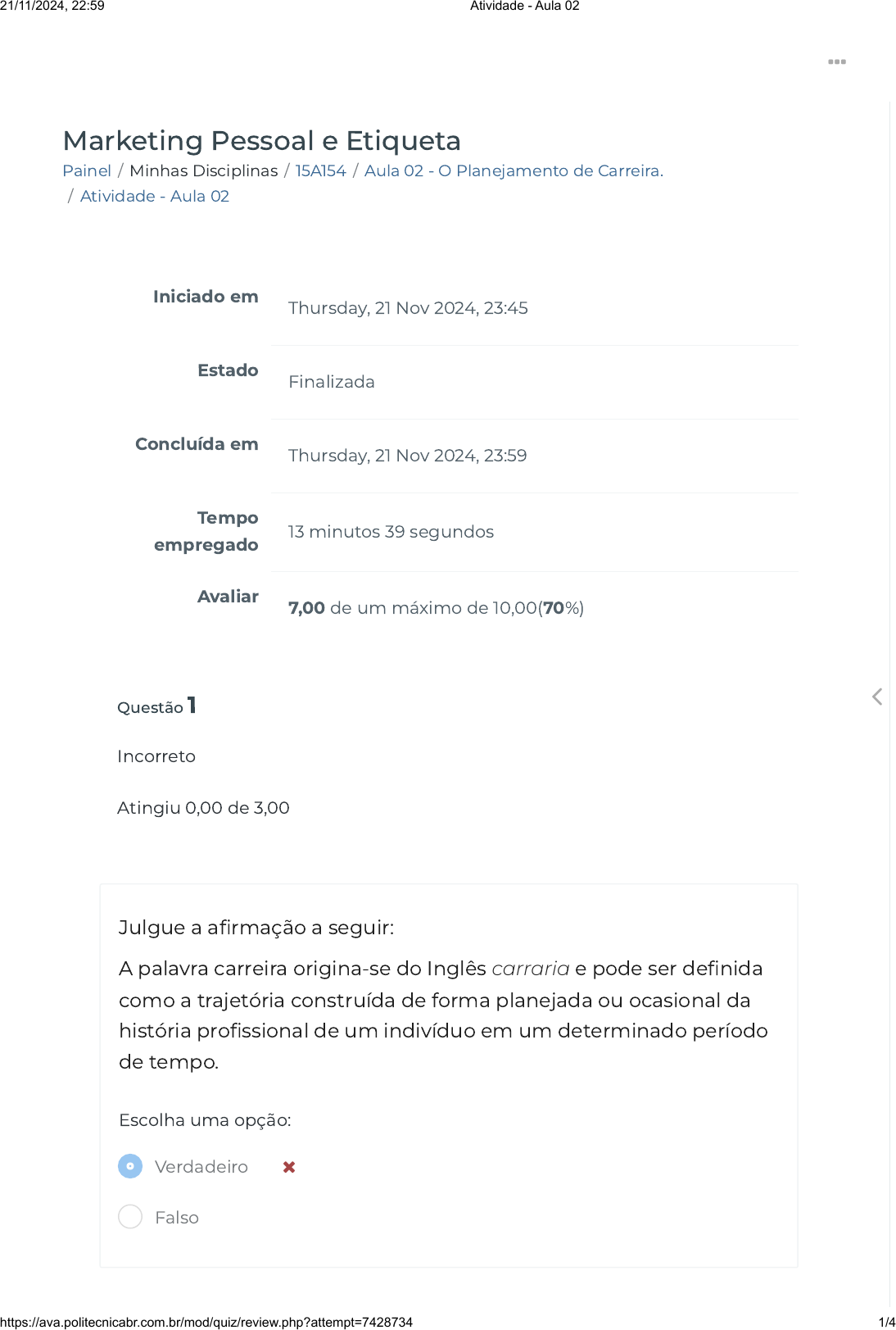 Painel / Minhas Disciplinas / 15A154 / Aula 02 - O Planejamento de Carreira. / Atividade - Aula 02 Marketing Pessoal e Etiqueta Iniciado em Thursday, 21 Nov 2024, 23:45 Estado Finalizada Concluída em Thursday, 21 Nov 2024, 23:59 Tempo empregado 13 minutos 39 segundos Avaliar 7,00 de um máximo de 10,00(70%) Questão 1 Incorreto Atingiu 0,00 de 3,00 Julgue a a�rmação a seguir: A palavra carreira origina-se do Inglês carraria e pode ser de�nida como a trajetória construída de forma planejada ou ocasional da história pro�ssional de um indivíduo em um determinado período de tempo. Escolha uma opção: Verdadeiro Falso 21/11/2024, 22:59 Atividade - Aula 02 https://ava.politecnicabr.com.br/mod/quiz/review.php?attempt=7428734 1/4 https://ava.politecnicabr.com.br/my/ https://ava.politecnicabr.com.br/my/ https://ava.politecnicabr.com.br/course/view.php?id=913 https://ava.politecnicabr.com.br/course/view.php?id=913#section-4 https://ava.politecnicabr.com.br/mod/quiz/view.php?id=26704 https://ava.politecnicabr.com.br/ Questão 2 Correto Atingiu 3,00 de 3,00 Julgue o item a seguir: No Dicionário Houaiss, emprego é um substantivo masculino, de�nido como: ocupação em serviço público ou privado; cargo, função, colocação; trabalho. Ato ou efeito de empregar (-se). Escolha uma opção: Verdadeiro Falso 21/11/2024, 22:59 Atividade - Aula 02 https://ava.politecnicabr.com.br/mod/quiz/review.php?attempt=7428734 2/4 https://ava.politecnicabr.com.br/ Questão 3 Correto Atingiu 4,00 de 4,00 Julgue o item a seguir: O plano de carreira muito se assemelha ao planejamento estratégico desenvolvido pelas organizações. Alfred Chandler (2003), o primeiro pesquisador a estudar cienti�camente administração estratégica, de�niu que o planejamento estratégico é a determinação das metas e objetivos básicos e de longo prazo de uma empresa e a adoção de ações e alocação de recursos necessários para atingir esses objetivos. Escolha uma opção: Verdadeiro Falso Entre em Contato https://www.politecnicabr.com.br 0800 084 2627 0800 084 2627 Links Úteis Dicas da nossa Diretora Acadêmica Planner de Estudos Declaração de Matrícula Orientações do AVA Abertura de Ticket Fale com o Tutor Cronograma de Estudos Manual de Estágio Manual de Competência 21/11/2024, 22:59 Atividade - Aula 02 https://ava.politecnicabr.com.br/mod/quiz/review.php?attempt=7428734 3/4 https://www.politecnicabr.com.br/ https://soundcloud.com/user-501638417/sets/escola-politecnica-brasileira https://soundcloud.com/user-501638417/sets/escola-politecnica-brasileira https://storage.googleapis.com/sirius-pubstore/semestre_plannerdeestudo%20poli.pdf https://storage.googleapis.com/sirius-pubstore/semestre_plannerdeestudo%20poli.pdf https://storage.googleapis.com/sirius-pubstore/declaracao_matricula.pdf https://storage.googleapis.com/sirius-pubstore/declaracao_matricula.pdf https://storage.googleapis.com/sirius-pubstore/orientacoes_ava.pdf https://storage.googleapis.com/sirius-pubstore/orientacoes_ava.pdf https://storage.googleapis.com/sirius-pubstore/abertura_ticket.pdf https://storage.googleapis.com/sirius-pubstore/abertura_ticket.pdf https://storage.googleapis.com/sirius-pubstore/fale_com_tutor.pdf https://storage.googleapis.com/sirius-pubstore/fale_com_tutor.pdf https://storage.googleapis.com/sirius-pubstore/cronograma_estudos.pdf https://storage.googleapis.com/sirius-pubstore/cronograma_estudos.pdf https://storage.googleapis.com/sirius-pubstore/manual_estagio.pdf https://storage.googleapis.com/sirius-pubstore/manual_estagio.pdf https://storage.googleapis.com/sirius-pubstore/manual_competencia.pdf https://storage.googleapis.com/sirius-pubstore/manual_competencia.pdf https://ava.politecnicabr.com.br/ © 2022 - Escola Politécnica Brasileira Siga-nos nas redes sociais 21/11/2024, 22:59 Atividade - Aula 02 https://ava.politecnicabr.com.br/mod/quiz/review.php?attempt=7428734 4/4 https://ava.politecnicabr.com.br/mod/quiz/0 https://ava.politecnicabr.com.br/mod/quiz/0 https://www.facebook.com/politecnicabr https://www.instagram.com/politecnicabr_oficial https://ava.politecnicabr.com.br/