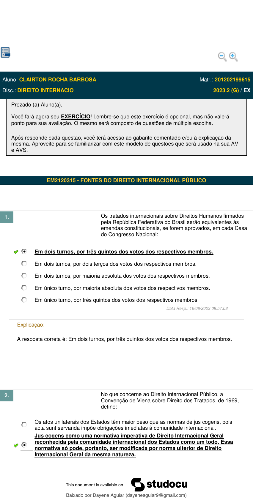DIREITO INTERNACIONAL PÚBLICO E PRIVADO Lupa ARA2112_201202199615_TEMAS Aluno: CLAIRTON ROCHA BARBOSA Matr.: 201202199615 Disc.: DIREITO INTERNACIO 2023.2 (G) / EX Prezado (a) Aluno(a), Você fará agora seu EXERCÍCIO! Lembre-se que este exercício é opcional, mas não valerá ponto para sua avaliação. O mesmo será composto de questões de múltipla escolha. Após responde cada questão, você terá acesso ao gabarito comentado e/ou à explicação da mesma. Aproveite para se familiarizar com este modelo de questões que será usado na sua AV e AVS. EM2120315 - FONTES DO DIREITO INTERNACIONAL PÚBLICO 1. Os tratados internacionais sobre Direitos Humanos firmados pela República Federativa do Brasil serão equivalentes às emendas constitucionais, se forem aprovados, em cada Casa do Congresso Nacional: Em dois turnos, por três quintos dos votos dos respectivos membros. Em dois turnos, por dois terços dos votos dos respectivos membros. Em dois turnos, por maioria absoluta dos votos dos respectivos membros. Em único turno, por maioria absoluta dos votos dos respectivos membros. Em único turno, por três quintos dos votos dos respectivos membros. Data Resp.: 16/08/2023 08:57:08 Explicação: A resposta correta é: Em dois turnos, por três quintos dos votos dos respectivos membros. 2. No que concerne ao Direito Internacional Público, a Convenção de Viena sobre Direito dos Tratados, de 1969, define: Os atos unilaterais dos Estados têm maior peso que as normas de jus cogens, pois acta sunt servanda impõe obrigações imediatas à comunidade internacional. Jus cogens como uma normativa imperativa de Direito Internacional Geral reconhecida pela comunidade internacional dos Estados como um todo. Essa normativa só pode, portanto, ser modificada por norma ulterior de Direito Internacional Geral da mesma natureza. Baixado por Dayene Aguiar (dayeneaguiar9@gmail.com) lOMoARcPSD|48644674 Mobile User As normas de jus cogens, semelhantes ao soft law, não possuem caráter vinculante, uma vez que são orientadoras das práticas estatais, como a diplomacia. As normas peremptórias do Direito Internacional são aquelas estabelecidas pela vontade dos Estados por meio dos tratados internacionais válidos. A equidade é o centro das normas de jus cogens, uma vez que o equilíbrio determina a forma pelo qual os Estados podem reconhecer o seu status hierarquicamente superior. Data Resp.: 16/08/2023 08:58:30 Explicação: A resposta correta é: Jus cogens como uma normativa imperativa de Direito Internacional Geral reconhecida pela comunidade internacional dos Estados como um todo. Essa normativa só pode, portanto, ser modificada por norma ulterior de Direito Internacional Geral da mesma natureza. 3. Em razão de sua natureza descentralizada, o Direito Internacional Público desenvolveu-se no sentido de admitir fontes de Direito diferentes daquelas admitidas no Direito Interno. Que fonte, entre as listadas a seguir, não pode ser considerada fonte de Direito Internacional? Atos unilaterais dos Estados Tratado Costume Princípios gerais de Direito Decisões de tribunais constitucionais dos Estados. Data Resp.: 16/08/2023 08:58:58 Explicação: A resposta correta é: Decisões de tribunais constitucionais dos Estados. 4. Tratados são, por excelência, normas de Direito Internacional Público. No modelo jurídico brasileiro, como nas demais democracias modernas, tratados passam a integrar o Direito Interno Estatal, após a verificação de seu iter de incorporação. A respeito dessa temática, assinale a opção correta, de acordo com o ordenamento jurídico brasileiro. Aprovados por decreto legislativo no Congresso Nacional, os tratados podem ser promulgados pelo Presidente da República. Uma vez assinados pelo Presidente da República, os tratados internacionais passam a fazer parte do ordenamento jurídico brasileiro, dando ensejo à responsabilidade internacional. Baixado por Dayene Aguiar (dayeneaguiar9@gmail.com) lOMoARcPSD|48644674 Mobile User Após firmados, os tratados passam a gerar obrigações imediatas, não podendo os Estados se eximir de suas responsabilidades por razões de Direito Interno. Uma vez ratificados pelo Congresso Nacional, os tratados passam, de imediato, a compor o Direito Brasileiro. Uma vez firmados, os tratados relativos ao MERCOSUL, ainda que criem compromissos gravosos à União, são automaticamente incorporados, visto que são aprovados por parlamento comunitário. Data Resp.: 16/08/2023 08:59:41 Explicação: A resposta correta é: Aprovados por decreto legislativo no Congresso Nacional, os tratados podem ser promulgados pelo Presidente da República. 5. A Convenção de Viena de 1969, promulgada em nossa República por meio do Decreto n. 7.030, de 14 de dezembro de 2009, estabelece as regras pelas quais um tratado pode ser considerado válido no ordenamento jurídico internacional. Dado o caráter público e normativo desta convenção, considerando as tipologias dos tratados, podemos afirmar que ela é: Tratado-costume Tratado-dispositivo Tratado-contrato Tratado-flexível Tratado-lei Data Resp.: 16/08/2023 09:00:57 Explicação: A resposta correta é: Tratado-lei 6. A par de constantes mudanças verificadas na sociedade internacional, com o surgimento de novos atores e de renovadas demandas, também o Direito das Gentes se atualiza em terminologias e em conceitos, de modo a abranger novas fronteiras, como o comércio, o meio ambiente e os Direitos Humanos. No que concerne a esse fenômeno, a denominada soft law, de utilização polêmica pela índole programática que comporta, embora desprovida de conteúdo imperativo, é utilizada de forma flagrante em Direito Internacional do Meio Ambiente. Sobre estas normas, é correto afirmar que: Baixado por Dayene Aguiar (dayeneaguiar9@gmail.com) lOMoARcPSD|48644674 Mobile User Possuem natureza vinculante e obrigatória. Dão ensejo à obrigação internacional, admitindo responsabilidade dos Estados. Possuem caráte