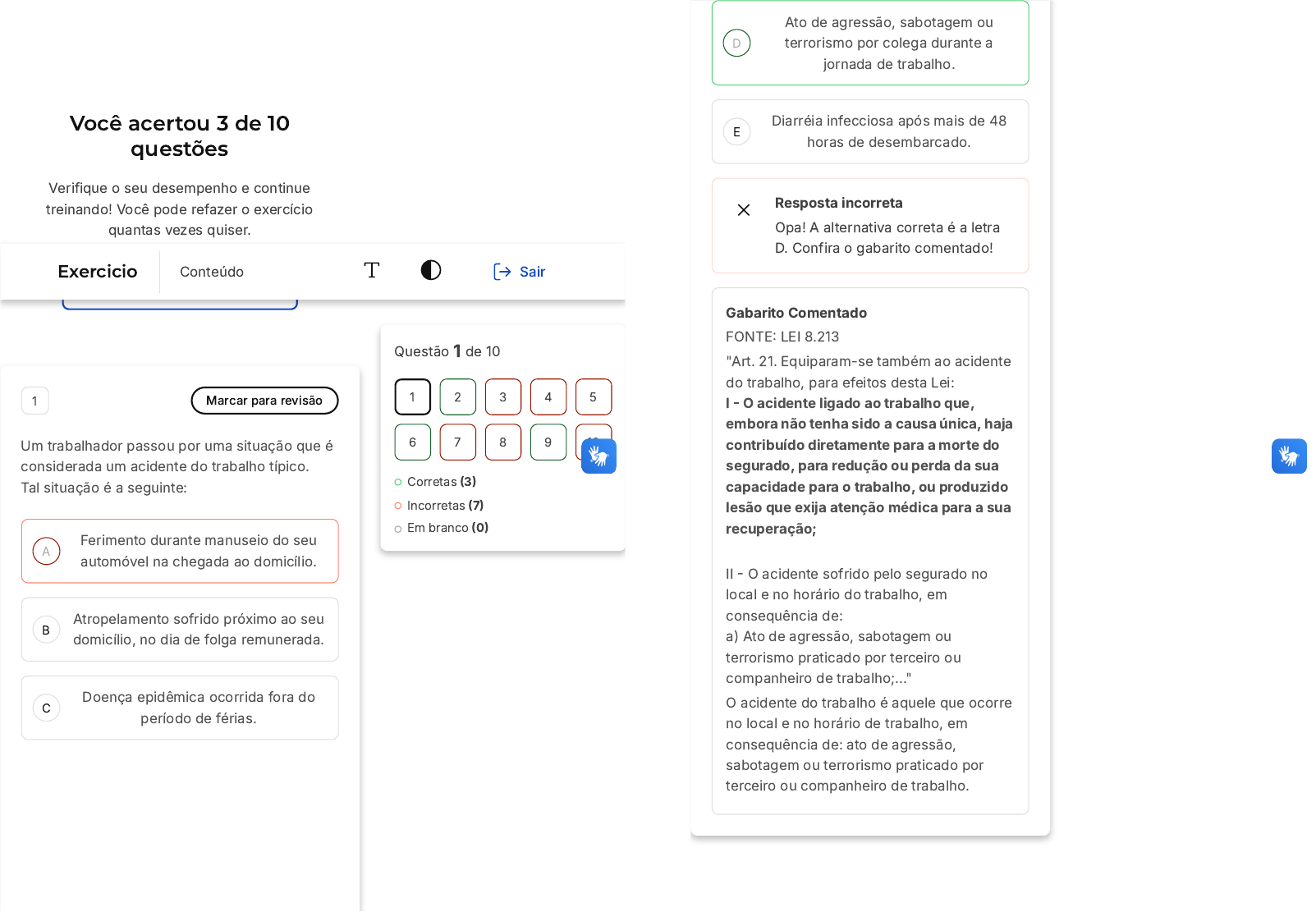 Você acertou 3 de 10 questões Verifique o seu desempenho e continue treinando! Você pode refazer o exercício quantas vezes quiser. Verificar Desempenho A B C 1 Marcar para revisão Um trabalhador passou por uma situação que é considerada um acidente do trabalho típico. Tal situação é a seguinte: Ferimento durante manuseio do seu automóvel na chegada ao domicílio. Atropelamento sofrido próximo ao seu domicílio, no dia de folga remunerada. Doença epidêmica ocorrida fora do período de férias. Questão 1 de 10 Corretas �3� Incorretas �7� Em branco �0� 1 2 3 4 5 6 7 8 9 10 Exercicio Conteúdo Sair D E Ato de agressão, sabotagem ou terrorismo por colega durante a jornada de trabalho. Diarréia infecciosa após mais de 48 horas de desembarcado. Resposta incorreta Opa! A alternativa correta é a letra D. Confira o gabarito comentado! Gabarito Comentado FONTE� LEI 8.213 "Art. 21. Equiparam-se também ao acidente do trabalho, para efeitos desta Lei: I � O acidente ligado ao trabalho que, embora não tenha sido a causa única, haja contribuído diretamente para a morte do segurado, para redução ou perda da sua capacidade para o trabalho, ou produzido lesão que exija atenção médica para a sua recuperação; II � O acidente sofrido pelo segurado no local e no horário do trabalho, em consequência de: a) Ato de agressão, sabotagem ou terrorismo praticado por terceiro ou companheiro de trabalho;..." O acidente do trabalho é aquele que ocorre no local e no horário de trabalho, em consequência de: ato de agressão, sabotagem ou terrorismo praticado por terceiro ou companheiro de trabalho. A B C D E 2 Marcar para revisão 6. Analise as afirmativas abaixo e escolha a alternativa correta em relação às circunstâncias em que a empresa é obrigada a fornecer aos empregados, gratuitamente, EPI adequado ao risco, em perfeito estado de conservação e funcionamento. I � Sempre que as medidas de ordem geral não ofereçam completa proteção contra os riscos de acidentes do trabalho ou de doenças profissionais e do trabalho. II � Enquanto as medidas de proteção coletiva estiverem sendo implantadas. III � Para atender a situações de emergência. Todas as afirmativas estão corretas Apenas as afirmativas II e III estão corretas. Apenas a afirmativa I está correta. Apenas as afirmativas I e II estão corretas Apenas a afrimativa III está correta Resposta correta Parabéns, você selecionou a alternativa correta. Confira o gabarito comentado! A B C D E Gabarito Comentado De acordo com a NR6� "6.3 A empresa é obrigada a fornecer aos empregados, gratuitamente, EPI adequado ao risco, em perfeito estado de conservação e funcionamento, nas seguintes circunstâncias: a) sempre que as medidas de ordem geral não ofereçam completa proteção contra os riscos de acidentes do trabalho ou de doenças profissionais e do trabalho; b) enquanto as medidas de proteção coletiva estiverem sendo implantadas; e, c) para atender a situações de emergência." Assim, todas as afirmativas estão corretas. 3 Marcar para revisão A doença profissional causada pela exposição de poeiras orgânicas de algodão, linho ou sisal é chamada de : asbistose bagaçose silicose asma ocupacional bissinose A B C Resposta incorreta Opa! A alternativa correta é a letra E. Confira o gabarito comentado! Gabarito Comentado Bissinose é uma doença pulmonar causada pela poeira das fibras de algodão, de linho ou de cânhamo. 4 Marcar para revisão Segundo a NR 9, dadas suas especificidades, a utilização de EPI no âmbito do programa deverá considerar as Normas Legais e Administrativas que envolvam no mínimo. Assinale a alternativa correta I) seleção do EPI adequado tecnicamente ao risco II) programa de treinamento dos trabalhadores quanto à sua correta utilização III) desconto do valor do EPI em folha de pagamento conforme disposto na NR I II III D E I, II II,III Resposta incorreta Opa! A alternativa correta é a letra D. Confira o gabarito comentado! Gabarito Comentado A NR�9 dispõe sobre o Programa de Prevenção de Riscos Ambientais e após suas análises e estabelecimento de medidas preventivas, o uso de equipamentos de proteção individual-EPI pode sinalizar para uma utilização obrigatória em determinado ambiente e por determinadas funções. Quando isso ocorre a empresa deve fornecer de forma gratuita tais equipamentos após uma seleção criteriosa de fornecedores e de forma concomitante providenciar treinamento contínuo para o uso e a manutenção dos mesmos pelos empregados. Assim, podemos considerar que as afirmativas "I e II" estão corretas e a terceira afirmativa está incorreta. 5 Marcar para revisão É equiparado ao acidente de trabalho o acidente sofrido pelo segurado A B C D E decorrente de campanha salarial, na execução de ordem ou na realização de serviço sob a autoridade do sindicato ou associação de classe, quando em comícios e aglomerações. decorrente de doença proveniente de contaminação acidental do empregado no exercício de atividade de voluntariado na comunidade social. no local e no horário do trabalho, em consequência de desabamento, inundação, incêndio e outros casos fortuitos ou decorrentes de força maior. decorrente de ato de agressão, sabotagem ou terrorismo praticado por terceiro ou companheiro de trabalho, morador na mesma comunidade social ou quando da prática de esportes coletivos. na prestação espontânea de qualquer serviço às empresas que tenham sofrido danos decorrentes de catástrofes climáticas e endemia regional. Resposta incorreta Opa! A alternativa correta é a letra C. Confira o gabarito comentado! Gabarito Comentado O acidente de trabalho é equiparado ao acidente sofrido pelo segurado no local e A B C D E no horário do trabalho, em consequência de desabamento, inundação, incêndio e outros casos fortuitos ou decorrentes de força maior. 6 Marcar para revisão O que é auxílio-acidente? b
