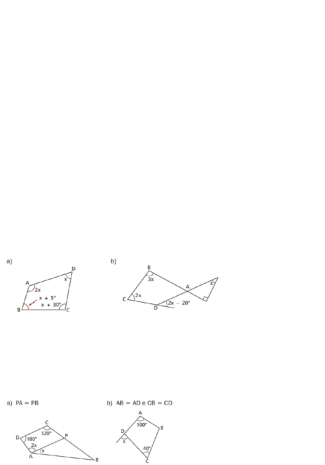 Setembro Licenciatura Plena em Matemática Graduação Módulo II EXERCÍCIO 6 01. Classifique em verdadeiro (V) ou falso (F): a) Todo retângulo é um paralelogramo. V b) Todo paralelogramo é retângulo. F c) Todo quadrado é retângulo. V d) Todo retângulo é quadrado. F e) Todo paralelogramo é losango. F f) Todo quadrado é losango. V g) Todo retângulo que tem dois lados congruentes é quadrado. F h) Todo paralelogramo que tem dois lados adjacentes congruentes é losango. V i) Se um paralelogramo tem dois ângulos de vértices consecutivos congruentes, então ele é um retângulo. V j) Se dois ângulos opostos de um quadrilátero são congruentes, então ele é um paralelogramo. V k) Se dois lados de um quadrilátero são congruentes, então ele é um paralelogramo. F l) Se dois lados opostos de um quadrilátero são congruentes, então ele é um paralelogramo. F m) Se dois lados opostos de um quadrilátero são congruentes e paralelos, então ele é um paralelogramo. V n) As diagonais de um losango são congruentes. F o) As diagonais de um retângulo são perpendiculares. F p) As diagonais de um retângulo são bissetrizes dos seus ângulos. F q) As diagonais de um paralelogramo são bissetrizes dos seus ângulos. F r) As diagonais de um quadrado são bissetrizes de seus ângulos e são perpendiculares. V s) Se as diagonais de um quadrilátero são bissetrizes de seus ângulos, então ele é um losango. V t) Se as diagonais de um quadrilátero são perpendiculares, então elas são bissetrizes dos ângulos dele. F u) Se as diagonais de um quadrilátero são congruentes e perpendiculares, então ele é um quadrado. F v) Se as diagonais de um quadrilátero são bissetrizes e congruentes, então ele é um quadrado. V x) Se uma diagonal de um quadrilátero é bissetriz dos dois ângulos, então ela é perpendicular a outra diagonal. V 02. Determine os ângulos dos quadriláteros ABCD abaixo. 03. Determine o valor de x nos casos abaixo. RESOLUÇÕES DAS QUESTÕES DO EXERCÍCIO 6 GEOMETRIA PLANA – 2023.2 2x + x + x + 5 + x + 30 = 360 5x = 360 – 35 5x = 325 x = 65° Os ângulos do quadrilátero ABCD são: 130°, 70°, 95° e 65° Note que 𝑚(�̂�) = 90° − 𝑥 e 𝑚(�̂�) = 180° − 2𝑥 + 20°, então: 2x + 3x + 90 – x + 180 – 2x + 20 = 360 2x = 360 – 290 2x = 70 x = 35° Os ângulos do quadrilátero ABCD são: 55°, 105°, 70° e 130° 04. Se 𝐴𝑃̅̅ ̅̅ e 𝐵𝑃̅̅ ̅̅ são bissetrizes, determine x nos casos abaixo. 05. Se 𝐴𝑃̅̅ ̅̅ e 𝐵𝑃̅̅ ̅̅ são bissetrizes, determine. a a b a b a b b 06. Se 𝐵𝑃̅̅ ̅̅ , 𝐴𝑃̅̅ ̅̅ , 𝐶𝑄̅̅ ̅̅ e 𝐷𝑄̅̅ ̅̅ são bissetrizes, determine x + y. 07. ABCD é trapézio de bases 𝐴𝐵̅̅ ̅̅ e 𝐶𝐷̅̅ ̅̅ . Se 𝐷𝑃̅̅ ̅̅ e 𝐶𝑃̅̅ ̅̅ são bissetrizes, determine x e 𝐵�̂�𝐷. No triângulo APB, temos que: a + b + 110 = 180 ⇒ a + b = 70° No quadrilátero ABCD, temos que: 2a + 2b + C + D = 360° 2(a + b) + C + D = 360° 2.70 + C + D = 360° C + D = 360 – 140 �̂� + �̂� = 220° No triângulo APB, temos que: a + b + 120 = 180 ⇒ a + b = 60° No quadrilátero ABCD, temos que: 2a + 2b + C + D = 360° 2(a + b) + C + C – 10 = 360° 2.60 + C + C – 10 = 360° 2C = 360 – 120 + 10 2C = 250° �̂� = 125° 08. 09. 10. O perímetro do paralelogramo é 34 cm. 11. 12. Calcule os lados de um retângulo cujo perímetro mede 40 cm, sabendo que a base excede a altura em 4 cm. 13. Determine a base e a altura de um retângulo, sabendo que o perímetro vale 288 m e que a base excede em 4 m o triplo da altura. 14. Calcule os lados de um paralelogramo, sabendo que o seu perímetro mede 84 m e que a soma dos lados menores representa 2/5 da soma dos lados maiores. 15. Prove que as bissetrizes de dois ângulos consecutivos de um paralelogramo cortam-se em ângulo reto. b + b + h + h = 40 cm ⇒ 2b + 2h = 40 ⇒ b + h = 20 (I) b = h + 4 (II) Substituindo (II) em (I), temos: h + 4 + h = 20 ⇒ h = 8 cm e com isso b = 12 cm. Os lados do retângulo são 8 cm, 8 cm, 12 cm e 12 cm. 𝑎) 𝑥 = 3𝑥 − 5 2 ⇒ 3𝑥 − 5 = 2𝑥 ⇒ 𝑥 = 5 b + b + h + h = 288 m ⇒ 2b + 2h = 288 ⇒ b + h = 144 (I) b = 3h + 4 (II) Substituindo (II) em (I), temos: 3h + 4 + h = 144 ⇒ h = 35 m e com isso b = 109 m. Considerando o lado maior sendo b e lado menor sendo a. b + b + a + a = 84 cm ⇒ 2b + 2a = 84 ⇒ b + a = 42 (I) 𝑎 + 𝑎 = 2 5 (𝑏 + 𝑏) (II) Substituindo (II) em (I), temos: 𝑏 + 2𝑏 5 = 42 ⇒ b = 30 m e com isso a = 12 m. 16. Em um trapézio retângulo, a bissetriz de um ângulo reto forma com a bissetriz do ângulo agudo do trapézio um ângulo de 110°. Determine o maior ângulo do trapézio. O maior ângulo do trapézio mede 130°. 17. A diagonal de um losango forma com um dos seus lados um ângulo igual à terça parte de um reto. Determine os quatro ângulos do losango. 18. A bissetriz de um ângulo obtuso do losango faz com um dos lados um ângulo de 55°. Determine o valor dos ângulos agudos. No losango, temos que as diagonais são bissetrizes do seus ângulos internos. Os ângulos agudos desse losango medem 70°, cada um. 19. A base maior de um trapézio isósceles mede 12 cm e a base menor 8 cm. Calcule o comprimento dos lados não paralelos, sabendo que o perímetro é 40 cm. Chamando de x os lados não-paralelos do trapézio isósceles, então temos: 12 + 8 + x + x = 40 2x = 40 – 20 2x = 20 x = 10 O comprimento dos lados não-paralelos é 10 cm, cada um. 20. Determine as medidas dos ângulos formados pelas bissetrizes internas de um trapézio em que dois ângulos agudos consecutivos medem 80° e 60°. 21. Com um arame de 36 m de comprimento construímos um triângulo equilátero e com o mesmo arame construímos depois um quadrado. Determine a razão entre o lado do triângulo e o lado do quadrado. 22. No triângulo ABC de lados AB = 9, BC = 14 e AC = 11, os pontos D, E e F são pontos médios de 𝐴𝐵̅̅ ̅̅ , 𝐴𝐶̅