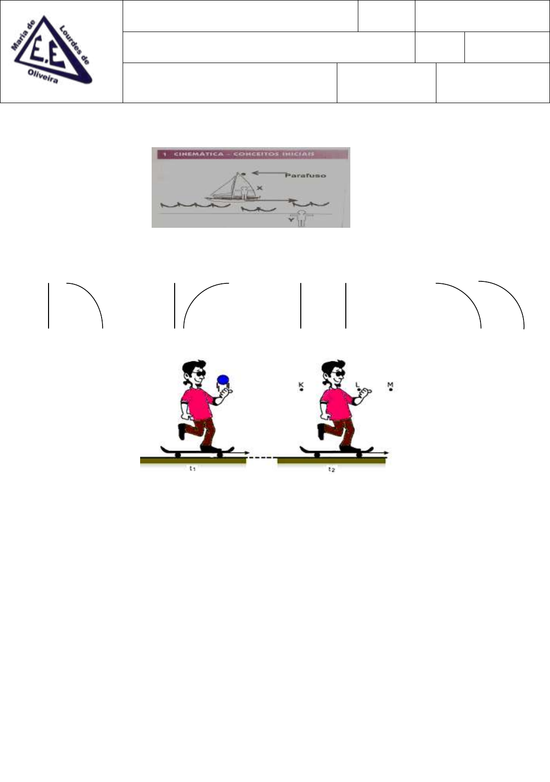 01. (UFMG) Um parafuso se desprende do alto do mastro de um veleiro que se desloca com velocidade constante, ao lado da margem de uma lagoa, no sentido indicado da figura. Um observador X, dentro do veleiro, e outro Y, à margem, observam o parafuso caindo. A alternativa que melhor representa as trajetórias do parafuso vistas pelos observadores X e Y, respectivamente, é: a) b) c) d) 02. (UFMG) - Observe esta figura. Daniel está andando de skate em uma pista horizontal. No instante t1, ele lança uma bola, que, sobe verticalmente. A bola sobe alguns metros e cai, enquanto Daniel continua a se mover em trajetória retilínea, com velocidade constante. No instante t2, a bola à mesma altura de que foi lançada. Despreze os efeitos da resistência do ar. Assim sendo, no instante t2, o ponto em que a bola estará mais provavelmente é: a) L b) K c) M d) Qualquer um, dependendo da velocidade de lançamento. 03. (PUC-MG) Dois corpos de pesos diferentes são abandonados no mesmo instante de uma mesma altura. Desconsiderando-se a resistência do ar, é CORRETO afirmar: a) Os dois corpos terão a mesma velocidade a cada instante, mas com acelerações diferentes. b) Os corpos cairão com a mesma aceleração e suas velocidades serão iguais entre si a cada instante. c) O corpo de menor volume chegará primeiro ao solo. d) O corpo de maior peso chegará primeiro ao solo. 04. (UFMG) Considere um ponto na superfície da Lua. O que se pode afirmar sobre esse ponto? a) Ele descreve um movimento circular b) Está parado c) Sua trajetória depende do referencial d) Descreve uma trajetória elíptica Disciplina: FÍSICA 1ºs Anos Regular Data:___ / __ / ___ Aluno (a): Nº: Turma: Professor: Pedro Gallo F. Valor: 10 pts. Nota: 05. (PUC-SP) A afirmação “todo movimento é relativo” significa que: a) Todos os cálculos de velocidade são imprecisos. b) Não existe movimento com velocidade constante. c) A velocidade depende sempre de uma aceleração. d) A descrição de qualquer movimento requer um referencial. 06. (UFSM – RS) Um avião, voando em linha reta com velocidade constante em relação ao solo, abandona uma bomba. Desprezando a resistência do ar, a trajetória dessa bomba será em forma de uma: a) parábola (curva) para um observador que estiver no avião. b) linha reta vertical para um observador que estiver na Terra. c) linha reta horizontal para um observador que estiver no avião. d) linha reta vertical para um observador que estiver no avião. 07. (DIREITO / C.L.) Dois carros A e B deslocam-se no mesmo sentido, um ao lado do outro, ambos a 80 km/h. Em relação ao motorista do carro A, podemos afirmar que o carro B: a) Está em repouso b) Está com v = 60km/h c) Está com v = 160km/h d) Está se movendo para trás. 08. (FUVEST - SP) De acordo com os comentários em sala de aula relacionados ao estudo da mecânica, analise a questão: Um menino viaja de ônibus com a sua mãe e, observando a paisagem externa, exclama: ___ Olha mãe! As árvores estão indo para trás! A mãe então responde; ___ Não meu filho, é o ônibus que está indo para frente. a) somente a mãe está certa. b) ambos estão errados. c) ambos, dentro dos seus pontos de vistas, estão certos. d) somente o menino está certo. 09 - Qual das situações abaixo você marcaria, de acordo com a definição da “MECÂNICA”: a) a variação de temperatura de um corpo. b) a dilatação de um corpo aquecido. c) o movimento dos planetas. d) o funcionamento dos aparelhos eletrodomésticos. 10. (UFMG) - João, Pedro e Marcos observam um ponto P na borda de um disco que gira em um plano horizontal (ver figura). João se encontra acima do plano do disco, sobre o seu eixo; Pedro está no mesmo plano de disco e Marcos, entre João e Pedro. As trajetórias do ponto P, observadas por João, Marcos e Pedro, respectivamente, são melhor apresentadas pelas figuras da alternativa: a) b) _____ c) _____ d) _____ 01 - Qual(is) da(s) alternativa(s) apresenta(m) a unidade de medida correspondente à grandeza física estudada no movimento uniformemente variado. I. A aceleração é medida em metros por segundo ao quadrado. II. A velocidade é medida em metros por segundo ao quadrado. III. O deslocamento é medido em metros quadrados. IV. O tempo é medido em segundos. a) Alternativas I e II. b) Alternativas III e IV. c) Alternativas I e III. d) Alternativas II e IV. e) Alternativas I e IV. 02 - (PUC - RS) Dizer que um movimento está acontendo com uma aceleração escalar constante de 5 m/s², significa que: a) em cada segundo o móvel se desloca 5m. b) em cada segundo a velocidade do móvel aumenta de 5m/s. c) em cada segundo a aceleração do móvel aumenta de 5m/s. d) em cada 5s a velocidade aumenta de 1m/s 03) Marque a alternativa correta sobre o movimento retilíneo uniformemente variado (MRUV): a) a velocidade e a aceleração são constantes b) a velocidade e a aceleração são variáveis c) a velocidade é variável e a aceleração é constante d) a velocidade é constante e a aceleração é variável 04) Das opções abaixo, qual melhor define o MRUV: a) Movimento com velocidade constante. b) Movimento em linha reta com aceleração constante. c) Movimento em linha curva com velocidade constante. d) Movimento com velocidade e aceleração variáveis. 05) Qual é a unidade da aceleração de acordo com o SI (Sistema Internacional): a) Metro por segundo (m/s) b) Metro por segundo ao quadrado (m/s2 ) c) Quilograma (kg) d) Segundo (s) 06) São características do Movimento Retilíneo Uniformemente Variado (MRUV) : a) A aceleração é constante diferente de zero e a velocidade é variável. b) A aceleração e a velocidade são constantes e diferentes de zero. c) A aceleração é variável e a velocidade constante. d) A aceleração e a velocidade são variáveis. Disciplina: FÍSICA 1ºs Anos Regular Data:___ / __ / ___ Aluno (a): Nº: Turma: Professor: Pedro Gallo F. Valor: 10 pts. Nota: 07) De acordo com o que vimos sobre o M