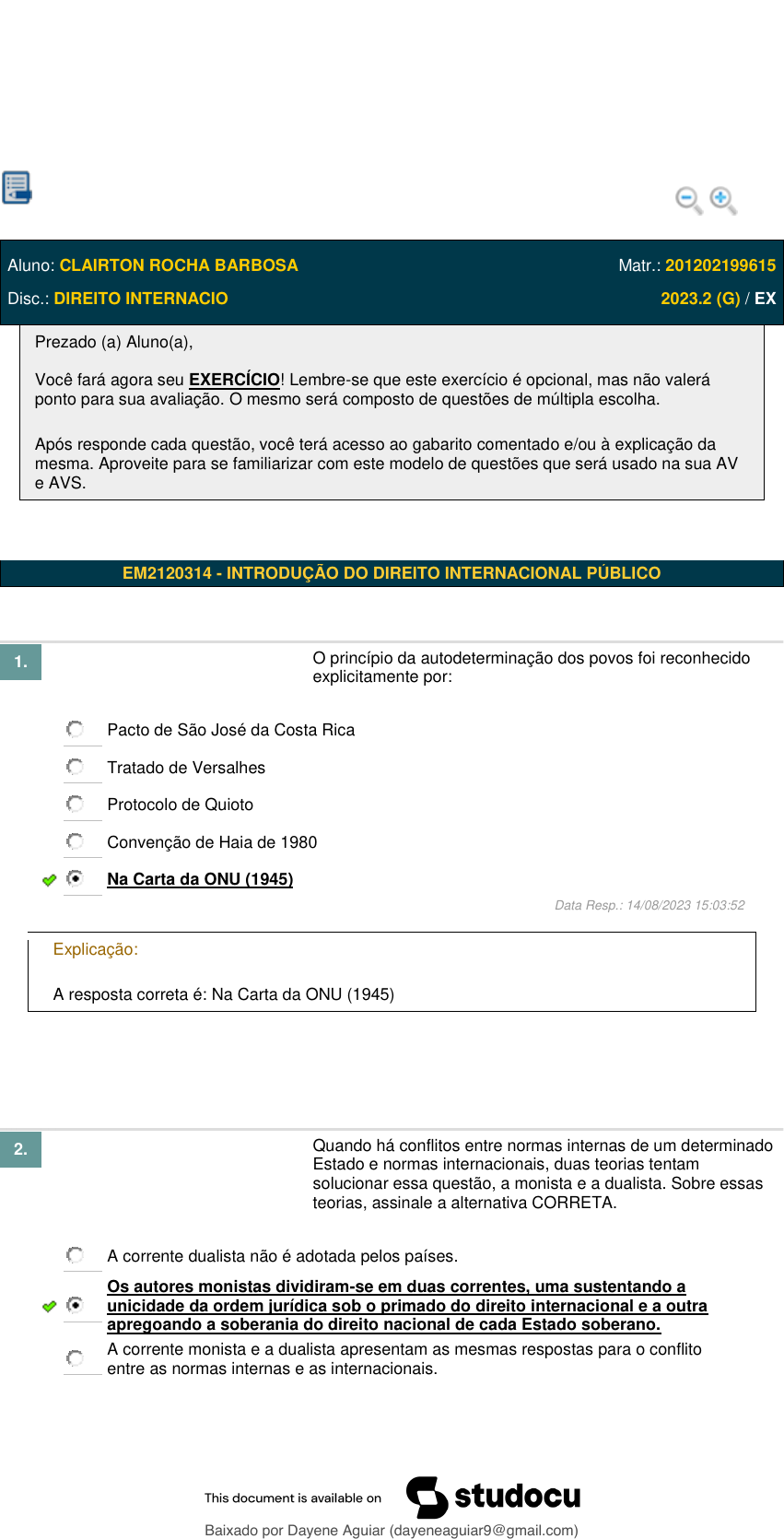 DIREITO INTERNACIONAL PÚBLICO E PRIVADO Lupa ARA2112_201202199615_TEMAS Aluno: CLAIRTON ROCHA BARBOSA Matr.: 201202199615 Disc.: DIREITO INTERNACIO 2023.2 (G) / EX Prezado (a) Aluno(a), Você fará agora seu EXERCÍCIO! Lembre-se que este exercício é opcional, mas não valerá ponto para sua avaliação. O mesmo será composto de questões de múltipla escolha. Após responde cada questão, você terá acesso ao gabarito comentado e/ou à explicação da mesma. Aproveite para se familiarizar com este modelo de questões que será usado na sua AV e AVS. EM2120314 - INTRODUÇÃO DO DIREITO INTERNACIONAL PÚBLICO 1. O princípio da autodeterminação dos povos foi reconhecido explicitamente por: Pacto de São José da Costa Rica Tratado de Versalhes Protocolo de Quioto Convenção de Haia de 1980 Na Carta da ONU (1945) Data Resp.: 14/08/2023 15:03:52 Explicação: A resposta correta é: Na Carta da ONU (1945) 2. Quando há conflitos entre normas internas de um determinado Estado e normas internacionais, duas teorias tentam solucionar essa questão, a monista e a dualista. Sobre essas teorias, assinale a alternativa CORRETA. A corrente dualista não é adotada pelos países. Os autores monistas dividiram-se em duas correntes, uma sustentando a unicidade da ordem jurídica sob o primado do direito internacional e a outra apregoando a soberania do direito nacional de cada Estado soberano. A corrente monista e a dualista apresentam as mesmas respostas para o conflito entre as normas internas e as internacionais. Baixado por Dayene Aguiar (dayeneaguiar9@gmail.com) lOMoARcPSD|48644674 Mobile User De acordo com a corrente dualista, o direito interno e o direito internacional convivem em uma única ordem jurídica. Segundo a corrente monista, quando há conflito entre as normas internas e as normas internacionais, essas últimas prevalecem. Data Resp.: 14/08/2023 15:04:47 Explicação: A resposta correta é: Os autores monistas dividiram-se em duas correntes, uma sustentando a unicidade da ordem jurídica sob o primado do direito internacional e a outra apregoando a soberania do direito nacional de cada Estado soberano. 3. Quanto ao DUALISMO e ao MONISMO, é correto afirmar que a "teoria da incorporação" advém da corrente monista, que defende a primazia do direito internacional. o dualismo tem como preceito a ideia de que todos os direitos emanam de uma única fonte. o dualismo aceita a existência de ordens jurídicas coexistentes, independentes e autônomas. o monismo defende a primazia do direito interno do país, haja vista a aplicação do direito ao caso em concreto. o dualismo incorpora a ideia de que, na ordem interna se obedece a um sistema de coordenação entre as normas e, no âmbito internacional, a uma relação de subordinação. Data Resp.: 14/08/2023 15:05:08 Explicação: A resposta correta é: o dualismo aceita a existência de ordens jurídicas coexistentes, independentes e autônomas. 4. Prova Das Disciplinas Correlatas) Sobre as normas imperativas de Direito Internacional Público, jus cogens, escolha a afirmativa incorreta: Sua previsão em texto legislativo internacional deu-se em 1969, com o advento da Convenção de Viena sobre Direito dos Tratados. Não podem ser modificadas em nenhuma circunstância pois carregam em seu conteúdo os valores mais elementares da sociedade internacional. Jus cogens é sinônimo de norma imperativa de direito internacional geral e está previsto como uma das causas de nulidade dos tratados. Sua consagração recepciona a ideia, desde muito tempo perseguida no Direito Internacional Público, de previsão de limites materiais ao poder estatal de celebrar tratados. Surgiram para determinar que certos postulados não podem sofrer derrogação por meio de acordos celebrados entre os Estados da comunidade internacional. Data Resp.: 14/08/2023 15:05:27 Baixado por Dayene Aguiar (dayeneaguiar9@gmail.com) lOMoARcPSD|48644674 Mobile User Explicação: A resposta correta é: Não podem ser modificadas em nenhuma circunstância pois carregam em seu conteúdo os valores mais elementares da sociedade internacional. 5. Qual dos temas abaixo não é objeto de normas do Direito Internacional? Armas nucleares Comércio exterior Tráfico de drogas Planos de saúde Meio ambiente Data Resp.: 14/08/2023 15:05:40 Explicação: A resposta correta é: Planos de saúde 6. Os sujeitos de Direito Internacional são: Estados, Organizações Governamentais Internacionais, Organizações Não Governamentais, pessoas jurídicas e indivíduos. Estados, Organizações Governamentais Internacionais, Organizações Não Governamentais, pessoas jurídicas, indivíduos e blocos regionais. Estados, Organizações Governamentais Internacionais, pessoas jurídicas, indivíduos e blocos regionais. Estados, Organizações Governamentais Internacionais, Organizações Não Governamentais, blocos regionais. Estados, Organizações Governamentais Internacionais, Organizações Não Governamentais, pessoas jurídicas e blocos regionais. Data Resp.: 14/08/2023 15:06:37 Explicação: A resposta correta é: Estados, Organizações Governamentais Internacionais, Organizações Não Governamentais, pessoas jurídicas, indivíduos e blocos regionais. 7. As normas de direito internacional peremptório (jus cogens): Baixado por Dayene Aguiar (dayeneaguiar9@gmail.com) lOMoARcPSD|48644674 Mobile User Pressupõem uma ordem pública internacional não disponível para os Estados individualmente. Não guardam qualquer relação com o conceito de obrigações erga omnes. Só podem ser derrogadas por costume internacional. Asseguram total disponibilidade para os Estados agirem individualmente, sem considerar uma ordem pública internacional. Podem ser derrogadas por tratado. Data Resp.: 14/08/2023 15:07:00 Explicação: A resposta correta é: Pressupõem uma ordem pública internacional não disponível para os Estados individualmente. 8. A maioria da doutrina internacionalista questiona-se por q