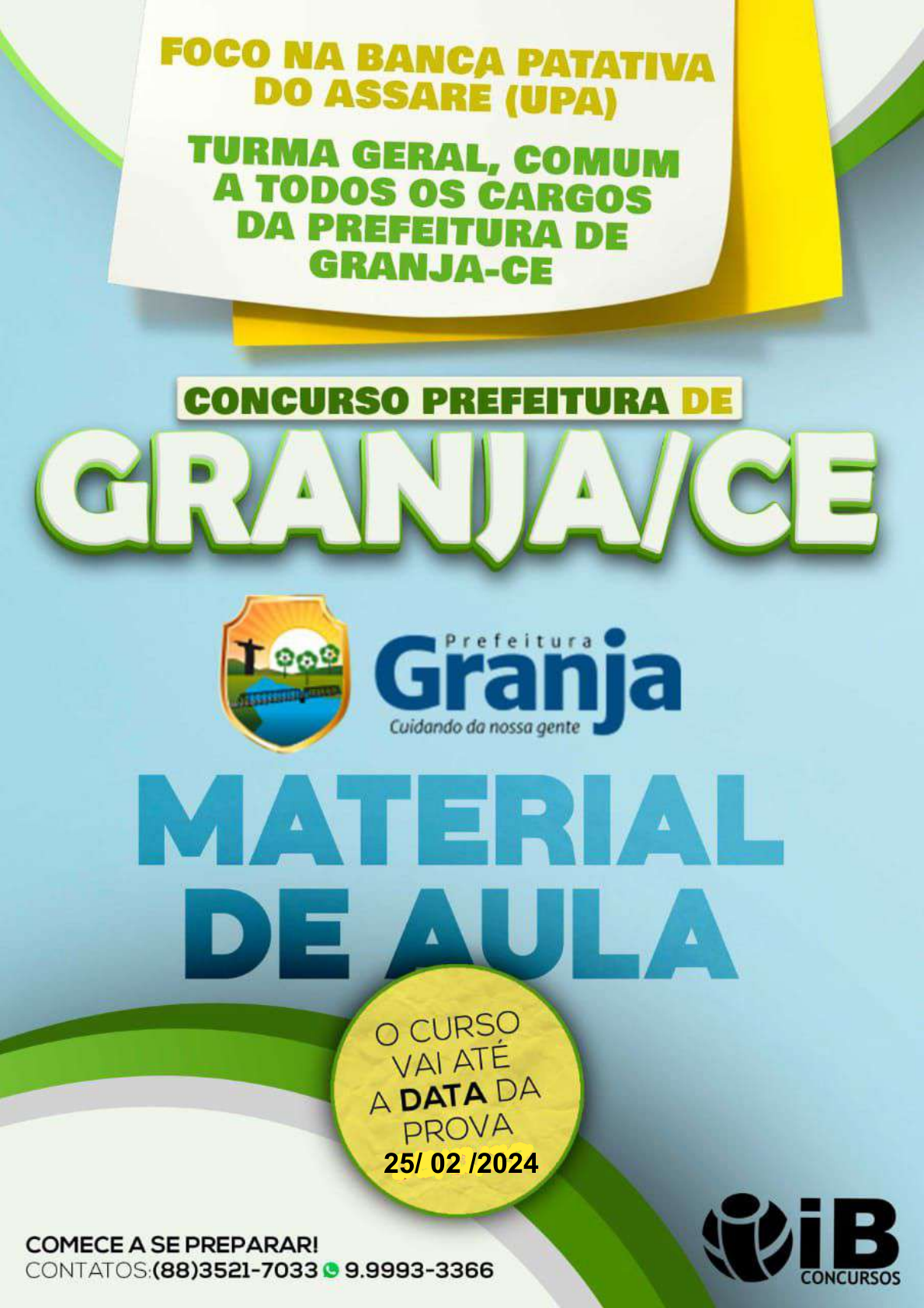 25/ 02 /2024 CONTATOS: (88) 3521 – 7033 / Contato@ibconcursos.com.br - - DISCIPLINA PROFESSOR CONHECIMENTOS GERAIS BRANDO Travessa Jardim 133, São Miguel, CRATO|CE HISTÓRIA / DIVISÃO ADMINISTRATIVA A origem do atual nome do município, consoante versão corrente, inclusive do historiador Eusébio de Sousa, é genuinamente Portuguesa tendo afinidade com a freguesia de São Brás da Granja, do Conselho de Mourão, distrito de Évora adjacência da margem esquerda do Rio Fuadelim em Portugal, vez que o colonizador tinha como critério, além mar, adotar nominação pátria nas regiões onde se localizava. O povoamento do município de Granja, antigamente chamado Macavoqueira e Santa Cruz do Coreaú, foi dos mais antigos que se procedeu na Capitania do Ceará Grande. Várias tribos habitavam a vasta região beneficiada pelas ribeiras férteis do rio Coreaú, destacando-se, entre outras, a dos índios Tabajaras, Tapuias, Coasues e Tremembés. Nos idos de 1702, Miguel Machado Freire e seu irmão Domingos Machado Freire receberam, datada de 3 de agosto daquele ano, no Recife, uma doação de cinco léguas de terras, com uma de largo na margem oriental do rio Coreaú. Veio medi-las o desembargador Cristóvão Soares Reimão. As voltas com os indígenas andavam colonizadores baianos e portugueses, que se foram localizando à margem do rio, perto do porto, e outros na apara, próximo a Tabainha, onde existia a Missão dos Jesuítas.Com a expulsão destes, os índios pouco a pouco deixaram a aldeia onde já existia um nicho de oração, e passaram-se para o povoado à margem do rio, no qual havia mais comércio e movimento, e que já era conhecido por Santa Cruz. Surgiu, deste fato, a atual cidade de Granja, que, por Provisão, passou a ser sede de freguesia, então com a denominação de Macavoqueira, nome pelo qual os portugueses chamavam os habitantes da missão. NOSSA SENHORA DO LIVRAMENTO. Uma sesmaria doada ao português: Domingos Machado Freire; que começou a ser povoada por volta de 1650. Cercada de mistérios, natureza abrangente e de também muitos índios. Lugar que mais tarde seria palco de uma milagrosa aventura que até hoje nos causa admiração. Conta-se que por volta de 1700, um navio à vela, conduzindo de especiarias, partiu de Pernambuco com destino a um lugar chamado de Porto do Francês (hoje, Urtiga) ao Ceará. E após longos dias de penosa viagem, formou-se um terrível temporal. Era noite. No céu o relâmpago fendia o espaço e o trovão ecoava de lado a lado. Um vento rígido soprava com fúria, rasgando as velas do barco e o mar ameaçava cada vez mais a frágil embarcação com seus tripulantes. Aterrorizados pela violência da tempestade, os navegantes prometeram a Nossa Senhora do Livramento (de quem eram devotos, e costumavam recorrer), fazendo o voto que se escapassem com vida, no lugar em que encontrassem gente mansa que lhes pudessem socorrer, ergueriam um altar a excelsa Virgem do Livramento. A embarcação foi a pique nas proximidades de Jericoacoara, afundando com toda a carga e alguns tripulantes. Porém, três náufragos (que se tem notícia) sobreviveram e chegaram à costa que então era habitada por índios selvagens. Por alguns dias percorreram as praias (enfrentando o sol escaldante, durante o dia; e um frio intenso, à noite. Além da fome). Encontraram então, um pequeno lago e seguiram um riacho que era afluente do mesmo. Subiram uma pequena colina no intuito de melhor se orientarem e lá, próximo de um velho pé de juazeiro, decidiram descansar. Já sem esperança de vida, ouviram um tiro. Imediatamente seguiram a direção do som. Lá encontraram um humilde caçador holandês, que os conduziu à sua pobre moradia (uma pequena choupana), acolhendo-os amigavelmente. Em comprimento do voto ergueram uma tosca e pequena casa de oração dotada de um altar à N. S. do Livramento no local do encontro com o caçador, que é o mesmo em que está a antiga Capela do Parazinho, atual Educandário. Alimentados e mais fortes, foram conduzidos pelo caçador até o povoado mais próximo, terras de propriedades do Coronel Gerônimo Machado Freire (primo herdeiro de Domingos), abastado fazendeiro das terras próximas a ribeira do Coreaú, onde nas mesmas aconteceu o encontro dos sobreviventes com o caçador. O tempo foi passando e vários milagres atribuídos à Santa foram acontecendo, levando a devoção de muitos romeiros a transformar-se na maior romaria do Norte do Ceará. Era a cura da Ribeira do Acaraú, cuja jurisdição da região pertencia ao Pe. João de Matos Monteiro, que chegou pela primeira vez ao curato em 1713. Tudo isso nos leva a crer que a Capela tenha sofrido muitas intervenções até chegar à sua forma de um único e pequeno vão, construído pelo Capitão-mor Domingos Machado Freire (e que assim permaneceu por mais de um século), que doou meia légua de terra quadrada em torno da sua construção. Após isso, com 80 anos de idade, Domingos faleceu no dia 15 de março. Sendo sepultado na Capela que ele próprio construíra. Deixando um rico legado ao seu jovem primo: Gerônimo Machado Freire, com a CONTATOS: (88) 3521 – 7033 / Contato@ibconcursos.com.br GRANJA -CE 2024 BRANDO - - Travessa Jardim 133, São Miguel, CRATO|CE obrigação/condição de casar com uma filha de seu sobrinho, Francisco Machado. Após algum tempo, vivendo sua grande paixão, Gerônimo caçava com seus amigos e seus bravos cães. O mesmo se encontrou isolado e foi atacado por uma feroz onça que estava a lhe devorar. Ele que também tinha devoção a N. S. do Livramento, pediu socorro à Mesma: -prometendo doar meia légua de terra. Sendo salvo pelos seus criados que chegaram de imediato, Gerônimo deu então a terra, tendo como ponto central uma pedra existente no terraço da casa de Manuel Joaquim Salgado (um dos moradores que já residia perto do altar erguido). Voltando os náufragos após alguns anos mais tarde, trouxeram a primeira Imagem (que media mais 