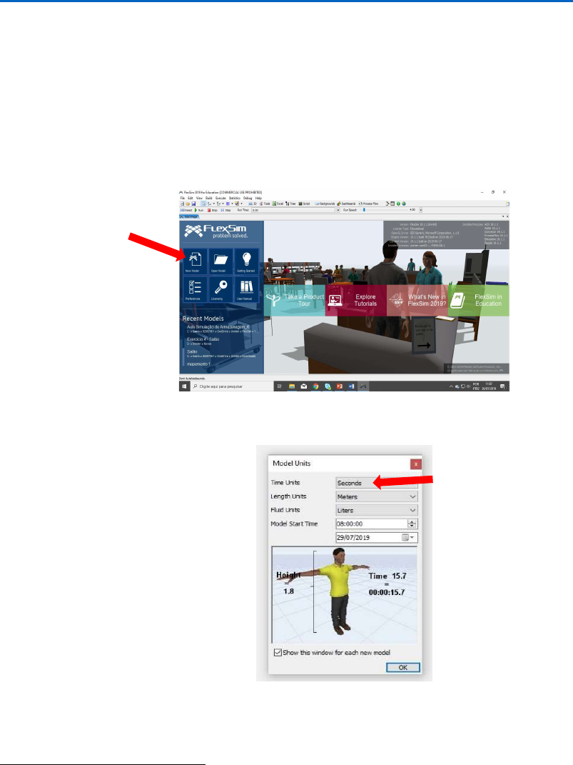 1 ATIVIDADE PRÁTICA MAPEAMENTO DE PROCESSOS – VERSÕES 2018 ATÉ 2020-1 1. REALIZAR AS SEGUINTES ATIVIDADES PRELIMINARES: a) Baixar o software FlexSim no site www.flexsim.com.br/pt, de acordo com as orientações do vídeo de baixa e instalação na Aula Prática 5. ATENÇÃO - A versão do site é a 2021-1 e exige Windows acima do 8.1 e caso seu computador tenha o Windows abaixo da versão 8.1 ou não responda bem a versões mais atuais, baixar a versão 2018.09 do software FlexSim no link https://1drv.ms/u/s!Ap_7ebvIMJwGhZQPNFt2dYEsonxwbA?e=2B4duK. b) Assistir à simulação realizada na Aula Prática 6 e depois realizar a simulação abaixo (Atenção: os valores a serem programados podem ser diferentes dos apresentados no vídeo). Ao final da simulação tem um check list para a verificação de toda a programação. 2. SIMULAÇÃO1 PASSO 1 - ETAPA INICIAL: DEFINIR AS UNIDADES DO MODELO: Abrir o programa: Acionar “New Model” Fonte: FlexSim Deixe em metros e segundos as unidades de distância e tempo. Fonte: FlexSim PASSO 2: ADICIONAR OS OBJETOS NO MODELO 1 Adaptado do Curso Básico da FlexSim do Brasil 2 Arrastar os objetos para a superfície de simulação e posicioná-los conforme o layout abaixo: Fonte: FlexSim PASSO 3: NOMEAR OS OBJETOS CONFORME ABAIXO Clique no objeto 3D e mude seu nome na aba “Quick Properties” que aparece ao lado direito da tela Siga rigorosamente os nomes na figura: Fonte: FlexSim PASSO 4: CONECTAR OS OBJETOS CONFORME IMAGEM ABAIXO Pressione a tecla “A”, clique no objeto de origem e em seguida no de destino. Primeiramente conecte a entrada de pallets no empacotamento e a separação na devolução de pallets; Fonte: FlexSim Após complete as demais conexões, sempre pressionando a tecla “A”. 3 Fonte: FlexSim Pressionando a tecla “S” faça a ligação da Máquina Nova para o Operador e também da Máquina Velha para o mesmo Operador; Pressionando a tecla “S” faça a ligação do Empacotamento para o Transportador. Fonte: FlexSim Comentário: Como conectar objetos As portas de saída-entrada são normalmente utilizadas para determinar o fluxo dos materiais ou itens (entidades); As portas centrais permitem o controle e automação de outras funções do FlexSim, e.g. operadores de máquina, transportadores, etc.. Fonte: FlexSim PASSO 5: SEGUIR AS ORIENTAÇÕES CONFORME IMAGENS ABAIXO: a) A matéria prima chega no processo respeitando uma exponential(0 ,10, 0) segundos 4 Fonte: FlexSim b) Aguarda em uma fila para ir para uma das duas máquinas de processamento. Capacidade das Filas: 50 unidades Lógica de distribuição dos itens entre as duas primeiras máquinas: First available (Primeiro disponível) Fonte: FlexSim c) Programação das máquinas: Distância entre duas máquinas: 10 metros Fonte: FlexSim Tempo processamento máquina mais velha: gama(0, 5, 3, 0) segundos Tempo processamento máquina mais nova: normal(10, 2, 0) segundos Tempo de setup de ambas as máquinas: 5 segundos 10 metros 5 Fonte: FlexSim Temos um operador para operar as duas máquinas. Alocação do operador: tarefa esperando a mais tempo (sort by task sequence priority) Depois de processados os produtos vão para uma fila com capacidade de 50 unidades, onde aguardam para serem empacotados. Fonte: FlexSim d) Programação da Fila 2: Capacidade da fila 50 unidades 6 Fonte: FlexSim e) Programação do Empacotamento e da Entrada de Paletts: Tempo de empacotamento: normal (10, 5, 0) segundos Quantidade de produtos a serem combinados: 4 caixas em cima do pallet Selecionar a Aba “Flow” e marcar a caixa “Use Transport” na Empacotadora Fonte: FlexSim f) Programação da Separação: Distância entre empacotamento e separação: 20 metros (cada grade no solo tem 1 m2) Fonte: FlexSim 20 metros 7 Tempo de separação: uniform(5, 15, 0) segundos Velocidade da empilhadeira: 1m/s Fonte: FlexSim g) Programação do Processamento Final: Tempo de processamento: triangular (5,15,10) segundos Fonte: FlexSim PASSO 6: DEFINIÇÃO DO TEMPO DE SIMULAÇÃO E EXECUÇÃO a) Clique na seta em preto localizado na barra principal entre “Run Time” e “Run Speed” para aparecer a tela abaixo. 8 Fonte: FlexSim b) Selecione a opção “Stop Time” e defina o valor referente ao que foi pedido: 86400 segundos c) Durante a execução do modelo, a velocidade da simulação pode ser alterada deslizando-se o cursor da barra “Run Speed”, ou alterando seu valor na caixa ao lado. PASSO 7: EXECUTANDO O MODELO a) Selecionar o solo em qualquer ponto da tela e em Quick Properties à direita da tela localizar “Show Names” e mudar para “Show Names and Stats” b) Ao rodarmos o modelo obteremos: a quantidade de itens em processo WIP e processados, que podem ser visualizados bastando selecionar o elemento e verificar a tabela resumo à direita na tela em “Quick Properties”: 9 CHECK LIST DOS DADOS PARA CONFERÊNCIA DA SIMULAÇÃO “A matéria prima chega no processo respeitando uma exponential(0, 10, 0) segundos e aguarda em uma fila para ir para uma das duas máquinas de processamento. Temos duas máquinas, uma mais velha, que demora gamma(0, 5, 3, 0) segundos para processar e uma mais nova, que demora normal(10, 2, 0) segundos, as duas com tempo de preparação (set up) de 5 segundos. Temos um operador para operar as duas máquinas. Depois de processados os produtos vão para uma fila onde aguardam para serem empacotados. Eles são colocados em cima de um pallet e depois transportados por uma empilhadeira até um ponto de separação. Essa empilhadeira não é muito rápida, chegando no máximo à 1 metro por segundo. Capacidade das Filas: 50 unidades Lógica de distribuição dos itens entre as duas primeiras máquinas: First available (Primeiro disponível) Distância entre duas máquinas: 10 metros Alocação do operador: Sort by TaskSequence Priority (Tarefa esperando a mais tempo) Tempo de Empacotamento: normal(10, 5, 0) segundos Chegada de Pallets: Selecionar para fornecer Pa