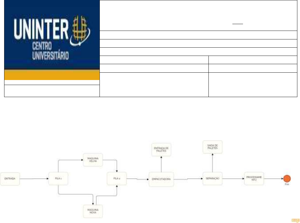 1 Aluno (a): MARCELO SILVEIRA DE SOUSA RU: 1677152 Versão do FlexSim: 2020 Tutor: Vitor Hugo Lopes Lau Disciplina: Mapeamento de Processos Curso: Engenharia de Produção Turma/UTA: AII 2021 Turno: EAD Data Limite para postagem: 24/05/2021 Valor total deste trabalho: 100 ATENÇÃO: NÃO HAVERÁ PRORROGAÇÃO OU REABERTURA PARA ENTREGA FORA DO PRAZO Nota: 1) Utilizando um software específico elabore o fluxograma da simulação efetuada no Flexsim.: (3 pontos) 2 2) Imagem da simulação realizada no FlexSim (1 ponto) 3 3) Imagem da simulação realizada no FlexSim após rodar os 86400 segundos (obrigatório exibir “Names and Stats) (1 ponto) 4) Foto do aluno enquanto estiver realizando a simulação no FlexSim (2 pontos) (Obs.: Caso seja possível, peça para outra pessoa filmar você por alguns segundos enquanto faz a simulação e anexe a filmagem junto com o relatório no AVA) 4 5) Responder às questões a seguir com base na simulação realizada com os elementos do FlexSim: a) No FlexSim como se une dois elementos pelas suas portas de entrada e saídas? (1 ponto) Mantenha a tecla "A" no teclado ativa enquanto conecta a saída à entrada do elemento analógico. b) Qual é a função do Processor? (0,5 ponto) É realizar o processamento do iten ou projeto (máquina ou estação de trabalho). c) Qual é a função do Combiner? (0,5 ponto) É colocar quatro itens no palete para serem transportados / combinar dois itens para serem processados. d) Qual é a função do Separator? (0,5 ponto) É de retirar os itens do pallet / Separar dois itens para serem processados em separado. e) Qual é a função do Source? (0,5 ponto) É a entrada de matéria prima ou de pallets / Entrada de material para o processo.