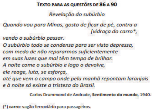 22 Caderno de material complementar e de apoio Pró-Reitoria de Extensão – PROEX TEXTO PARA AS QUESTÕES 41 A 45 31. (FUVEST – 2014, Questão 41) Para a caracterização do subúrbio, o poeta lança mão, principalmente, da(o) a) personiicação. b) paradoxo. c) eufemismo. d) sinestesia. e) silepse. 32. (FUVEST – 2014, Questão 42) Considerados no contexto, dentre os mais de dez verbos no presente, empregados no poema, exprimem ideia, respectivamente, de habitualidade e continuidade a) “gosto” e “repontam”. b) “condensa” e “esforça”. c) “vou” e “existe”. d) “têm” e “devolve”. e) “reage” e “luta”. 33. (FUVEST – 2014, Questão 43) Em consonância com uma das linhas temáticas principais de Sentimento do mundo, o vivo interesse que, no poema, o eu lírico manifesta pela paisagem contemplada prende-se, sobretudo, ao fato de o subúrbio ser a) bucólico. b) popular. c) interiorano. d) saudosista. e) familiar. 34. (FUVEST – 2014, Questão 44) No poema de Drummond, a presença dos motivos da velocidade, da mecanização, da eletricidade e da metrópole conigura-se como a) uma adesão do poeta ao mito do progresso, que atravessa as letras e as artes desde o surgimento da modernidade. 23 Caderno de material complementar e de apoio Pró-Reitoria de Extensão – PROEX b) manifestação do entusiasmo do poeta moderno pela industrialização por que, na época, passava o Brasil. c) marca da inluência da estética futurista da Antropofagia na literatura brasileira do perí- odo posterior a 1940. d) uma incorporação, sob nova inlexão política e ideológica, de temas característicos das vanguardas que inluenciaram o Modernismo antecedente. e) uma crítica do poeta pós-modernista às alterações causadas, na percepção humana, pelo avanço indiscriminado da técnica na vida cotidiana. 35. (FUVEST – 2014, Questão 45) Segundo o crítico e historiador da literatura Antonio Candido de Mello e Souza, justamente na década que presumivelmente corresponde ao período de elaboração do livro a que pertence o poema, o modo de se conceber o Brasil havia sofrido “alteração marcada de perspectivas”. A leitura do poema de Drummond permite concluir corretamente que, nele, o Brasil não mais era visto como país a) agrícola (fornecedor de matéria-prima), mas como industrial (produtor de manufaturados). b) arcaico (retardatário social e economicamente) mas, sim, percebido como moderno (equiparado aos países mais avançados). c) provinciano (caipira, localista) mas, sim, cosmopolita (aberto aos intercâmbios globais). d) novo (em potência, por realizar-se), mas como subdesenvolvido (marcado por pobreza e atroia). e) rural (sobretudo camponês), mas como suburbano (ainda desprovido de processos de urbanização). AS QUESTÕES DE 46 A 50 TOMAM POR BASE UMA MODINHA DE DOMINGOS CALDAS BARBOSA (1740-1800). Protestos a Arminda Conheço muitas pastoras Que beleza e graça têm, Mas é uma só que eu amo Só Arminda e mais ninguém. Revolvam meu coração Procurem meu peito bem, Verão estar dentro dele Só Arminda e mais ninguém. De tantas, quantas belezas Os meus ternos olhos veem, Nenhuma outra me agrada Só Arminda e mais ninguém. Estes suspiros que eu solto Vão buscar meu doce bem, É causa dos meus suspiros Só Arminda e mais ninguém. Os segredos de meu peito 24 Caderno de material complementar e de apoio Pró-Reitoria de Extensão – PROEX Guardá-los nele convém, Guardá-los aonde os veja Só Arminda e mais ninguém. Não cuidem que a mim me importa Parecer às outras bem, Basta que de mim se agrade Só Arminda e mais ninguém. Não me alegra, ou me desgosta Doutra o mimo, ou o desdém, Satisfaz-me e me contenta Só Arminda e mais ninguém. Cantem os outros pastores Outras pastoras também, Que eu canto e cantarei sempre Só Arminda e mais ninguém. Viola de Lereno, 1980. 36. (UNESP – 2015 meio de ano, Questão 46) Além de outras características, a presença de dois vocábulos contribui para identiicar o aspecto neoclássico desta modinha, a saber: (A) “alegra” e “desgosta”. (B) “mimo” e “desdém”. (C) “suspiros” e “segredos”. (D) “canto” e “cantarei”. (E) “pastores” e “pastoras”. 37. (UNESP – 2015 meio de ano, Questão 47) Na segunda estrofe, o eu lírico explora, seguindo a tradição poética, uma concepção so- bre a sede dos sentimentos humanos. Segundo tal concepção, o amor (A) situa-se na imaginação dos homens. (B) é um corpo estranho que passa a residir no de quem ama. (C) mora com a inveja e é irmão gêmeo do ódio. (D) localiza-se no coração dos homens. (E) nasce no paraíso e conduz para lá quem ama. 38. (UNESP – 2015 meio de ano, Questão 48) Assinale a alternativa que indica duas estrofes em que o termo Arminda” surge como pa- ciente da ação expressa pelo verbo da oração de que faz parte. (A) Primeira e terceira estrofes. (B) Sétima e oitava estrofes. (C) Primeira e oitava estrofes. (D) Terceira e quarta estrofes. (E) Terceira e quinta estrofes. 25 Caderno de material complementar e de apoio Pró-Reitoria de Extensão – PROEX 39. (UNESP – 2015 meio de ano, Questão 49) Levando em consideração o contexto da estrofe, assinale a alternativa em que a forma verbal surge no modo imperativo. (A) “Vão buscar meu doce bem,” (4a estrªfe). (B) “Parecer às outras bem,” (6a estrªfe). (C) “Conheço muitas pastoras” (1a estrªfe). (D) “Guardá-los aonde os veja” (5a estrªfe). (E) “Procurem meu peito bem,” (2a estrªfe). 40. (UNESP – 2015 meio de ano, Questão 50) Sob o ponto de vista expressivo, a repetição do último verso de todas as estrofes tem a função de enfatizar o grande afeto do eu lírico por Arminda. (B) assinalar o caráter inacessível de Arminda. (C) atribuir um tom fortemente lamentoso à modinha. (D) ironizar a distância do eu lírico em relação a Arminda. (E) insistir na ideia do amor como uma fantasia irrealizável. As
