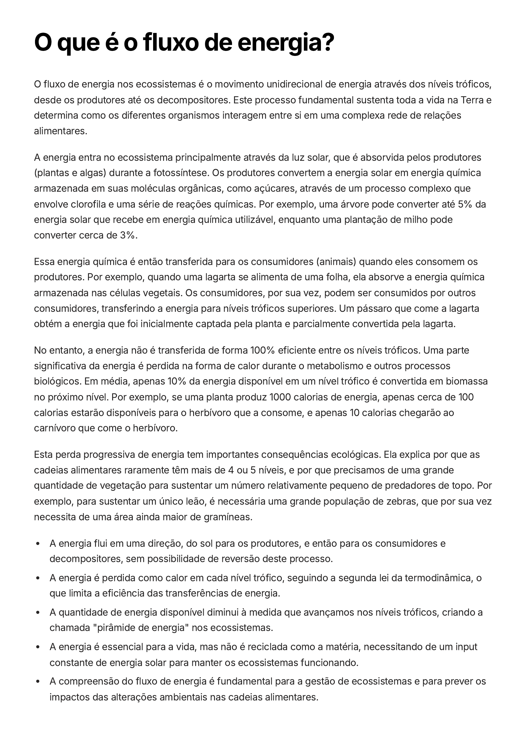 O que é o fluxo de energia? O fluxo de energia nos ecossistemas é o movimento unidirecional de energia através dos níveis tróficos, desde os produtores até os decompositores. Este processo fundamental sustenta toda a vida na Terra e determina como os diferentes organismos interagem entre si em uma complexa rede de relações alimentares. A energia entra no ecossistema principalmente através da luz solar, que é absorvida pelos produtores (plantas e algas) durante a fotossíntese. Os produtores convertem a energia solar em energia química armazenada em suas moléculas orgânicas, como açúcares, através de um processo complexo que envolve clorofila e uma série de reações químicas. Por exemplo, uma árvore pode converter até 5% da energia solar que recebe em energia química utilizável, enquanto uma plantação de milho pode converter cerca de 3%. Essa energia química é então transferida para os consumidores (animais) quando eles consomem os produtores. Por exemplo, quando uma lagarta se alimenta de uma folha, ela absorve a energia química armazenada nas células vegetais. Os consumidores, por sua vez, podem ser consumidos por outros consumidores, transferindo a energia para níveis tróficos superiores. Um pássaro que come a lagarta obtém a energia que foi inicialmente captada pela planta e parcialmente convertida pela lagarta. No entanto, a energia não é transferida de forma 100% eficiente entre os níveis tróficos. Uma parte significativa da energia é perdida na forma de calor durante o metabolismo e outros processos biológicos. Em média, apenas 10% da energia disponível em um nível trófico é convertida em biomassa no próximo nível. Por exemplo, se uma planta produz 1000 calorias de energia, apenas cerca de 100 calorias estarão disponíveis para o herbívoro que a consome, e apenas 10 calorias chegarão ao carnívoro que come o herbívoro. Esta perda progressiva de energia tem importantes consequências ecológicas. Ela explica por que as cadeias alimentares raramente têm mais de 4 ou 5 níveis, e por que precisamos de uma grande quantidade de vegetação para sustentar um número relativamente pequeno de predadores de topo. Por exemplo, para sustentar um único leão, é necessária uma grande população de zebras, que por sua vez necessita de uma área ainda maior de gramíneas. A energia flui em uma direção, do sol para os produtores, e então para os consumidores e decompositores, sem possibilidade de reversão deste processo. A energia é perdida como calor em cada nível trófico, seguindo a segunda lei da termodinâmica, o que limita a eficiência das transferências de energia. A quantidade de energia disponível diminui à medida que avançamos nos níveis tróficos, criando a chamada "pirâmide de energia" nos ecossistemas. A energia é essencial para a vida, mas não é reciclada como a matéria, necessitando de um input constante de energia solar para manter os ecossistemas funcionando. A compreensão do fluxo de energia é fundamental para a gestão de ecossistemas e para prever os impactos das alterações ambientais nas cadeias alimentares.