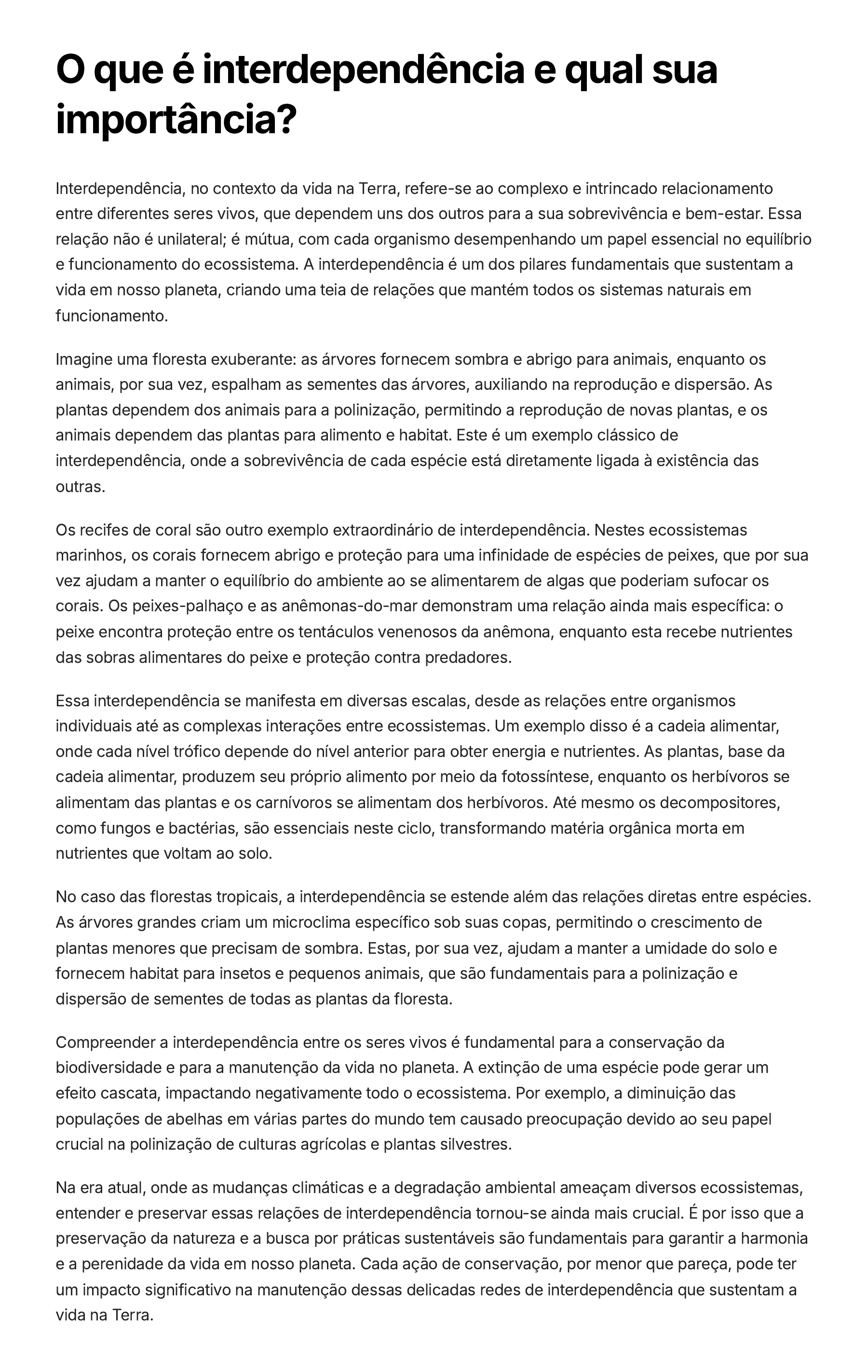 O que é interdependência e qual sua importância? Interdependência, no contexto da vida na Terra, refere-se ao complexo e intrincado relacionamento entre diferentes seres vivos, que dependem uns dos outros para a sua sobrevivência e bem-estar. Essa relação não é unilateral; é mútua, com cada organismo desempenhando um papel essencial no equilíbrio e funcionamento do ecossistema. A interdependência é um dos pilares fundamentais que sustentam a vida em nosso planeta, criando uma teia de relações que mantém todos os sistemas naturais em funcionamento. Imagine uma floresta exuberante: as árvores fornecem sombra e abrigo para animais, enquanto os animais, por sua vez, espalham as sementes das árvores, auxiliando na reprodução e dispersão. As plantas dependem dos animais para a polinização, permitindo a reprodução de novas plantas, e os animais dependem das plantas para alimento e habitat. Este é um exemplo clássico de interdependência, onde a sobrevivência de cada espécie está diretamente ligada à existência das outras. Os recifes de coral são outro exemplo extraordinário de interdependência. Nestes ecossistemas marinhos, os corais fornecem abrigo e proteção para uma infinidade de espécies de peixes, que por sua vez ajudam a manter o equilíbrio do ambiente ao se alimentarem de algas que poderiam sufocar os corais. Os peixes-palhaço e as anêmonas-do-mar demonstram uma relação ainda mais específica: o peixe encontra proteção entre os tentáculos venenosos da anêmona, enquanto esta recebe nutrientes das sobras alimentares do peixe e proteção contra predadores. Essa interdependência se manifesta em diversas escalas, desde as relações entre organismos individuais até as complexas interações entre ecossistemas. Um exemplo disso é a cadeia alimentar, onde cada nível trófico depende do nível anterior para obter energia e nutrientes. As plantas, base da cadeia alimentar, produzem seu próprio alimento por meio da fotossíntese, enquanto os herbívoros se alimentam das plantas e os carnívoros se alimentam dos herbívoros. Até mesmo os decompositores, como fungos e bactérias, são essenciais neste ciclo, transformando matéria orgânica morta em nutrientes que voltam ao solo. No caso das florestas tropicais, a interdependência se estende além das relações diretas entre espécies. As árvores grandes criam um microclima específico sob suas copas, permitindo o crescimento de plantas menores que precisam de sombra. Estas, por sua vez, ajudam a manter a umidade do solo e fornecem habitat para insetos e pequenos animais, que são fundamentais para a polinização e dispersão de sementes de todas as plantas da floresta. Compreender a interdependência entre os seres vivos é fundamental para a conservação da biodiversidade e para a manutenção da vida no planeta. A extinção de uma espécie pode gerar um efeito cascata, impactando negativamente todo o ecossistema. Por exemplo, a diminuição das populações de abelhas em várias partes do mundo tem causado preocupação devido ao seu papel crucial na polinização de culturas agrícolas e plantas silvestres. Na era atual, onde as mudanças climáticas e a degradação ambiental ameaçam diversos ecossistemas, entender e preservar essas relações de interdependência tornou-se ainda mais crucial. É por isso que a preservação da natureza e a busca por práticas sustentáveis são fundamentais para garantir a harmonia e a perenidade da vida em nosso planeta. Cada ação de conservação, por menor que pareça, pode ter um impacto significativo na manutenção dessas delicadas redes de interdependência que sustentam a vida na Terra.