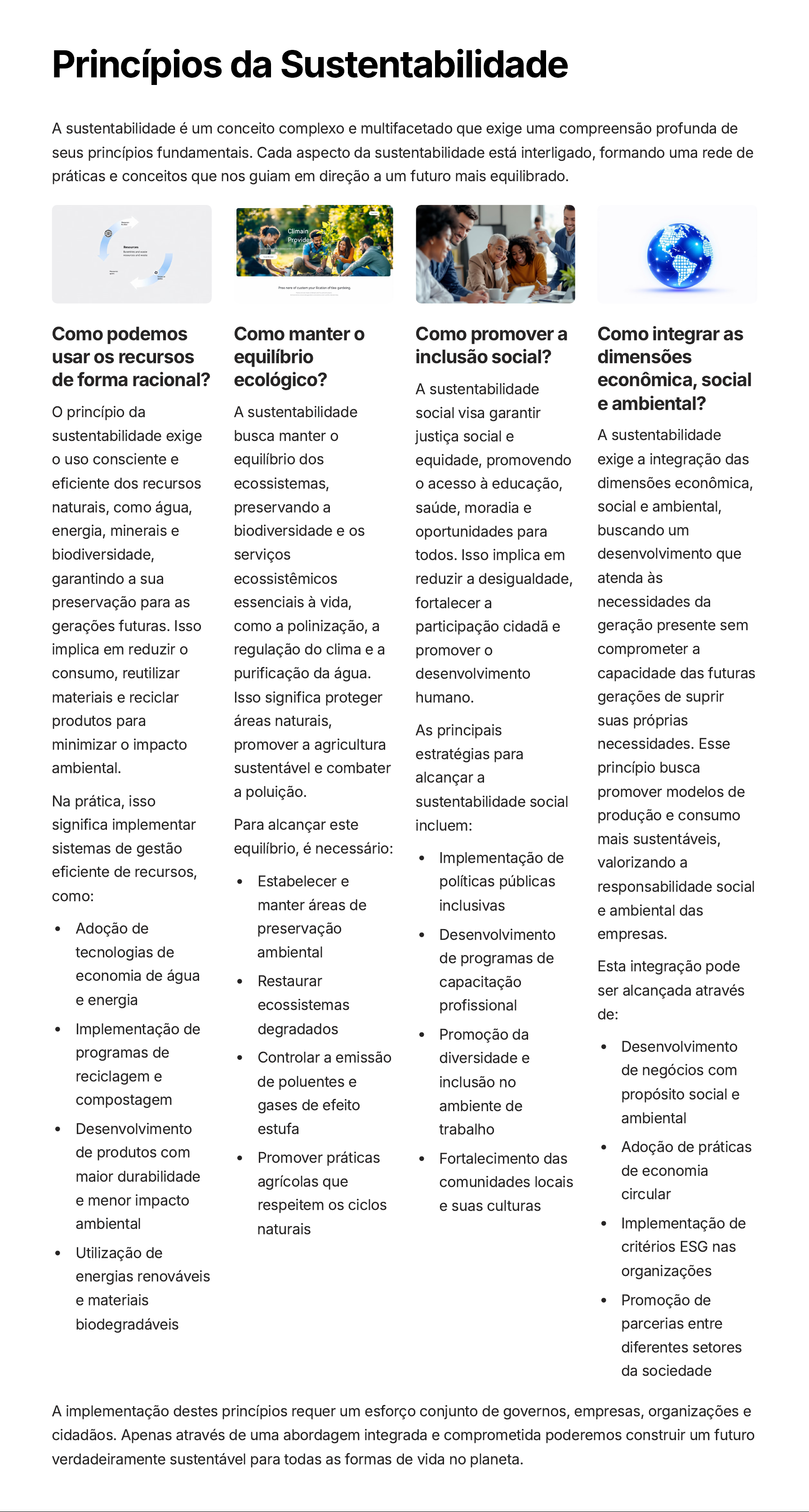 Princípios da Sustentabilidade A sustentabilidade é um conceito complexo e multifacetado que exige uma compreensão profunda de seus princípios fundamentais. Cada aspecto da sustentabilidade está interligado, formando uma rede de práticas e conceitos que nos guiam em direção a um futuro mais equilibrado. Como podemos usar os recursos de forma racional? O princípio da sustentabilidade exige o uso consciente e eficiente dos recursos naturais, como água, energia, minerais e biodiversidade, garantindo a sua preservação para as gerações futuras. Isso implica em reduzir o consumo, reutilizar materiais e reciclar produtos para minimizar o impacto ambiental. Na prática, isso significa implementar sistemas de gestão eficiente de recursos, como: Adoção de tecnologias de economia de água e energia Implementação de programas de reciclagem e compostagem Desenvolvimento de produtos com maior durabilidade e menor impacto ambiental Utilização de energias renováveis e materiais biodegradáveis Como manter o equilíbrio ecológico? A sustentabilidade busca manter o equilíbrio dos ecossistemas, preservando a biodiversidade e os serviços ecossistêmicos essenciais à vida, como a polinização, a regulação do clima e a purificação da água. Isso significa proteger áreas naturais, promover a agricultura sustentável e combater a poluição. Para alcançar este equilíbrio, é necessário: Estabelecer e manter áreas de preservação ambiental Restaurar ecossistemas degradados Controlar a emissão de poluentes e gases de efeito estufa Promover práticas agrícolas que respeitem os ciclos naturais Como promover a inclusão social? A sustentabilidade social visa garantir justiça social e equidade, promovendo o acesso à educação, saúde, moradia e oportunidades para todos. Isso implica em reduzir a desigualdade, fortalecer a participação cidadã e promover o desenvolvimento humano. As principais estratégias para alcançar a sustentabilidade social incluem: Implementação de políticas públicas inclusivas Desenvolvimento de programas de capacitação profissional Promoção da diversidade e inclusão no ambiente de trabalho Fortalecimento das comunidades locais e suas culturas Como integrar as dimensões econômica, social e ambiental? A sustentabilidade exige a integração das dimensões econômica, social e ambiental, buscando um desenvolvimento que atenda às necessidades da geração presente sem comprometer a capacidade das futuras gerações de suprir suas próprias necessidades. Esse princípio busca promover modelos de produção e consumo mais sustentáveis, valorizando a responsabilidade social e ambiental das empresas. Esta integração pode ser alcançada através de: Desenvolvimento de negócios com propósito social e ambiental Adoção de práticas de economia circular Implementação de critérios ESG nas organizações Promoção de parcerias entre diferentes setores da sociedade A implementação destes princípios requer um esforço conjunto de governos, empresas, organizações e cidadãos. Apenas através de uma abordagem integrada e comprometida poderemos construir um futuro verdadeiramente sustentável para todas as formas de vida no planeta.
