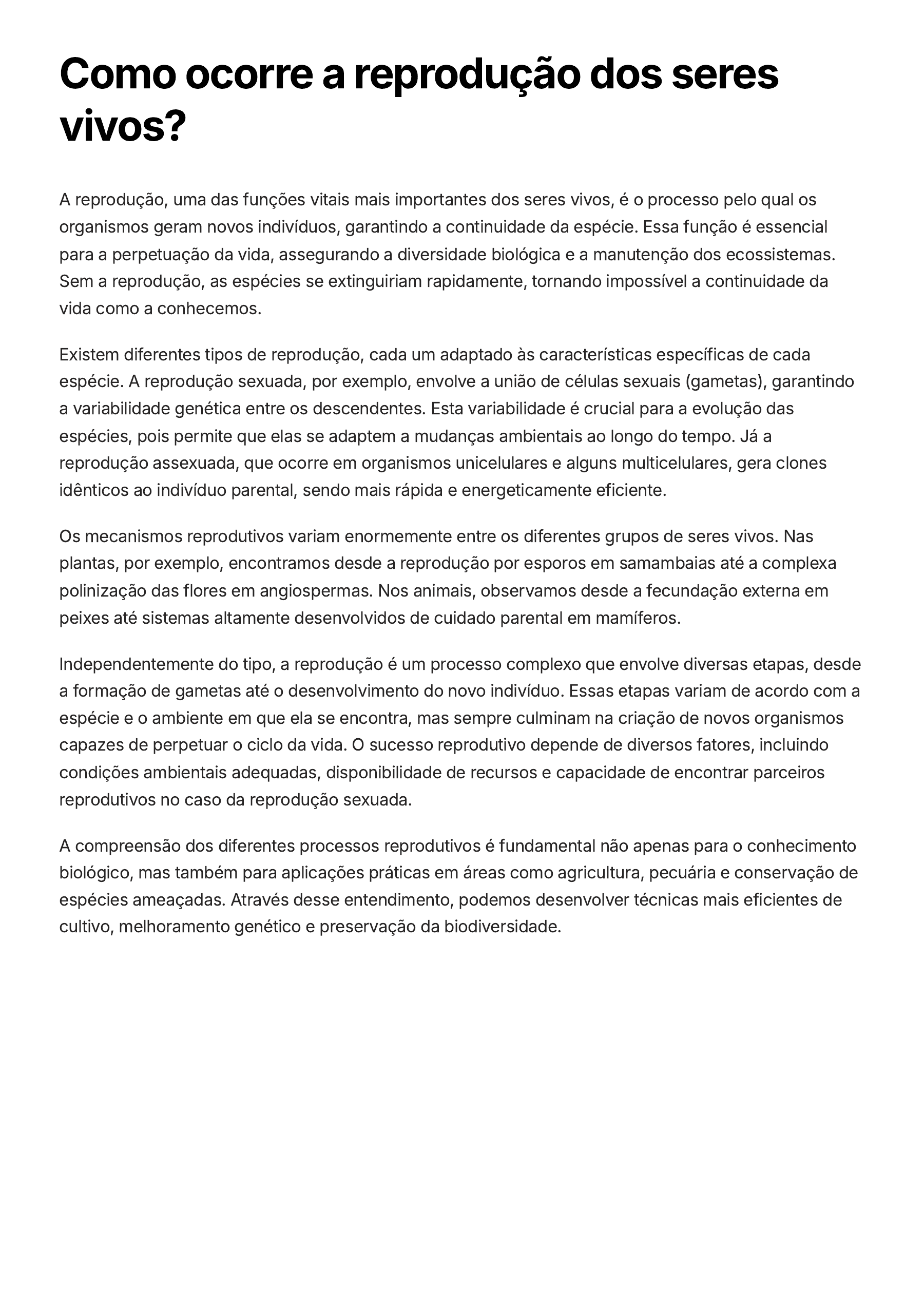 Como ocorre a reprodução dos seres vivos? A reprodução, uma das funções vitais mais importantes dos seres vivos, é o processo pelo qual os organismos geram novos indivíduos, garantindo a continuidade da espécie. Essa função é essencial para a perpetuação da vida, assegurando a diversidade biológica e a manutenção dos ecossistemas. Sem a reprodução, as espécies se extinguiriam rapidamente, tornando impossível a continuidade da vida como a conhecemos. Existem diferentes tipos de reprodução, cada um adaptado às características específicas de cada espécie. A reprodução sexuada, por exemplo, envolve a união de células sexuais (gametas), garantindo a variabilidade genética entre os descendentes. Esta variabilidade é crucial para a evolução das espécies, pois permite que elas se adaptem a mudanças ambientais ao longo do tempo. Já a reprodução assexuada, que ocorre em organismos unicelulares e alguns multicelulares, gera clones idênticos ao indivíduo parental, sendo mais rápida e energeticamente eficiente. Os mecanismos reprodutivos variam enormemente entre os diferentes grupos de seres vivos. Nas plantas, por exemplo, encontramos desde a reprodução por esporos em samambaias até a complexa polinização das flores em angiospermas. Nos animais, observamos desde a fecundação externa em peixes até sistemas altamente desenvolvidos de cuidado parental em mamíferos. Independentemente do tipo, a reprodução é um processo complexo que envolve diversas etapas, desde a formação de gametas até o desenvolvimento do novo indivíduo. Essas etapas variam de acordo com a espécie e o ambiente em que ela se encontra, mas sempre culminam na criação de novos organismos capazes de perpetuar o ciclo da vida. O sucesso reprodutivo depende de diversos fatores, incluindo condições ambientais adequadas, disponibilidade de recursos e capacidade de encontrar parceiros reprodutivos no caso da reprodução sexuada. A compreensão dos diferentes processos reprodutivos é fundamental não apenas para o conhecimento biológico, mas também para aplicações práticas em áreas como agricultura, pecuária e conservação de espécies ameaçadas. Através desse entendimento, podemos desenvolver técnicas mais eficientes de cultivo, melhoramento genético e preservação da biodiversidade.
