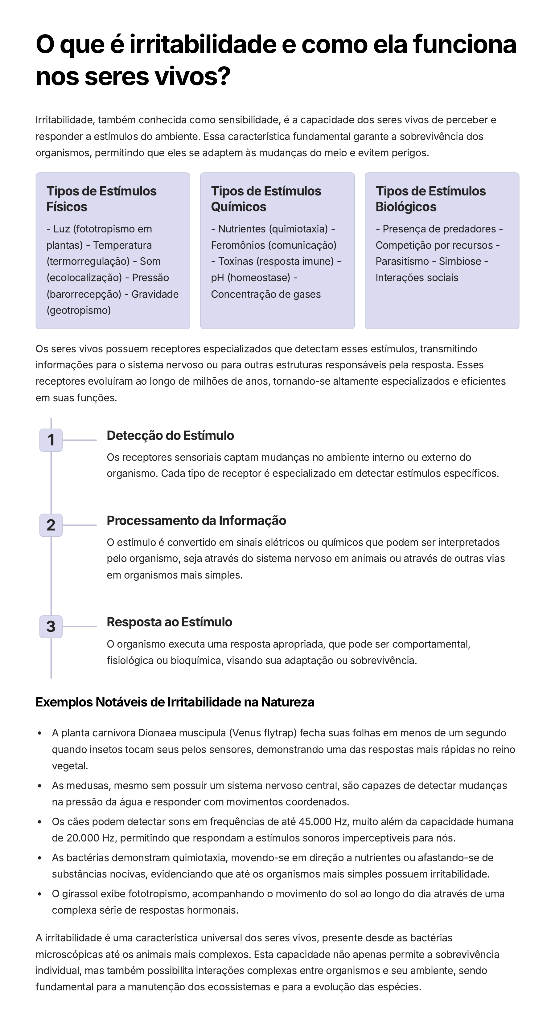 O que é irritabilidade e como ela funciona nos seres vivos? Irritabilidade, também conhecida como sensibilidade, é a capacidade dos seres vivos de perceber e responder a estímulos do ambiente. Essa característica fundamental garante a sobrevivência dos organismos, permitindo que eles se adaptem às mudanças do meio e evitem perigos. Tipos de Estímulos Físicos - Luz (fototropismo em plantas) - Temperatura (termorregulação) - Som (ecolocalização) - Pressão (barorrecepção) - Gravidade (geotropismo) Tipos de Estímulos Químicos - Nutrientes (quimiotaxia) - Feromônios (comunicação) - Toxinas (resposta imune) - pH (homeostase) - Concentração de gases Tipos de Estímulos Biológicos - Presença de predadores - Competição por recursos - Parasitismo - Simbiose - Interações sociais Os seres vivos possuem receptores especializados que detectam esses estímulos, transmitindo informações para o sistema nervoso ou para outras estruturas responsáveis pela resposta. Esses receptores evoluíram ao longo de milhões de anos, tornando-se altamente especializados e eficientes em suas funções. 1 Detecção do Estímulo Os receptores sensoriais captam mudanças no ambiente interno ou externo do organismo. Cada tipo de receptor é especializado em detectar estímulos específicos. 2 Processamento da Informação O estímulo é convertido em sinais elétricos ou químicos que podem ser interpretados pelo organismo, seja através do sistema nervoso em animais ou através de outras vias em organismos mais simples. 3 Resposta ao Estímulo O organismo executa uma resposta apropriada, que pode ser comportamental, fisiológica ou bioquímica, visando sua adaptação ou sobrevivência. Exemplos Notáveis de Irritabilidade na Natureza A planta carnívora Dionaea muscipula (Venus flytrap) fecha suas folhas em menos de um segundo quando insetos tocam seus pelos sensores, demonstrando uma das respostas mais rápidas no reino vegetal. As medusas, mesmo sem possuir um sistema nervoso central, são capazes de detectar mudanças na pressão da água e responder com movimentos coordenados. Os cães podem detectar sons em frequências de até 45.000 Hz, muito além da capacidade humana de 20.000 Hz, permitindo que respondam a estímulos sonoros imperceptíveis para nós. As bactérias demonstram quimiotaxia, movendo-se em direção a nutrientes ou afastando-se de substâncias nocivas, evidenciando que até os organismos mais simples possuem irritabilidade. O girassol exibe fototropismo, acompanhando o movimento do sol ao longo do dia através de uma complexa série de respostas hormonais. A irritabilidade é uma característica universal dos seres vivos, presente desde as bactérias microscópicas até os animais mais complexos. Esta capacidade não apenas permite a sobrevivência individual, mas também possibilita interações complexas entre organismos e seu ambiente, sendo fundamental para a manutenção dos ecossistemas e para a evolução das espécies.