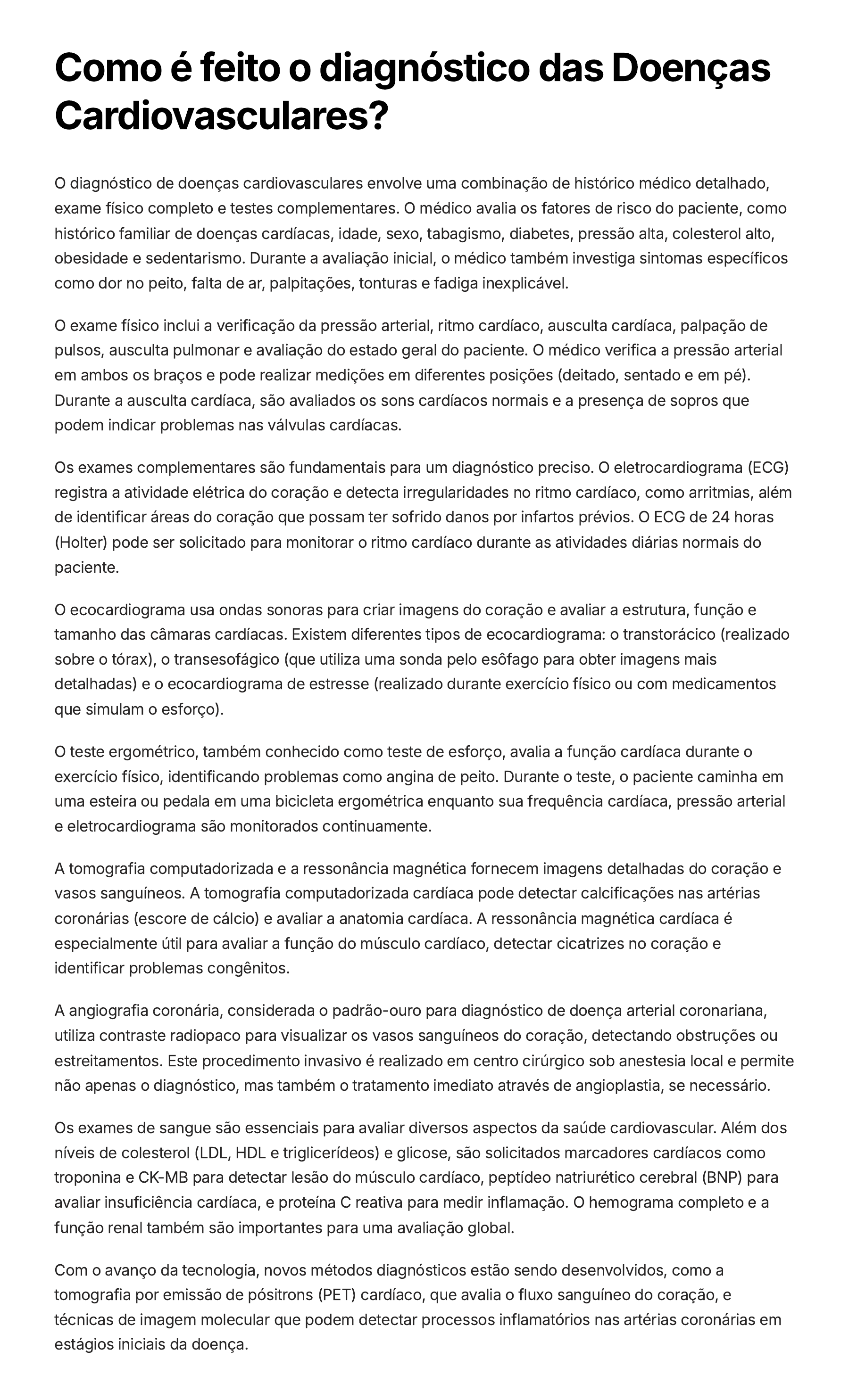 Como é feito o diagnóstico das Doenças Cardiovasculares? O diagnóstico de doenças cardiovasculares envolve uma combinação de histórico médico detalhado, exame físico completo e testes complementares. O médico avalia os fatores de risco do paciente, como histórico familiar de doenças cardíacas, idade, sexo, tabagismo, diabetes, pressão alta, colesterol alto, obesidade e sedentarismo. Durante a avaliação inicial, o médico também investiga sintomas específicos como dor no peito, falta de ar, palpitações, tonturas e fadiga inexplicável. O exame físico inclui a verificação da pressão arterial, ritmo cardíaco, ausculta cardíaca, palpação de pulsos, ausculta pulmonar e avaliação do estado geral do paciente. O médico verifica a pressão arterial em ambos os braços e pode realizar medições em diferentes posições (deitado, sentado e em pé). Durante a ausculta cardíaca, são avaliados os sons cardíacos normais e a presença de sopros que podem indicar problemas nas válvulas cardíacas. Os exames complementares são fundamentais para um diagnóstico preciso. O eletrocardiograma (ECG) registra a atividade elétrica do coração e detecta irregularidades no ritmo cardíaco, como arritmias, além de identificar áreas do coração que possam ter sofrido danos por infartos prévios. O ECG de 24 horas (Holter) pode ser solicitado para monitorar o ritmo cardíaco durante as atividades diárias normais do paciente. O ecocardiograma usa ondas sonoras para criar imagens do coração e avaliar a estrutura, função e tamanho das câmaras cardíacas. Existem diferentes tipos de ecocardiograma: o transtorácico (realizado sobre o tórax), o transesofágico (que utiliza uma sonda pelo esôfago para obter imagens mais detalhadas) e o ecocardiograma de estresse (realizado durante exercício físico ou com medicamentos que simulam o esforço). O teste ergométrico, também conhecido como teste de esforço, avalia a função cardíaca durante o exercício físico, identificando problemas como angina de peito. Durante o teste, o paciente caminha em uma esteira ou pedala em uma bicicleta ergométrica enquanto sua frequência cardíaca, pressão arterial e eletrocardiograma são monitorados continuamente. A tomografia computadorizada e a ressonância magnética fornecem imagens detalhadas do coração e vasos sanguíneos. A tomografia computadorizada cardíaca pode detectar calcificações nas artérias coronárias (escore de cálcio) e avaliar a anatomia cardíaca. A ressonância magnética cardíaca é especialmente útil para avaliar a função do músculo cardíaco, detectar cicatrizes no coração e identificar problemas congênitos. A angiografia coronária, considerada o padrão-ouro para diagnóstico de doença arterial coronariana, utiliza contraste radiopaco para visualizar os vasos sanguíneos do coração, detectando obstruções ou estreitamentos. Este procedimento invasivo é realizado em centro cirúrgico sob anestesia local e permite não apenas o diagnóstico, mas também o tratamento imediato através de angioplastia, se necessário. Os exames de sangue são essenciais para avaliar diversos aspectos da saúde cardiovascular. Além dos níveis de colesterol (LDL, HDL e triglicerídeos) e glicose, são solicitados marcadores cardíacos como troponina e CK-MB para detectar lesão do músculo cardíaco, peptídeo natriurético cerebral (BNP) para avaliar insuficiência cardíaca, e proteína C reativa para medir inflamação. O hemograma completo e a função renal também são importantes para uma avaliação global. Com o avanço da tecnologia, novos métodos diagnósticos estão sendo desenvolvidos, como a tomografia por emissão de pósitrons (PET) cardíaco, que avalia o fluxo sanguíneo do coração, e técnicas de imagem molecular que podem detectar processos inflamatórios nas artérias coronárias em estágios iniciais da doença.