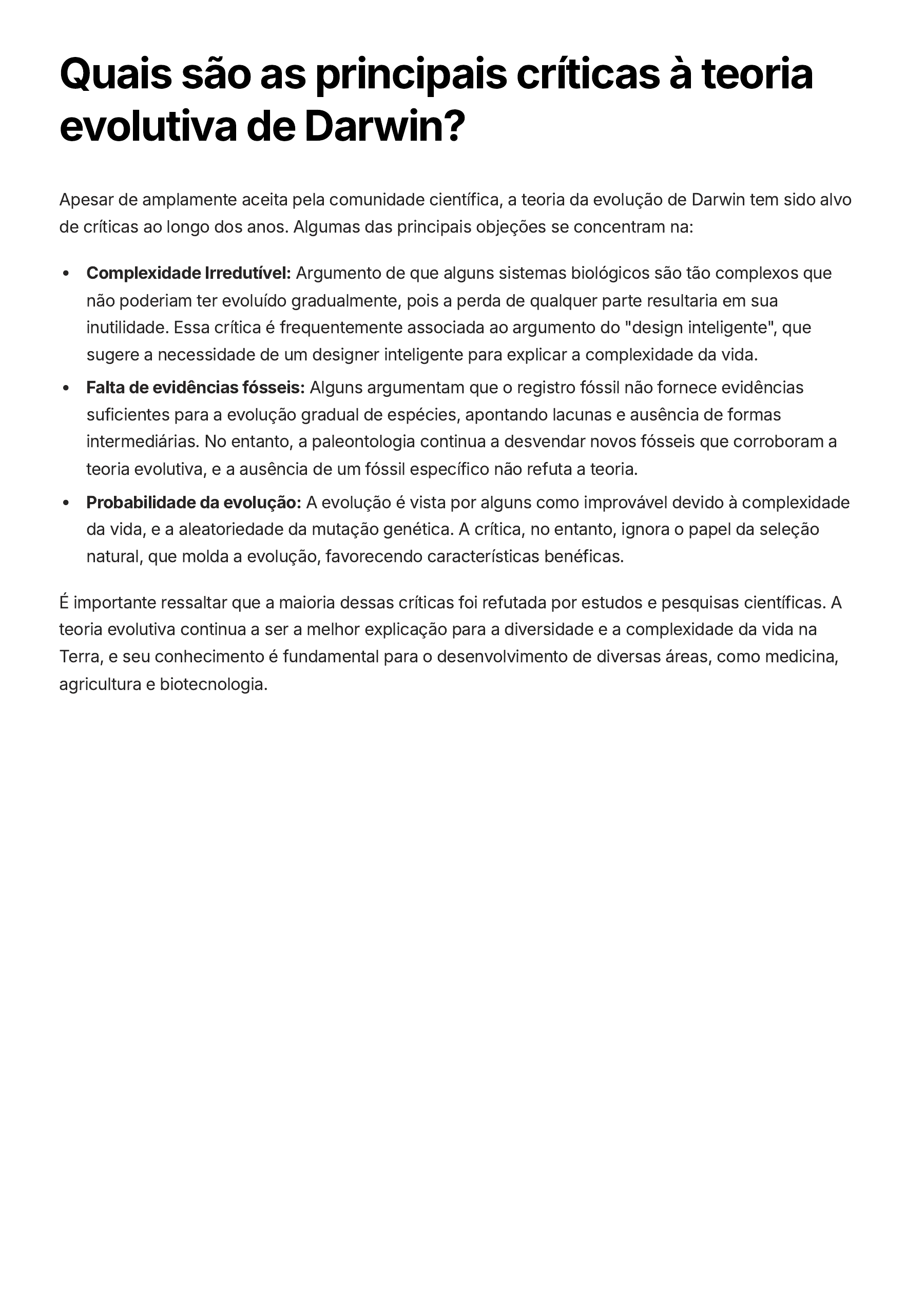 Quais são as principais críticas à teoria evolutiva de Darwin? Apesar de amplamente aceita pela comunidade científica, a teoria da evolução de Darwin tem sido alvo de críticas ao longo dos anos. Algumas das principais objeções se concentram na: Complexidade Irredutível: Argumento de que alguns sistemas biológicos são tão complexos que não poderiam ter evoluído gradualmente, pois a perda de qualquer parte resultaria em sua inutilidade. Essa crítica é frequentemente associada ao argumento do "design inteligente", que sugere a necessidade de um designer inteligente para explicar a complexidade da vida. Falta de evidências fósseis: Alguns argumentam que o registro fóssil não fornece evidências suficientes para a evolução gradual de espécies, apontando lacunas e ausência de formas intermediárias. No entanto, a paleontologia continua a desvendar novos fósseis que corroboram a teoria evolutiva, e a ausência de um fóssil específico não refuta a teoria. Probabilidade da evolução: A evolução é vista por alguns como improvável devido à complexidade da vida, e a aleatoriedade da mutação genética. A crítica, no entanto, ignora o papel da seleção natural, que molda a evolução, favorecendo características benéficas. É importante ressaltar que a maioria dessas críticas foi refutada por estudos e pesquisas científicas. A teoria evolutiva continua a ser a melhor explicação para a diversidade e a complexidade da vida na Terra, e seu conhecimento é fundamental para o desenvolvimento de diversas áreas, como medicina, agricultura e biotecnologia. Como Darwin Revolucionou a Ciência? As contribuições de Charles Darwin para a ciência foram revolucionárias e transformaram a forma como entendemos a vida na Terra. Sua teoria da evolução por seleção natural mudou o curso da biologia e influenciou campos como a genética, a medicina e a paleontologia. Darwin desafiou a crença dominante de que as espécies eram fixas e imutáveis, propondo que elas evoluem ao longo do tempo através de um processo de seleção natural. Essa ideia, baseada em suas observações durante a viagem do Beagle, revolucionou a biologia e abriu caminho para novas áreas de estudo. Sua obra principal, "A Origem das Espécies", publicada em 1859, detalha a teoria da seleção natural e suas implicações para a diversidade da vida. Ele argumentou que as espécies que se adaptam melhor ao ambiente têm maior probabilidade de sobreviver e reproduzir, transmitindo suas características vantajosas para as próximas gerações. Darwin também fez contribuições significativas para a compreensão da hereditariedade, embora não tenha compreendido totalmente os mecanismos moleculares da herança. Seus trabalhos sobre a variabilidade genética e a seleção natural lançaram as bases para o desenvolvimento da genética moderna. O legado de Darwin é duradouro, e sua teoria da evolução continua sendo a pedra angular da biologia moderna. Sua obra inspirou pesquisas em áreas como a genética, a evolução humana, a biodiversidade e a conservação da natureza. A compreensão da evolução é crucial para entendermos a vida na Terra e para enfrentarmos desafios como doenças emergentes e mudanças climáticas. Como a Teoria Evolutiva Impacta Nossa Vida Hoje? A teoria evolutiva de Darwin, proposta no século XIX, continua a ser um dos pilares fundamentais da biologia moderna. A compreensão da evolução é crucial para a resolução de diversos desafios contemporâneos, impactando áreas como a saúde, a agricultura e a conservação ambiental. Saúde: A teoria evolutiva é essencial para o desenvolvimento de medicamentos e tratamentos para doenças infecciosas, como vírus e bactérias, que evoluem constantemente. A compreensão dos mecanismos de seleção natural e adaptação permite o desenvolvimento de estratégias mais eficazes para combater esses patógenos. Agricultura: A evolução da resistência a herbicidas e pesticidas em plantas daninhas e pragas é um desafio para a agricultura moderna. A teoria evolutiva fornece as ferramentas para entender os mecanismos de seleção natural e resistência, permitindo o desenvolvimento de estratégias de controle mais eficientes e sustentáveis. Conservação Ambiental: A preservação da biodiversidade depende da compreensão da evolução das espécies e dos impactos das mudanças climáticas. A teoria evolutiva é fundamental para a criação de políticas de conservação eficazes e para a previsão dos impactos da perda de habitat e da introdução de espécies invasoras. Além dessas áreas, a teoria evolutiva também fornece uma base sólida para a compreensão da origem da vida, da diversidade biológica e da evolução humana. Ela serve como um guia para a pesquisa científica em áreas como a genética, a biologia molecular e a paleontologia, e contribui para a formação de cidadãos mais conscientes sobre a importância da biodiversidade e da preservação do meio ambiente.