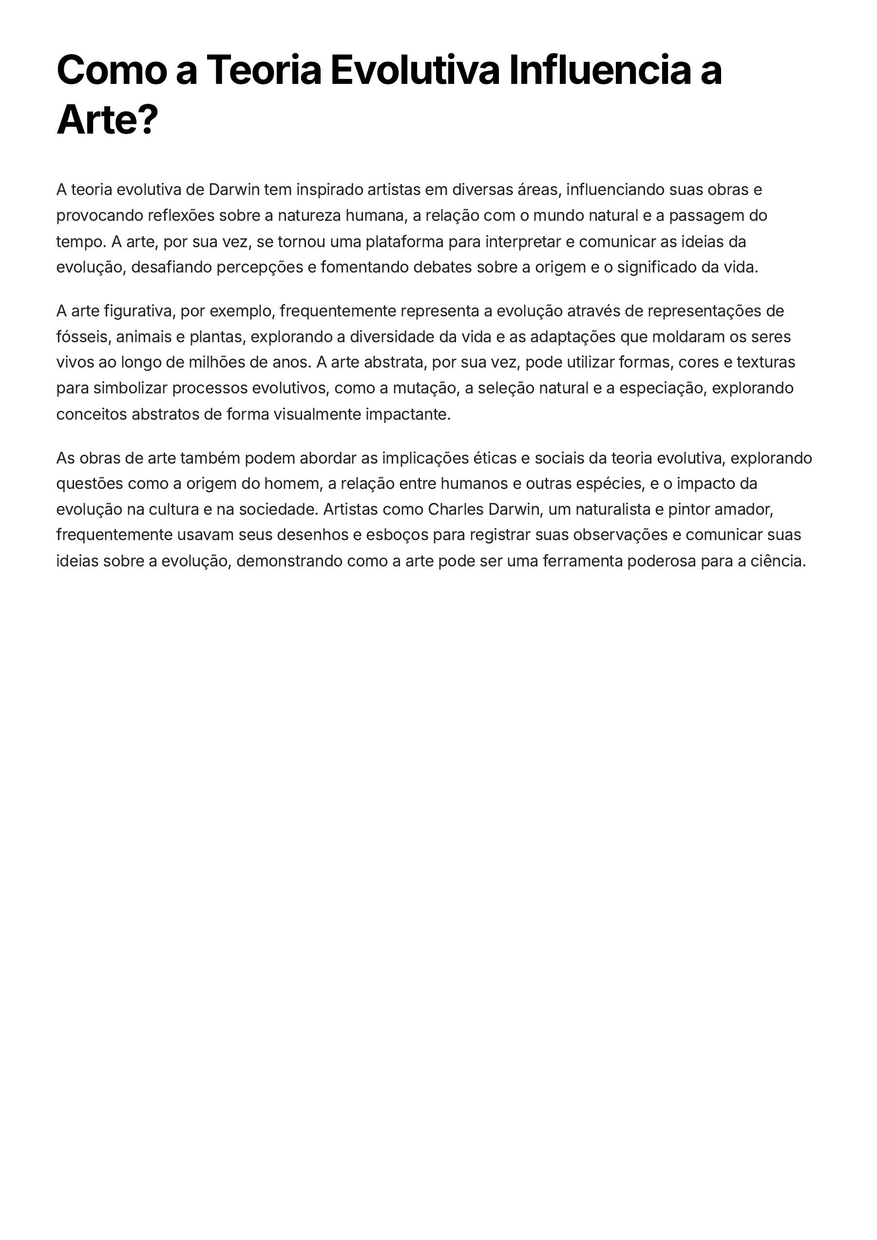 Como a Teoria Evolutiva Influencia a Arte? A teoria evolutiva de Darwin tem inspirado artistas em diversas áreas, influenciando suas obras e provocando reflexões sobre a natureza humana, a relação com o mundo natural e a passagem do tempo. A arte, por sua vez, se tornou uma plataforma para interpretar e comunicar as ideias da evolução, desafiando percepções e fomentando debates sobre a origem e o significado da vida. A arte figurativa, por exemplo, frequentemente representa a evolução através de representações de fósseis, animais e plantas, explorando a diversidade da vida e as adaptações que moldaram os seres vivos ao longo de milhões de anos. A arte abstrata, por sua vez, pode utilizar formas, cores e texturas para simbolizar processos evolutivos, como a mutação, a seleção natural e a especiação, explorando conceitos abstratos de forma visualmente impactante. As obras de arte também podem abordar as implicações éticas e sociais da teoria evolutiva, explorando questões como a origem do homem, a relação entre humanos e outras espécies, e o impacto da evolução na cultura e na sociedade. Artistas como Charles Darwin, um naturalista e pintor amador, frequentemente usavam seus desenhos e esboços para registrar suas observações e comunicar suas ideias sobre a evolução, demonstrando como a arte pode ser uma ferramenta poderosa para a ciência. Como a Teoria Evolutiva Influencia Nossa Cultura? A teoria evolutiva de Darwin tem profunda influência na cultura humana, impactando diversas áreas do conhecimento e da vida cotidiana. A compreensão da evolução molda a forma como vemos o mundo, desde a arte e a literatura até a medicina e a ética. De Que Forma a Evolução Inspira a Arte e a Literatura? A teoria evolutiva inspirou inúmeros artistas e escritores, influenciando suas obras de diversas maneiras. A ideia de que a vida é um processo contínuo de mudança e adaptação permeia a arte, expressando-se em formas, cores, temas e narrativas. A literatura, por sua vez, explora a luta pela sobrevivência, a adaptação ao ambiente e as consequências da seleção natural. A obra de Darwin também despertou discussões sobre a natureza humana e o lugar do homem no universo. A evolução da vida, incluindo a evolução humana, é frequentemente explorada em obras de ficção, desafiando crenças e valores tradicionais. Qual o Papel da Evolução na Medicina e na Ética? A teoria evolutiva é fundamental para a medicina, fornecendo a base para o desenvolvimento de medicamentos, tratamentos e vacinas. A compreensão da evolução de microrganismos permite o combate a doenças infecciosas e a criação de terapias mais eficazes. A ética, por sua vez, enfrenta desafios relacionados à evolução humana, como a bioengenharia e a manipulação genética. A teoria evolutiva impacta a cultura em todas as suas nuances. A compreensão da evolução nos permite questionar crenças, valores e a própria natureza humana. A evolução é um processo constante, e a cultura, como um reflexo da humanidade, também se adapta e evolui junto com ela. Como a teoria evolutiva impacta nossa sociedade? A teoria evolutiva de Darwin tem um impacto profundo na sociedade, moldando a maneira como compreendemos a vida, a natureza e nosso lugar no mundo. Suas ideias revolucionaram o pensamento científico, religioso e filosófico, e continuam a gerar debates e discussões acaloradas. Compreensão da diversidade humana: A teoria evolutiva explica a diversidade da vida na Terra, incluindo a diversidade humana. Compreender a evolução humana ajuda a combater o racismo e o preconceito, promovendo a igualdade e a justiça social. Aplicações em saúde pública: A compreensão da evolução de doenças e organismos patogênicos é essencial para o desenvolvimento de vacinas, medicamentos e estratégias de saúde pública eficazes. Preservação ambiental: A teoria evolutiva destaca a interdependência entre as espécies e os ecossistemas, incentivando a conservação da biodiversidade e o manejo sustentável dos recursos naturais. Educação: O ensino da teoria evolutiva nas escolas é crucial para a formação de cidadãos críticos e conscientes, capazes de tomar decisões informadas sobre questões complexas relacionadas à saúde, meio ambiente e sociedade. A teoria evolutiva oferece uma base científica para a compreensão da vida e da sociedade. Ela nos ajuda a enfrentar desafios contemporâneos como a saúde pública, a mudança climática e a desigualdade social, promovendo uma visão mais integrada e holística do mundo.