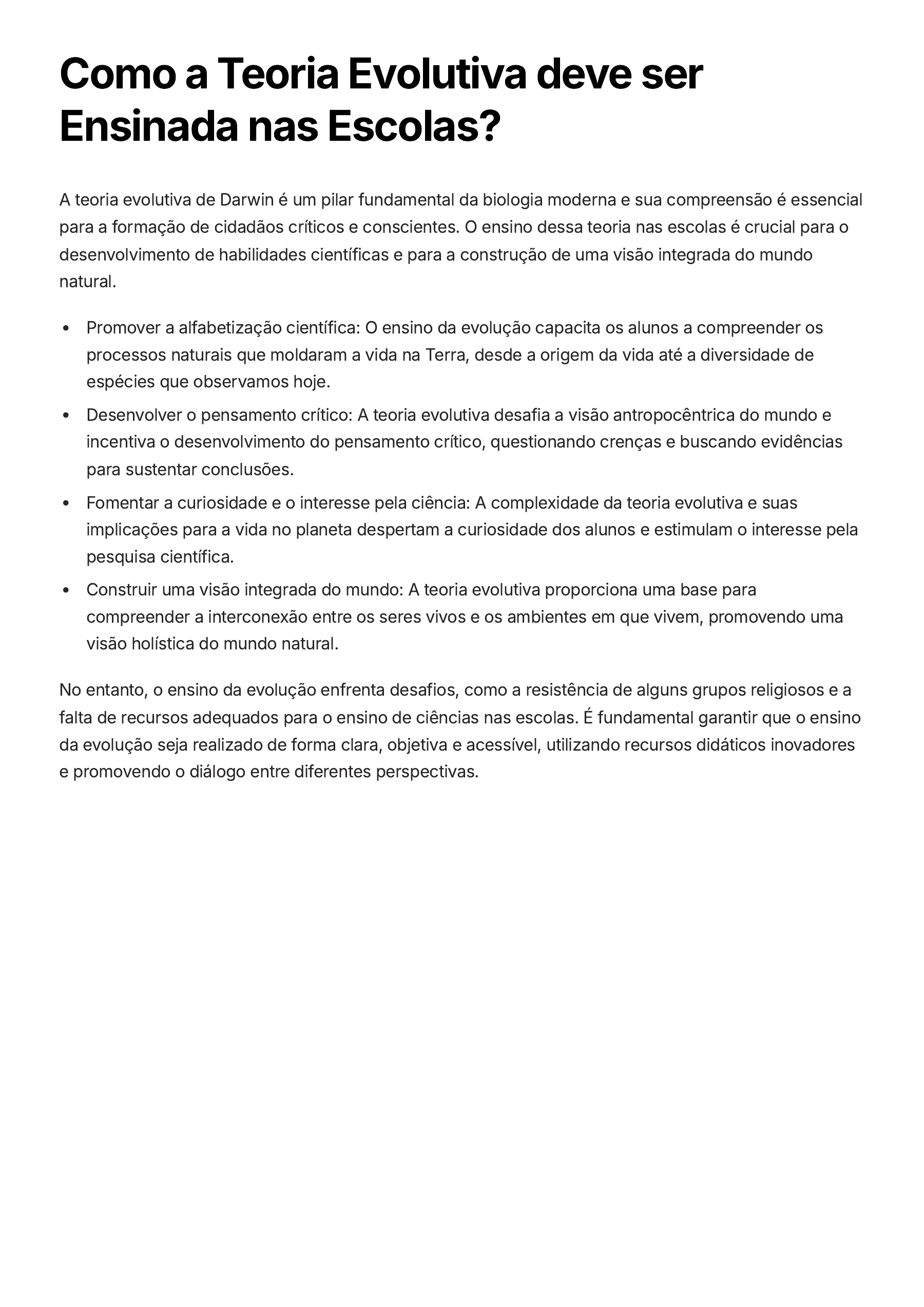 Como a Teoria Evolutiva deve ser Ensinada nas Escolas? A teoria evolutiva de Darwin é um pilar fundamental da biologia moderna e sua compreensão é essencial para a formação de cidadãos críticos e conscientes. O ensino dessa teoria nas escolas é crucial para o desenvolvimento de habilidades científicas e para a construção de uma visão integrada do mundo natural. Promover a alfabetização científica: O ensino da evolução capacita os alunos a compreender os processos naturais que moldaram a vida na Terra, desde a origem da vida até a diversidade de espécies que observamos hoje. Desenvolver o pensamento crítico: A teoria evolutiva desafia a visão antropocêntrica do mundo e incentiva o desenvolvimento do pensamento crítico, questionando crenças e buscando evidências para sustentar conclusões. Fomentar a curiosidade e o interesse pela ciência: A complexidade da teoria evolutiva e suas implicações para a vida no planeta despertam a curiosidade dos alunos e estimulam o interesse pela pesquisa científica. Construir uma visão integrada do mundo: A teoria evolutiva proporciona uma base para compreender a interconexão entre os seres vivos e os ambientes em que vivem, promovendo uma visão holística do mundo natural. No entanto, o ensino da evolução enfrenta desafios, como a resistência de alguns grupos religiosos e a falta de recursos adequados para o ensino de ciências nas escolas. É fundamental garantir que o ensino da evolução seja realizado de forma clara, objetiva e acessível, utilizando recursos didáticos inovadores e promovendo o diálogo entre diferentes perspectivas. Quais são as principais controvérsias envolvendo a teoria evolutiva? A teoria evolutiva de Darwin, apesar de amplamente aceita pela comunidade científica, ainda suscita controvérsias em alguns setores da sociedade. Um dos principais pontos de discórdia é a incompatibilidade percebida entre a evolução biológica e crenças religiosas, principalmente as que defendem a criação divina. Algumas pessoas interpretam a teoria evolutiva como uma ameaça à fé, enquanto outras acreditam que a ciência e a religião podem coexistir harmoniosamente. Outra controvérsia diz respeito à interpretação da evolução como um processo aleatório e sem propósito. Para alguns, a complexidade e a organização do mundo natural sugerem a existência de um design inteligente, desafiando a ideia de que a vida surgiu por acaso. A discussão sobre a inteligência artificial e a possibilidade de vida extraterrestre também alimentam essa polêmica. No campo educacional, a teoria evolutiva tem sido alvo de debates acalorados sobre o seu ensino em escolas. Grupos religiosos, em alguns países, defendem a inclusão do criacionismo como alternativa científica à evolução, o que gera conflitos entre o ensino científico e a liberdade religiosa. Apesar das controvérsias, a teoria evolutiva permanece como o modelo científico mais abrangente e consistente para explicar a origem e a diversidade da vida na Terra. Pesquisas científicas continuam a fortalecer essa teoria, revelando novas evidências e aprofundando o nosso entendimento sobre a história evolutiva dos seres vivos. Como a teoria evolutiva se relaciona com a religião? A relação entre a teoria evolutiva de Darwin e a religião é complexa e frequentemente fonte de debates acalorados. Muitas religiões interpretam a criação do mundo e dos seres vivos de forma literal, o que entra em conflito com a explicação científica da evolução. Para alguns, a crença em um criador divino e a aceitação da evolução não são mutuamente excludentes. A evolução pode ser vista como o mecanismo pelo qual o Criador criou a diversidade da vida. Outros consideram a evolução uma ameaça à fé, pois questiona a ideia de um Deus que criou o mundo e os seres vivos exatamente como são. Algumas denominações religiosas têm se adaptado à teoria evolutiva, interpretando os textos sagrados de forma mais abrangente e buscando conciliar as explicações científicas com suas crenças. Em contrapartida, outras se mantêm firmes em suas interpretações tradicionais, defendendo a literalidade dos textos sagrados e rejeitando a teoria da evolução. É importante lembrar que a ciência e a religião abordam diferentes aspectos da realidade. A ciência busca compreender o mundo natural por meio de observações, experimentações e teorias. A religião, por outro lado, lida com questões espirituais, existenciais e de fé.