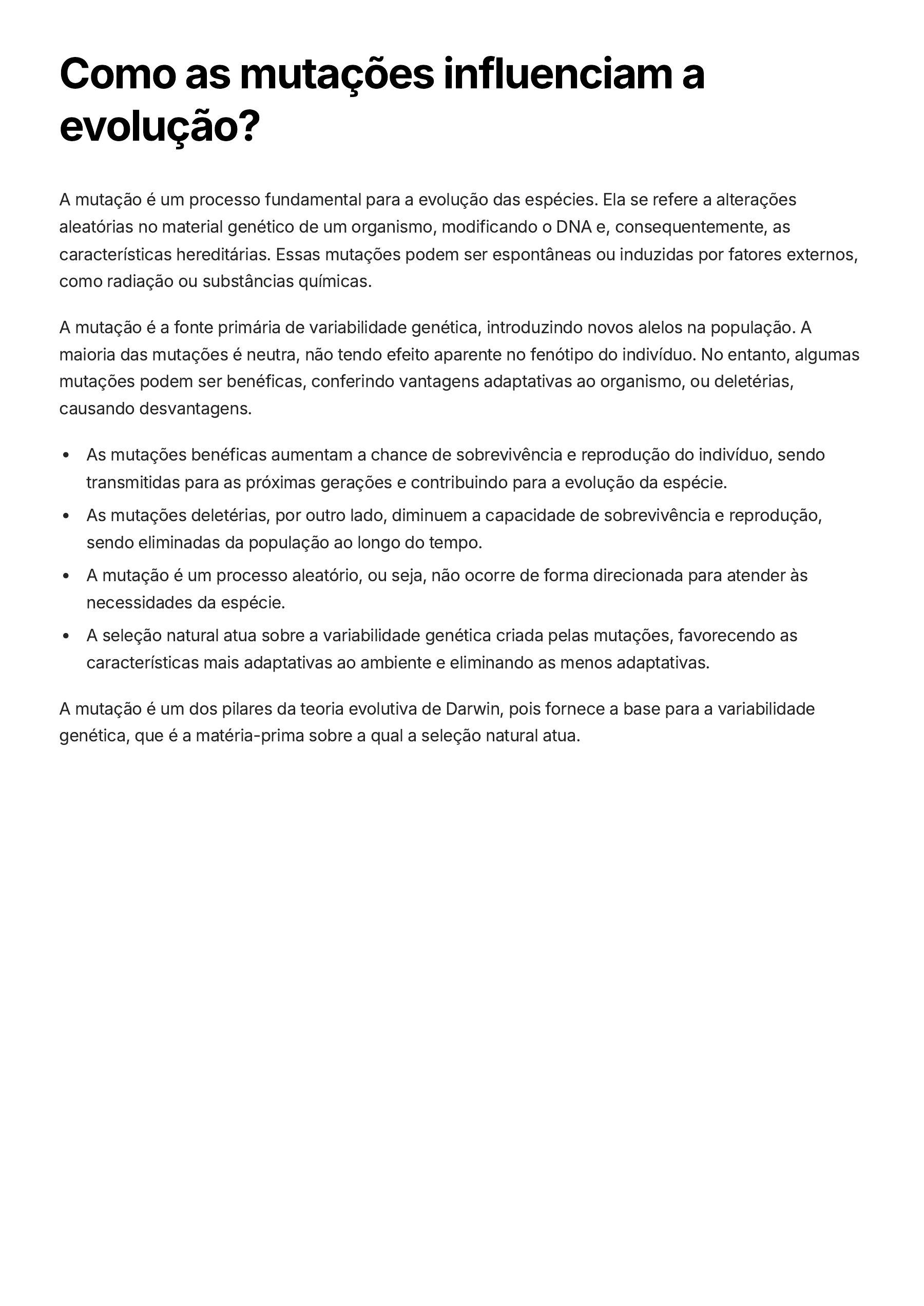 Como as mutações influenciam a evolução? A mutação é um processo fundamental para a evolução das espécies. Ela se refere a alterações aleatórias no material genético de um organismo, modificando o DNA e, consequentemente, as características hereditárias. Essas mutações podem ser espontâneas ou induzidas por fatores externos, como radiação ou substâncias químicas. A mutação é a fonte primária de variabilidade genética, introduzindo novos alelos na população. A maioria das mutações é neutra, não tendo efeito aparente no fenótipo do indivíduo. No entanto, algumas mutações podem ser benéficas, conferindo vantagens adaptativas ao organismo, ou deletérias, causando desvantagens. As mutações benéficas aumentam a chance de sobrevivência e reprodução do indivíduo, sendo transmitidas para as próximas gerações e contribuindo para a evolução da espécie. As mutações deletérias, por outro lado, diminuem a capacidade de sobrevivência e reprodução, sendo eliminadas da população ao longo do tempo. A mutação é um processo aleatório, ou seja, não ocorre de forma direcionada para atender às necessidades da espécie. A seleção natural atua sobre a variabilidade genética criada pelas mutações, favorecendo as características mais adaptativas ao ambiente e eliminando as menos adaptativas. A mutação é um dos pilares da teoria evolutiva de Darwin, pois fornece a base para a variabilidade genética, que é a matéria-prima sobre a qual a seleção natural atua. Como a Recombinação Genética Influencia a Evolução? A recombinação genética é um processo fundamental que contribui para a variabilidade genética dentro de uma população, sendo um motor crucial da evolução. Ela ocorre durante a reprodução sexuada, quando os cromossomos dos pais são combinados para formar um novo conjunto de cromossomos na prole. Essa troca de material genético entre cromossomos homólogos, chamada de "crossing over", gera novas combinações de genes, aumentando a diversidade genética. Essa diversidade é crucial para a adaptação das espécies a ambientes em constante mudança. A recombinação genética aumenta a variabilidade genética, fornecendo mais opções para a seleção natural agir. Ela permite que características benéficas se espalhem mais rapidamente pela população. A recombinação também pode levar à criação de novas características, promovendo a adaptação e a evolução. Em resumo, a recombinação genética é um processo essencial para a evolução, fornecendo a base para a diversidade genética que permite que as espécies se adaptem e evoluam ao longo do tempo. Como a Deriva Genética Influencia a Evolução das Espécies? A deriva genética é um dos principais mecanismos da evolução, atuando como uma força aleatória que pode mudar as frequências dos alelos em uma população ao longo do tempo. Este processo ocorre devido a eventos aleatórios, como a morte de indivíduos por causas não relacionadas à seleção natural, ou a reprodução aleatória, que podem levar à perda ou ao aumento da frequência de certos genes. A deriva genética tem um impacto maior em populações menores, onde a perda ou o ganho de um único indivíduo pode causar mudanças significativas na frequência genética. Efeitos da Deriva Genética A deriva genética pode ter efeitos significativos na evolução das espécies, incluindo a perda de variabilidade genética, o aumento da homozigosidade e a fixação de alelos. Em populações pequenas, a perda de variabilidade genética pode tornar as espécies mais vulneráveis a mudanças ambientais, doenças ou outros desafios. A deriva genética também pode levar à fixação de alelos, ou seja, a eliminação de todos os alelos alternativos, o que pode levar à perda de características importantes para a sobrevivência da espécie. No entanto, a deriva genética também pode ser uma força criativa na evolução, levando à diversificação de espécies e à adaptação a novos ambientes. Em alguns casos, a deriva genética pode promover a fixação de alelos que são benéficos em ambientes específicos, conduzindo à especiação e à evolução de novas adaptações.