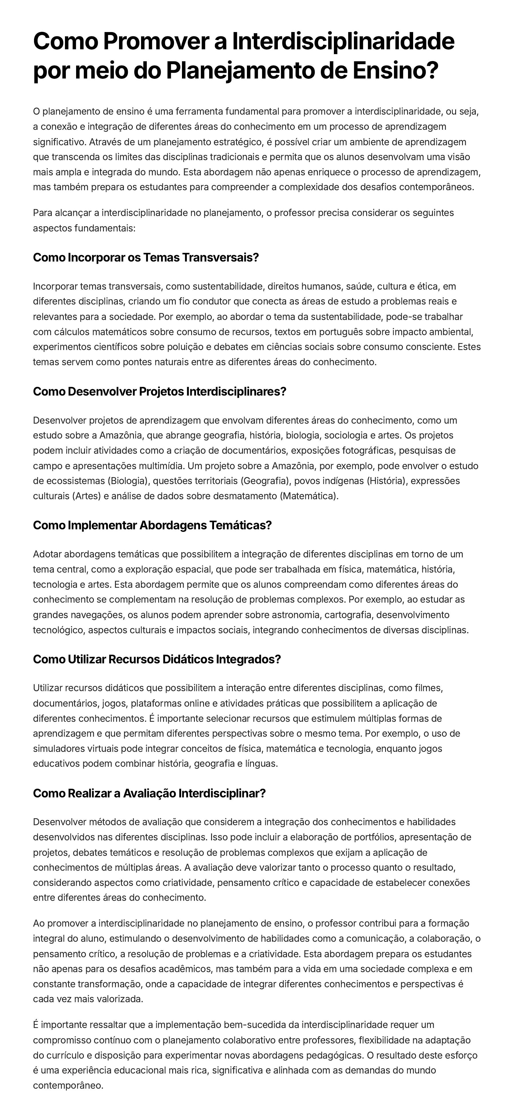Como Promover a Interdisciplinaridade por meio do Planejamento de Ensino? O planejamento de ensino é uma ferramenta fundamental para promover a interdisciplinaridade, ou seja, a conexão e integração de diferentes áreas do conhecimento em um processo de aprendizagem significativo. Através de um planejamento estratégico, é possível criar um ambiente de aprendizagem que transcenda os limites das disciplinas tradicionais e permita que os alunos desenvolvam uma visão mais ampla e integrada do mundo. Esta abordagem não apenas enriquece o processo de aprendizagem, mas também prepara os estudantes para compreender a complexidade dos desafios contemporâneos. Para alcançar a interdisciplinaridade no planejamento, o professor precisa considerar os seguintes aspectos fundamentais: Como Incorporar os Temas Transversais? Incorporar temas transversais, como sustentabilidade, direitos humanos, saúde, cultura e ética, em diferentes disciplinas, criando um fio condutor que conecta as áreas de estudo a problemas reais e relevantes para a sociedade. Por exemplo, ao abordar o tema da sustentabilidade, pode-se trabalhar com cálculos matemáticos sobre consumo de recursos, textos em português sobre impacto ambiental, experimentos científicos sobre poluição e debates em ciências sociais sobre consumo consciente. Estes temas servem como pontes naturais entre as diferentes áreas do conhecimento. Como Desenvolver Projetos Interdisciplinares? Desenvolver projetos de aprendizagem que envolvam diferentes áreas do conhecimento, como um estudo sobre a Amazônia, que abrange geografia, história, biologia, sociologia e artes. Os projetos podem incluir atividades como a criação de documentários, exposições fotográficas, pesquisas de campo e apresentações multimídia. Um projeto sobre a Amazônia, por exemplo, pode envolver o estudo de ecossistemas (Biologia), questões territoriais (Geografia), povos indígenas (História), expressões culturais (Artes) e análise de dados sobre desmatamento (Matemática). Como Implementar Abordagens Temáticas? Adotar abordagens temáticas que possibilitem a integração de diferentes disciplinas em torno de um tema central, como a exploração espacial, que pode ser trabalhada em física, matemática, história, tecnologia e artes. Esta abordagem permite que os alunos compreendam como diferentes áreas do conhecimento se complementam na resolução de problemas complexos. Por exemplo, ao estudar as grandes navegações, os alunos podem aprender sobre astronomia, cartografia, desenvolvimento tecnológico, aspectos culturais e impactos sociais, integrando conhecimentos de diversas disciplinas. Como Utilizar Recursos Didáticos Integrados? Utilizar recursos didáticos que possibilitem a interação entre diferentes disciplinas, como filmes, documentários, jogos, plataformas online e atividades práticas que possibilitem a aplicação de diferentes conhecimentos. É importante selecionar recursos que estimulem múltiplas formas de aprendizagem e que permitam diferentes perspectivas sobre o mesmo tema. Por exemplo, o uso de simuladores virtuais pode integrar conceitos de física, matemática e tecnologia, enquanto jogos educativos podem combinar história, geografia e línguas. Como Realizar a Avaliação Interdisciplinar? Desenvolver métodos de avaliação que considerem a integração dos conhecimentos e habilidades desenvolvidos nas diferentes disciplinas. Isso pode incluir a elaboração de portfólios, apresentação de projetos, debates temáticos e resolução de problemas complexos que exijam a aplicação de conhecimentos de múltiplas áreas. A avaliação deve valorizar tanto o processo quanto o resultado, considerando aspectos como criatividade, pensamento crítico e capacidade de estabelecer conexões entre diferentes áreas do conhecimento. Ao promover a interdisciplinaridade no planejamento de ensino, o professor contribui para a formação integral do aluno, estimulando o desenvolvimento de habilidades como a comunicação, a colaboração, o pensamento crítico, a resolução de problemas e a criatividade. Esta abordagem prepara os estudantes não apenas para os desafios acadêmicos, mas também para a vida em uma sociedade complexa e em constante transformação, onde a capacidade de integrar diferentes conhecimentos e perspectivas é cada vez mais valorizada. É importante ressaltar que a implementação bem-sucedida da interdisciplinaridade requer um compromisso contínuo com o planejamento colaborativo entre professores, flexibilidade na adaptação do currículo e disposição para experimentar novas abordagens pedagógicas. O resultado deste esforço é uma experiência educacional mais rica, significativa e alinhada com as demandas do mundo contemporâneo.