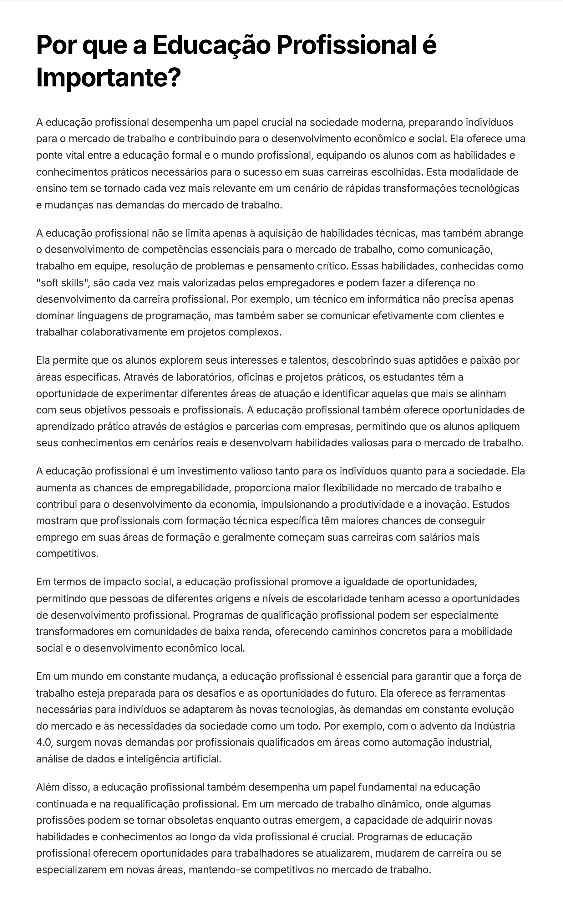 Por que a Educação Profissional é Importante? A educação profissional desempenha um papel crucial na sociedade moderna, preparando indivíduos para o mercado de trabalho e contribuindo para o desenvolvimento econômico e social. Ela oferece uma ponte vital entre a educação formal e o mundo profissional, equipando os alunos com as habilidades e conhecimentos práticos necessários para o sucesso em suas carreiras escolhidas. Esta modalidade de ensino tem se tornado cada vez mais relevante em um cenário de rápidas transformações tecnológicas e mudanças nas demandas do mercado de trabalho. A educação profissional não se limita apenas à aquisição de habilidades técnicas, mas também abrange o desenvolvimento de competências essenciais para o mercado de trabalho, como comunicação, trabalho em equipe, resolução de problemas e pensamento crítico. Essas habilidades, conhecidas como "soft skills", são cada vez mais valorizadas pelos empregadores e podem fazer a diferença no desenvolvimento da carreira profissional. Por exemplo, um técnico em informática não precisa apenas dominar linguagens de programação, mas também saber se comunicar efetivamente com clientes e trabalhar colaborativamente em projetos complexos. Ela permite que os alunos explorem seus interesses e talentos, descobrindo suas aptidões e paixão por áreas específicas. Através de laboratórios, oficinas e projetos práticos, os estudantes têm a oportunidade de experimentar diferentes áreas de atuação e identificar aquelas que mais se alinham com seus objetivos pessoais e profissionais. A educação profissional também oferece oportunidades de aprendizado prático através de estágios e parcerias com empresas, permitindo que os alunos apliquem seus conhecimentos em cenários reais e desenvolvam habilidades valiosas para o mercado de trabalho. A educação profissional é um investimento valioso tanto para os indivíduos quanto para a sociedade. Ela aumenta as chances de empregabilidade, proporciona maior flexibilidade no mercado de trabalho e contribui para o desenvolvimento da economia, impulsionando a produtividade e a inovação. Estudos mostram que profissionais com formação técnica específica têm maiores chances de conseguir emprego em suas áreas de formação e geralmente começam suas carreiras com salários mais competitivos. Em termos de impacto social, a educação profissional promove a igualdade de oportunidades, permitindo que pessoas de diferentes origens e níveis de escolaridade tenham acesso a oportunidades de desenvolvimento profissional. Programas de qualificação profissional podem ser especialmente transformadores em comunidades de baixa renda, oferecendo caminhos concretos para a mobilidade social e o desenvolvimento econômico local. Em um mundo em constante mudança, a educação profissional é essencial para garantir que a força de trabalho esteja preparada para os desafios e as oportunidades do futuro. Ela oferece as ferramentas necessárias para indivíduos se adaptarem às novas tecnologias, às demandas em constante evolução do mercado e às necessidades da sociedade como um todo. Por exemplo, com o advento da Indústria 4.0, surgem novas demandas por profissionais qualificados em áreas como automação industrial, análise de dados e inteligência artificial. Além disso, a educação profissional também desempenha um papel fundamental na educação continuada e na requalificação profissional. Em um mercado de trabalho dinâmico, onde algumas profissões podem se tornar obsoletas enquanto outras emergem, a capacidade de adquirir novas habilidades e conhecimentos ao longo da vida profissional é crucial. Programas de educação profissional oferecem oportunidades para trabalhadores se atualizarem, mudarem de carreira ou se especializarem em novas áreas, mantendo-se competitivos no mercado de trabalho.