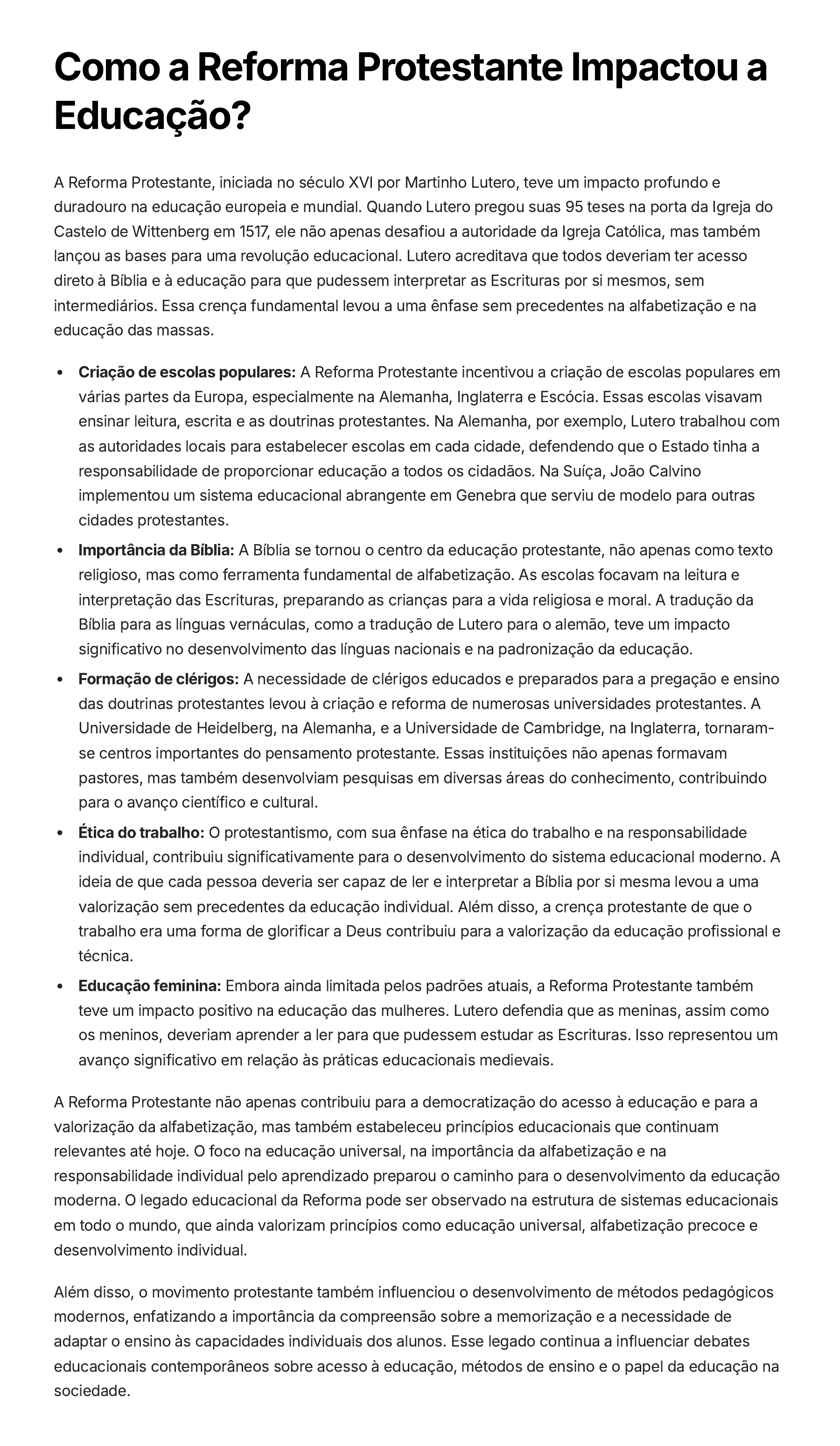 Como a Reforma Protestante Impactou a Educação? A Reforma Protestante, iniciada no século XVI por Martinho Lutero, teve um impacto profundo e duradouro na educação europeia e mundial. Quando Lutero pregou suas 95 teses na porta da Igreja do Castelo de Wittenberg em 1517, ele não apenas desafiou a autoridade da Igreja Católica, mas também lançou as bases para uma revolução educacional. Lutero acreditava que todos deveriam ter acesso direto à Bíblia e à educação para que pudessem interpretar as Escrituras por si mesmos, sem intermediários. Essa crença fundamental levou a uma ênfase sem precedentes na alfabetização e na educação das massas. Criação de escolas populares: A Reforma Protestante incentivou a criação de escolas populares em várias partes da Europa, especialmente na Alemanha, Inglaterra e Escócia. Essas escolas visavam ensinar leitura, escrita e as doutrinas protestantes. Na Alemanha, por exemplo, Lutero trabalhou com as autoridades locais para estabelecer escolas em cada cidade, defendendo que o Estado tinha a responsabilidade de proporcionar educação a todos os cidadãos. Na Suíça, João Calvino implementou um sistema educacional abrangente em Genebra que serviu de modelo para outras cidades protestantes. Importância da Bíblia: A Bíblia se tornou o centro da educação protestante, não apenas como texto religioso, mas como ferramenta fundamental de alfabetização. As escolas focavam na leitura e interpretação das Escrituras, preparando as crianças para a vida religiosa e moral. A tradução da Bíblia para as línguas vernáculas, como a tradução de Lutero para o alemão, teve um impacto significativo no desenvolvimento das línguas nacionais e na padronização da educação. Formação de clérigos: A necessidade de clérigos educados e preparados para a pregação e ensino das doutrinas protestantes levou à criação e reforma de numerosas universidades protestantes. A Universidade de Heidelberg, na Alemanha, e a Universidade de Cambridge, na Inglaterra, tornaram- se centros importantes do pensamento protestante. Essas instituições não apenas formavam pastores, mas também desenvolviam pesquisas em diversas áreas do conhecimento, contribuindo para o avanço científico e cultural. Ética do trabalho: O protestantismo, com sua ênfase na ética do trabalho e na responsabilidade individual, contribuiu significativamente para o desenvolvimento do sistema educacional moderno. A ideia de que cada pessoa deveria ser capaz de ler e interpretar a Bíblia por si mesma levou a uma valorização sem precedentes da educação individual. Além disso, a crença protestante de que o trabalho era uma forma de glorificar a Deus contribuiu para a valorização da educação profissional e técnica. Educação feminina: Embora ainda limitada pelos padrões atuais, a Reforma Protestante também teve um impacto positivo na educação das mulheres. Lutero defendia que as meninas, assim como os meninos, deveriam aprender a ler para que pudessem estudar as Escrituras. Isso representou um avanço significativo em relação às práticas educacionais medievais. A Reforma Protestante não apenas contribuiu para a democratização do acesso à educação e para a valorização da alfabetização, mas também estabeleceu princípios educacionais que continuam relevantes até hoje. O foco na educação universal, na importância da alfabetização e na responsabilidade individual pelo aprendizado preparou o caminho para o desenvolvimento da educação moderna. O legado educacional da Reforma pode ser observado na estrutura de sistemas educacionais em todo o mundo, que ainda valorizam princípios como educação universal, alfabetização precoce e desenvolvimento individual. Além disso, o movimento protestante também influenciou o desenvolvimento de métodos pedagógicos modernos, enfatizando a importância da compreensão sobre a memorização e a necessidade de adaptar o ensino às capacidades individuais dos alunos. Esse legado continua a influenciar debates educacionais contemporâneos sobre acesso à educação, métodos de ensino e o papel da educação na sociedade.