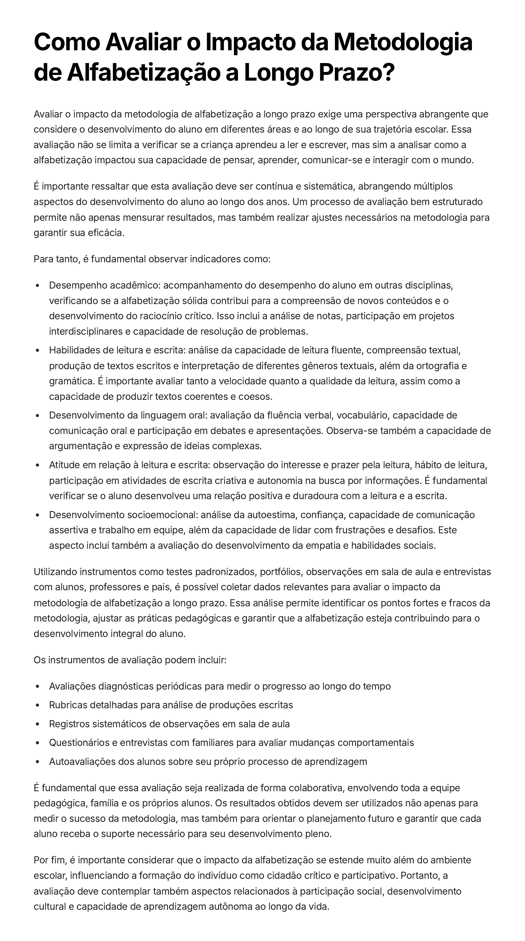 Como Avaliar o Impacto da Metodologia de Alfabetização a Longo Prazo? Avaliar o impacto da metodologia de alfabetização a longo prazo exige uma perspectiva abrangente que considere o desenvolvimento do aluno em diferentes áreas e ao longo de sua trajetória escolar. Essa avaliação não se limita a verificar se a criança aprendeu a ler e escrever, mas sim a analisar como a alfabetização impactou sua capacidade de pensar, aprender, comunicar-se e interagir com o mundo. É importante ressaltar que esta avaliação deve ser contínua e sistemática, abrangendo múltiplos aspectos do desenvolvimento do aluno ao longo dos anos. Um processo de avaliação bem estruturado permite não apenas mensurar resultados, mas também realizar ajustes necessários na metodologia para garantir sua eficácia. Para tanto, é fundamental observar indicadores como: Desempenho acadêmico: acompanhamento do desempenho do aluno em outras disciplinas, verificando se a alfabetização sólida contribui para a compreensão de novos conteúdos e o desenvolvimento do raciocínio crítico. Isso inclui a análise de notas, participação em projetos interdisciplinares e capacidade de resolução de problemas. Habilidades de leitura e escrita: análise da capacidade de leitura fluente, compreensão textual, produção de textos escritos e interpretação de diferentes gêneros textuais, além da ortografia e gramática. É importante avaliar tanto a velocidade quanto a qualidade da leitura, assim como a capacidade de produzir textos coerentes e coesos. Desenvolvimento da linguagem oral: avaliação da fluência verbal, vocabulário, capacidade de comunicação oral e participação em debates e apresentações. Observa-se também a capacidade de argumentação e expressão de ideias complexas. Atitude em relação à leitura e escrita: observação do interesse e prazer pela leitura, hábito de leitura, participação em atividades de escrita criativa e autonomia na busca por informações. É fundamental verificar se o aluno desenvolveu uma relação positiva e duradoura com a leitura e a escrita. Desenvolvimento socioemocional: análise da autoestima, confiança, capacidade de comunicação assertiva e trabalho em equipe, além da capacidade de lidar com frustrações e desafios. Este aspecto inclui também a avaliação do desenvolvimento da empatia e habilidades sociais. Utilizando instrumentos como testes padronizados, portfólios, observações em sala de aula e entrevistas com alunos, professores e pais, é possível coletar dados relevantes para avaliar o impacto da metodologia de alfabetização a longo prazo. Essa análise permite identificar os pontos fortes e fracos da metodologia, ajustar as práticas pedagógicas e garantir que a alfabetização esteja contribuindo para o desenvolvimento integral do aluno. Os instrumentos de avaliação podem incluir: Avaliações diagnósticas periódicas para medir o progresso ao longo do tempo Rubricas detalhadas para análise de produções escritas Registros sistemáticos de observações em sala de aula Questionários e entrevistas com familiares para avaliar mudanças comportamentais Autoavaliações dos alunos sobre seu próprio processo de aprendizagem É fundamental que essa avaliação seja realizada de forma colaborativa, envolvendo toda a equipe pedagógica, família e os próprios alunos. Os resultados obtidos devem ser utilizados não apenas para medir o sucesso da metodologia, mas também para orientar o planejamento futuro e garantir que cada aluno receba o suporte necessário para seu desenvolvimento pleno. Por fim, é importante considerar que o impacto da alfabetização se estende muito além do ambiente escolar, influenciando a formação do indivíduo como cidadão crítico e participativo. Portanto, a avaliação deve contemplar também aspectos relacionados à participação social, desenvolvimento cultural e capacidade de aprendizagem autônoma ao longo da vida.