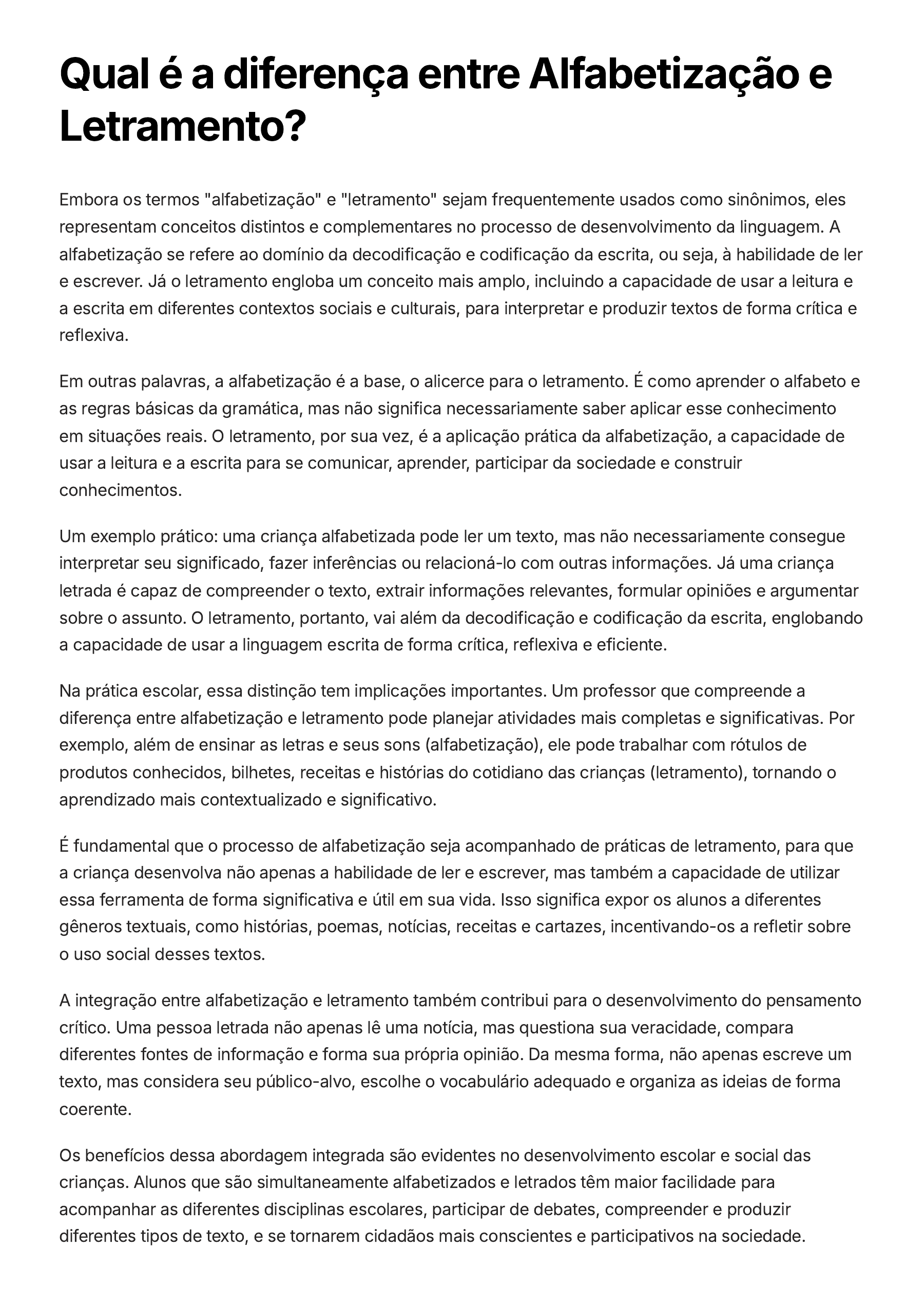 Qual é a diferença entre Alfabetização e Letramento? Embora os termos "alfabetização" e "letramento" sejam frequentemente usados como sinônimos, eles representam conceitos distintos e complementares no processo de desenvolvimento da linguagem. A alfabetização se refere ao domínio da decodificação e codificação da escrita, ou seja, à habilidade de ler e escrever. Já o letramento engloba um conceito mais amplo, incluindo a capacidade de usar a leitura e a escrita em diferentes contextos sociais e culturais, para interpretar e produzir textos de forma crítica e reflexiva. Em outras palavras, a alfabetização é a base, o alicerce para o letramento. É como aprender o alfabeto e as regras básicas da gramática, mas não significa necessariamente saber aplicar esse conhecimento em situações reais. O letramento, por sua vez, é a aplicação prática da alfabetização, a capacidade de usar a leitura e a escrita para se comunicar, aprender, participar da sociedade e construir conhecimentos. Um exemplo prático: uma criança alfabetizada pode ler um texto, mas não necessariamente consegue interpretar seu significado, fazer inferências ou relacioná-lo com outras informações. Já uma criança letrada é capaz de compreender o texto, extrair informações relevantes, formular opiniões e argumentar sobre o assunto. O letramento, portanto, vai além da decodificação e codificação da escrita, englobando a capacidade de usar a linguagem escrita de forma crítica, reflexiva e eficiente. Na prática escolar, essa distinção tem implicações importantes. Um professor que compreende a diferença entre alfabetização e letramento pode planejar atividades mais completas e significativas. Por exemplo, além de ensinar as letras e seus sons (alfabetização), ele pode trabalhar com rótulos de produtos conhecidos, bilhetes, receitas e histórias do cotidiano das crianças (letramento), tornando o aprendizado mais contextualizado e significativo. É fundamental que o processo de alfabetização seja acompanhado de práticas de letramento, para que a criança desenvolva não apenas a habilidade de ler e escrever, mas também a capacidade de utilizar essa ferramenta de forma significativa e útil em sua vida. Isso significa expor os alunos a diferentes gêneros textuais, como histórias, poemas, notícias, receitas e cartazes, incentivando-os a refletir sobre o uso social desses textos. A integração entre alfabetização e letramento também contribui para o desenvolvimento do pensamento crítico. Uma pessoa letrada não apenas lê uma notícia, mas questiona sua veracidade, compara diferentes fontes de informação e forma sua própria opinião. Da mesma forma, não apenas escreve um texto, mas considera seu público-alvo, escolhe o vocabulário adequado e organiza as ideias de forma coerente. Os benefícios dessa abordagem integrada são evidentes no desenvolvimento escolar e social das crianças. Alunos que são simultaneamente alfabetizados e letrados têm maior facilidade para acompanhar as diferentes disciplinas escolares, participar de debates, compreender e produzir diferentes tipos de texto, e se tornarem cidadãos mais conscientes e participativos na sociedade.