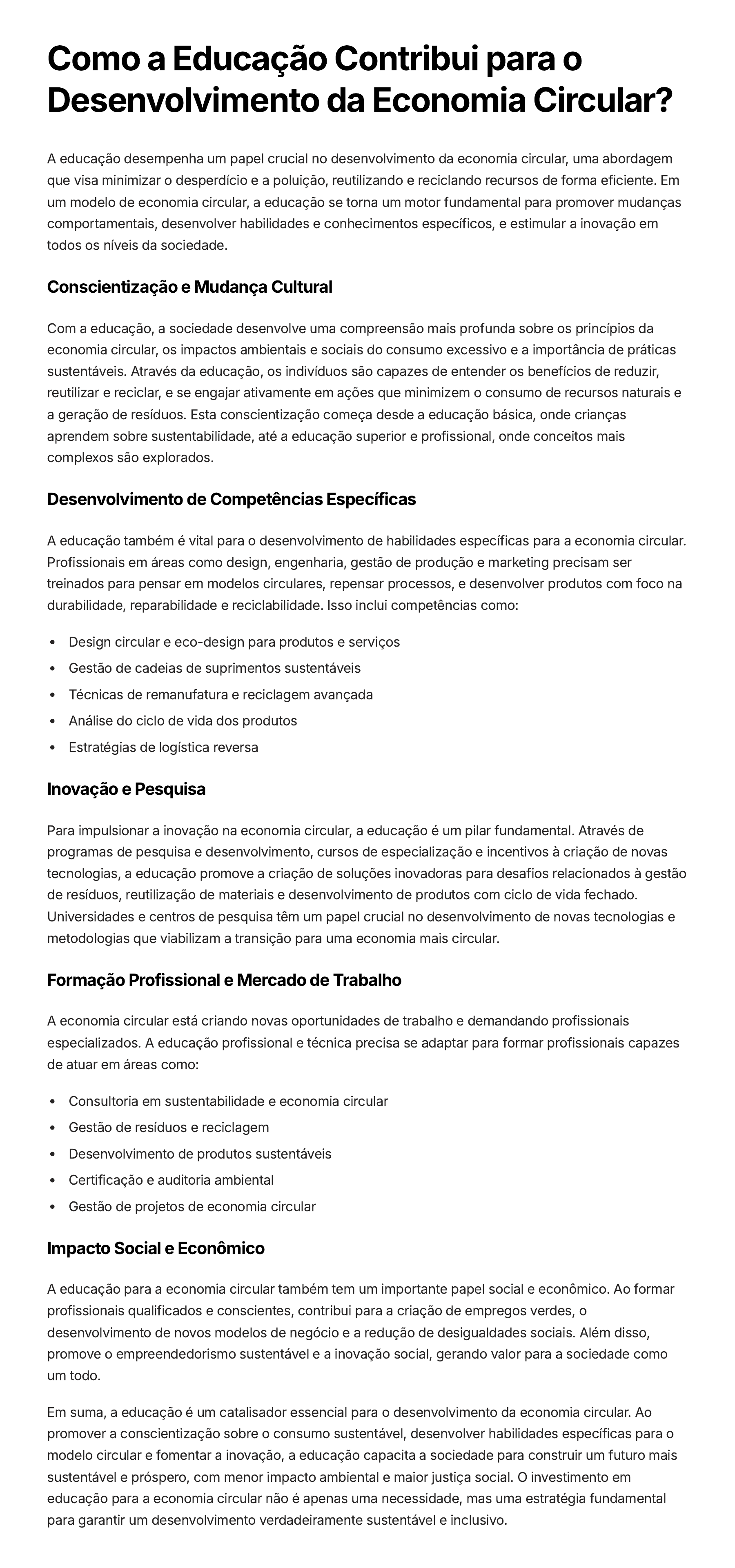 Como a Educação Contribui para o Desenvolvimento da Economia Circular? A educação desempenha um papel crucial no desenvolvimento da economia circular, uma abordagem que visa minimizar o desperdício e a poluição, reutilizando e reciclando recursos de forma eficiente. Em um modelo de economia circular, a educação se torna um motor fundamental para promover mudanças comportamentais, desenvolver habilidades e conhecimentos específicos, e estimular a inovação em todos os níveis da sociedade. Conscientização e Mudança Cultural Com a educação, a sociedade desenvolve uma compreensão mais profunda sobre os princípios da economia circular, os impactos ambientais e sociais do consumo excessivo e a importância de práticas sustentáveis. Através da educação, os indivíduos são capazes de entender os benefícios de reduzir, reutilizar e reciclar, e se engajar ativamente em ações que minimizem o consumo de recursos naturais e a geração de resíduos. Esta conscientização começa desde a educação básica, onde crianças aprendem sobre sustentabilidade, até a educação superior e profissional, onde conceitos mais complexos são explorados. Desenvolvimento de Competências Específicas A educação também é vital para o desenvolvimento de habilidades específicas para a economia circular. Profissionais em áreas como design, engenharia, gestão de produção e marketing precisam ser treinados para pensar em modelos circulares, repensar processos, e desenvolver produtos com foco na durabilidade, reparabilidade e reciclabilidade. Isso inclui competências como: Design circular e eco-design para produtos e serviços Gestão de cadeias de suprimentos sustentáveis Técnicas de remanufatura e reciclagem avançada Análise do ciclo de vida dos produtos Estratégias de logística reversa Inovação e Pesquisa Para impulsionar a inovação na economia circular, a educação é um pilar fundamental. Através de programas de pesquisa e desenvolvimento, cursos de especialização e incentivos à criação de novas tecnologias, a educação promove a criação de soluções inovadoras para desafios relacionados à gestão de resíduos, reutilização de materiais e desenvolvimento de produtos com ciclo de vida fechado. Universidades e centros de pesquisa têm um papel crucial no desenvolvimento de novas tecnologias e metodologias que viabilizam a transição para uma economia mais circular. Formação Profissional e Mercado de Trabalho A economia circular está criando novas oportunidades de trabalho e demandando profissionais especializados. A educação profissional e técnica precisa se adaptar para formar profissionais capazes de atuar em áreas como: Consultoria em sustentabilidade e economia circular Gestão de resíduos e reciclagem Desenvolvimento de produtos sustentáveis Certificação e auditoria ambiental Gestão de projetos de economia circular Impacto Social e Econômico A educação para a economia circular também tem um importante papel social e econômico. Ao formar profissionais qualificados e conscientes, contribui para a criação de empregos verdes, o desenvolvimento de novos modelos de negócio e a redução de desigualdades sociais. Além disso, promove o empreendedorismo sustentável e a inovação social, gerando valor para a sociedade como um todo. Em suma, a educação é um catalisador essencial para o desenvolvimento da economia circular. Ao promover a conscientização sobre o consumo sustentável, desenvolver habilidades específicas para o modelo circular e fomentar a inovação, a educação capacita a sociedade para construir um futuro mais sustentável e próspero, com menor impacto ambiental e maior justiça social. O investimento em educação para a economia circular não é apenas uma necessidade, mas uma estratégia fundamental para garantir um desenvolvimento verdadeiramente sustentável e inclusivo.