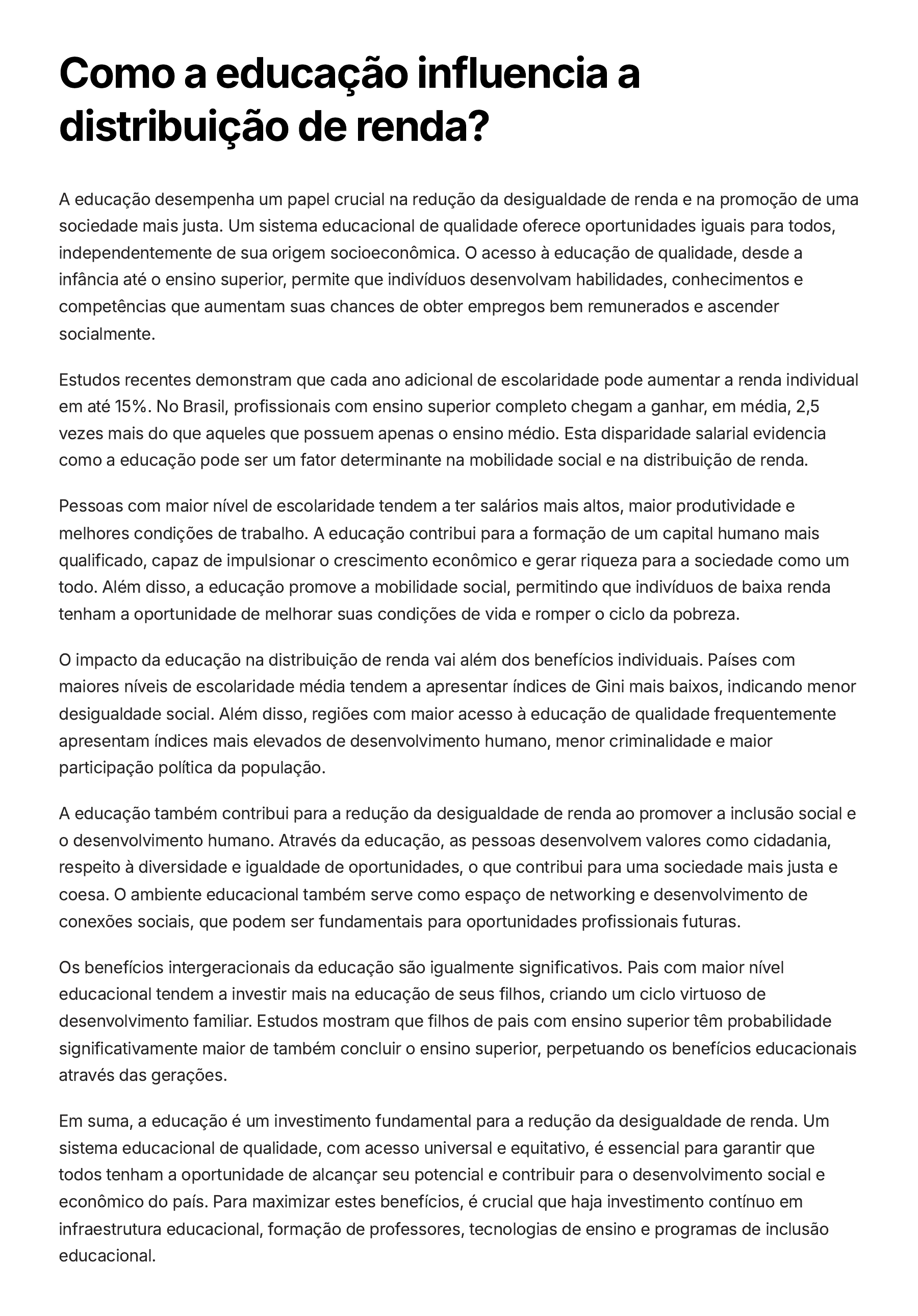 Como a educação influencia a distribuição de renda? A educação desempenha um papel crucial na redução da desigualdade de renda e na promoção de uma sociedade mais justa. Um sistema educacional de qualidade oferece oportunidades iguais para todos, independentemente de sua origem socioeconômica. O acesso à educação de qualidade, desde a infância até o ensino superior, permite que indivíduos desenvolvam habilidades, conhecimentos e competências que aumentam suas chances de obter empregos bem remunerados e ascender socialmente. Estudos recentes demonstram que cada ano adicional de escolaridade pode aumentar a renda individual em até 15%. No Brasil, profissionais com ensino superior completo chegam a ganhar, em média, 2,5 vezes mais do que aqueles que possuem apenas o ensino médio. Esta disparidade salarial evidencia como a educação pode ser um fator determinante na mobilidade social e na distribuição de renda. Pessoas com maior nível de escolaridade tendem a ter salários mais altos, maior produtividade e melhores condições de trabalho. A educação contribui para a formação de um capital humano mais qualificado, capaz de impulsionar o crescimento econômico e gerar riqueza para a sociedade como um todo. Além disso, a educação promove a mobilidade social, permitindo que indivíduos de baixa renda tenham a oportunidade de melhorar suas condições de vida e romper o ciclo da pobreza. O impacto da educação na distribuição de renda vai além dos benefícios individuais. Países com maiores níveis de escolaridade média tendem a apresentar índices de Gini mais baixos, indicando menor desigualdade social. Além disso, regiões com maior acesso à educação de qualidade frequentemente apresentam índices mais elevados de desenvolvimento humano, menor criminalidade e maior participação política da população. A educação também contribui para a redução da desigualdade de renda ao promover a inclusão social e o desenvolvimento humano. Através da educação, as pessoas desenvolvem valores como cidadania, respeito à diversidade e igualdade de oportunidades, o que contribui para uma sociedade mais justa e coesa. O ambiente educacional também serve como espaço de networking e desenvolvimento de conexões sociais, que podem ser fundamentais para oportunidades profissionais futuras. Os benefícios intergeracionais da educação são igualmente significativos. Pais com maior nível educacional tendem a investir mais na educação de seus filhos, criando um ciclo virtuoso de desenvolvimento familiar. Estudos mostram que filhos de pais com ensino superior têm probabilidade significativamente maior de também concluir o ensino superior, perpetuando os benefícios educacionais através das gerações. Em suma, a educação é um investimento fundamental para a redução da desigualdade de renda. Um sistema educacional de qualidade, com acesso universal e equitativo, é essencial para garantir que todos tenham a oportunidade de alcançar seu potencial e contribuir para o desenvolvimento social e econômico do país. Para maximizar estes benefícios, é crucial que haja investimento contínuo em infraestrutura educacional, formação de professores, tecnologias de ensino e programas de inclusão educacional.