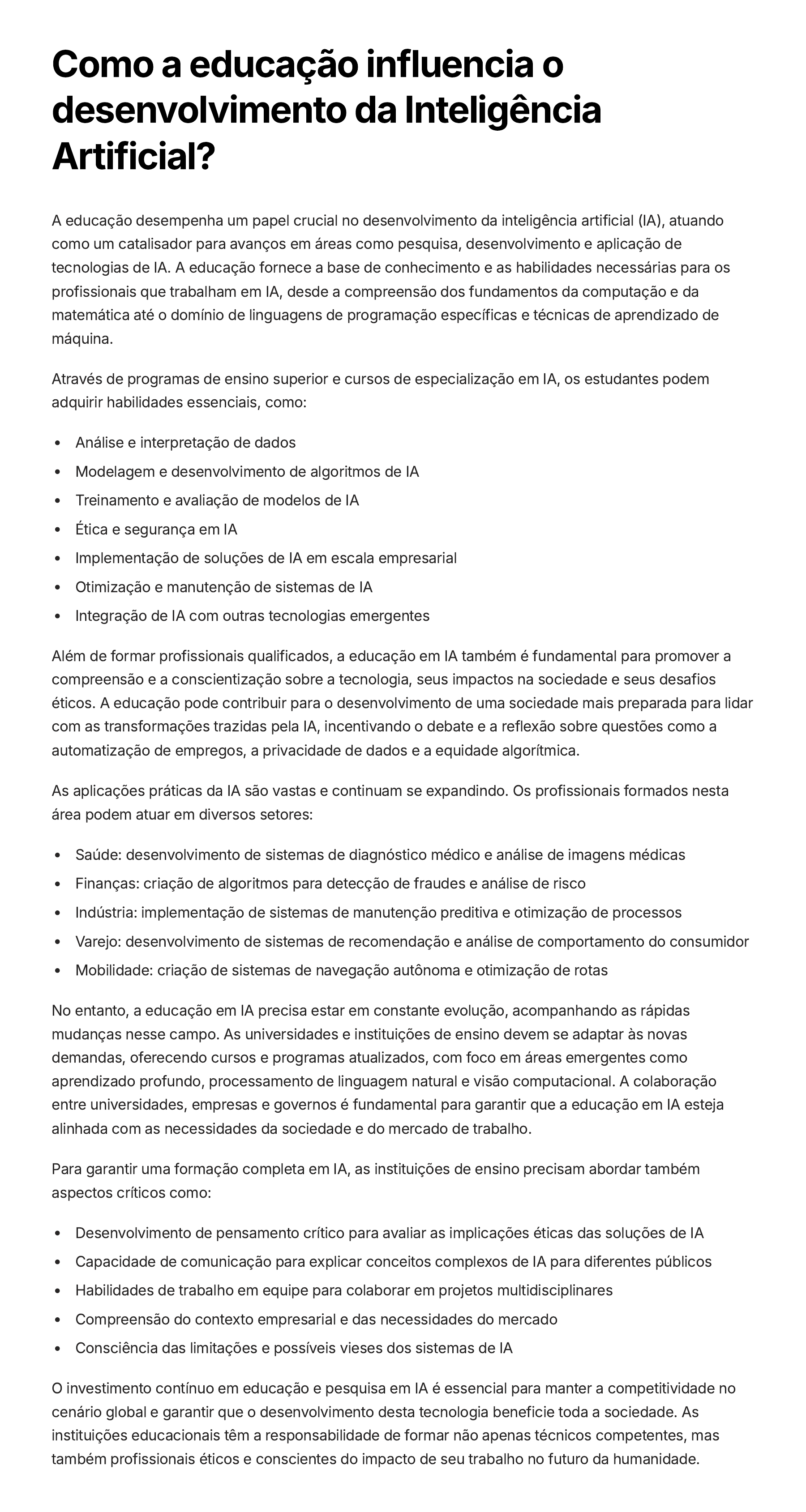Como a educação influencia o desenvolvimento da Inteligência Artificial? A educação desempenha um papel crucial no desenvolvimento da inteligência artificial (IA), atuando como um catalisador para avanços em áreas como pesquisa, desenvolvimento e aplicação de tecnologias de IA. A educação fornece a base de conhecimento e as habilidades necessárias para os profissionais que trabalham em IA, desde a compreensão dos fundamentos da computação e da matemática até o domínio de linguagens de programação específicas e técnicas de aprendizado de máquina. Através de programas de ensino superior e cursos de especialização em IA, os estudantes podem adquirir habilidades essenciais, como: Análise e interpretação de dados Modelagem e desenvolvimento de algoritmos de IA Treinamento e avaliação de modelos de IA Ética e segurança em IA Implementação de soluções de IA em escala empresarial Otimização e manutenção de sistemas de IA Integração de IA com outras tecnologias emergentes Além de formar profissionais qualificados, a educação em IA também é fundamental para promover a compreensão e a conscientização sobre a tecnologia, seus impactos na sociedade e seus desafios éticos. A educação pode contribuir para o desenvolvimento de uma sociedade mais preparada para lidar com as transformações trazidas pela IA, incentivando o debate e a reflexão sobre questões como a automatização de empregos, a privacidade de dados e a equidade algorítmica. As aplicações práticas da IA são vastas e continuam se expandindo. Os profissionais formados nesta área podem atuar em diversos setores: Saúde: desenvolvimento de sistemas de diagnóstico médico e análise de imagens médicas Finanças: criação de algoritmos para detecção de fraudes e análise de risco Indústria: implementação de sistemas de manutenção preditiva e otimização de processos Varejo: desenvolvimento de sistemas de recomendação e análise de comportamento do consumidor Mobilidade: criação de sistemas de navegação autônoma e otimização de rotas No entanto, a educação em IA precisa estar em constante evolução, acompanhando as rápidas mudanças nesse campo. As universidades e instituições de ensino devem se adaptar às novas demandas, oferecendo cursos e programas atualizados, com foco em áreas emergentes como aprendizado profundo, processamento de linguagem natural e visão computacional. A colaboração entre universidades, empresas e governos é fundamental para garantir que a educação em IA esteja alinhada com as necessidades da sociedade e do mercado de trabalho. Para garantir uma formação completa em IA, as instituições de ensino precisam abordar também aspectos críticos como: Desenvolvimento de pensamento crítico para avaliar as implicações éticas das soluções de IA Capacidade de comunicação para explicar conceitos complexos de IA para diferentes públicos Habilidades de trabalho em equipe para colaborar em projetos multidisciplinares Compreensão do contexto empresarial e das necessidades do mercado Consciência das limitações e possíveis vieses dos sistemas de IA O investimento contínuo em educação e pesquisa em IA é essencial para manter a competitividade no cenário global e garantir que o desenvolvimento desta tecnologia beneficie toda a sociedade. As instituições educacionais têm a responsabilidade de formar não apenas técnicos competentes, mas também profissionais éticos e conscientes do impacto de seu trabalho no futuro da humanidade.