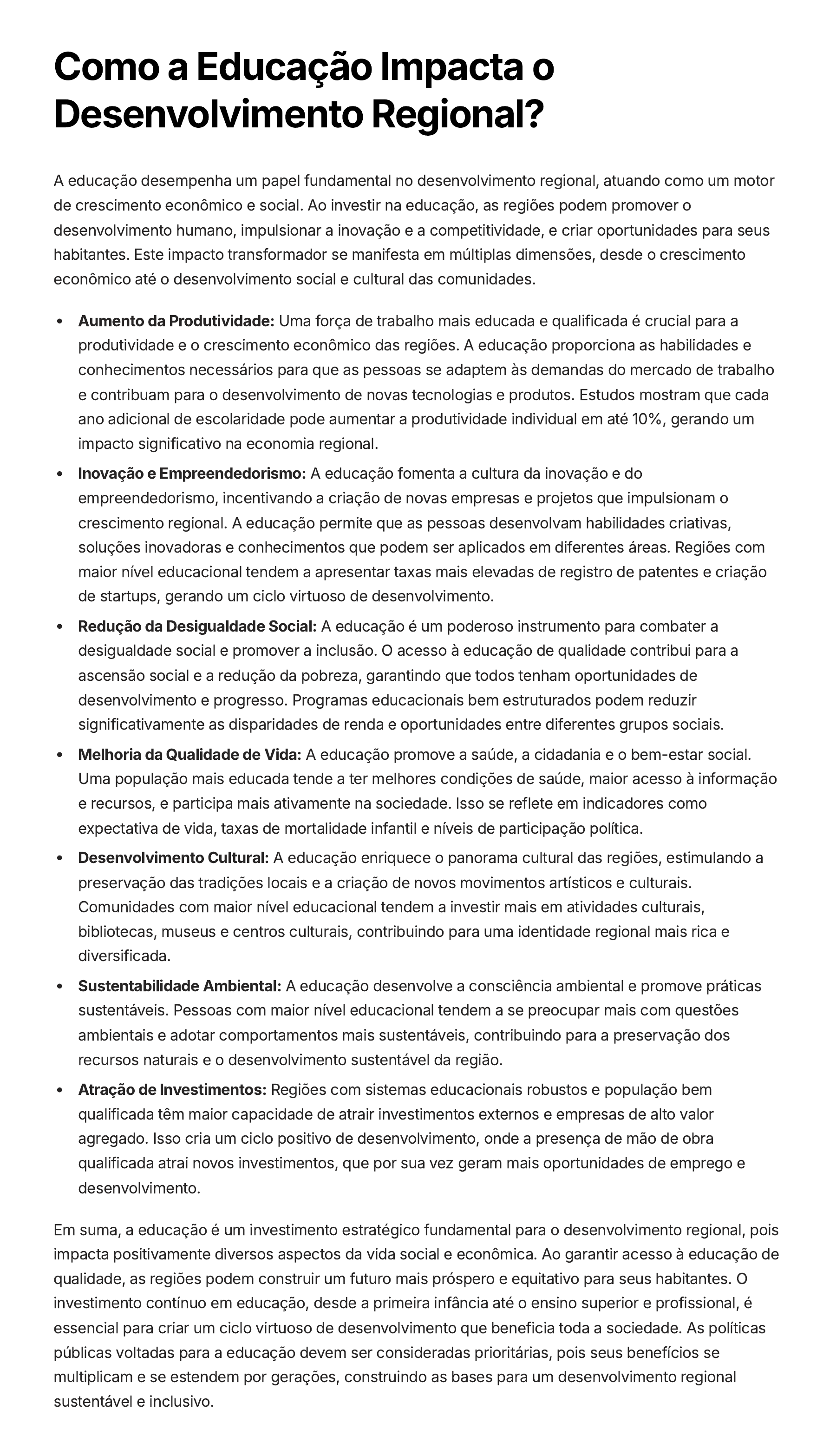 Como a Educação Impacta o Desenvolvimento Regional? A educação desempenha um papel fundamental no desenvolvimento regional, atuando como um motor de crescimento econômico e social. Ao investir na educação, as regiões podem promover o desenvolvimento humano, impulsionar a inovação e a competitividade, e criar oportunidades para seus habitantes. Este impacto transformador se manifesta em múltiplas dimensões, desde o crescimento econômico até o desenvolvimento social e cultural das comunidades. Aumento da Produtividade: Uma força de trabalho mais educada e qualificada é crucial para a produtividade e o crescimento econômico das regiões. A educação proporciona as habilidades e conhecimentos necessários para que as pessoas se adaptem às demandas do mercado de trabalho e contribuam para o desenvolvimento de novas tecnologias e produtos. Estudos mostram que cada ano adicional de escolaridade pode aumentar a produtividade individual em até 10%, gerando um impacto significativo na economia regional. Inovação e Empreendedorismo: A educação fomenta a cultura da inovação e do empreendedorismo, incentivando a criação de novas empresas e projetos que impulsionam o crescimento regional. A educação permite que as pessoas desenvolvam habilidades criativas, soluções inovadoras e conhecimentos que podem ser aplicados em diferentes áreas. Regiões com maior nível educacional tendem a apresentar taxas mais elevadas de registro de patentes e criação de startups, gerando um ciclo virtuoso de desenvolvimento. Redução da Desigualdade Social: A educação é um poderoso instrumento para combater a desigualdade social e promover a inclusão. O acesso à educação de qualidade contribui para a ascensão social e a redução da pobreza, garantindo que todos tenham oportunidades de desenvolvimento e progresso. Programas educacionais bem estruturados podem reduzir significativamente as disparidades de renda e oportunidades entre diferentes grupos sociais. Melhoria da Qualidade de Vida: A educação promove a saúde, a cidadania e o bem-estar social. Uma população mais educada tende a ter melhores condições de saúde, maior acesso à informação e recursos, e participa mais ativamente na sociedade. Isso se reflete em indicadores como expectativa de vida, taxas de mortalidade infantil e níveis de participação política. Desenvolvimento Cultural: A educação enriquece o panorama cultural das regiões, estimulando a preservação das tradições locais e a criação de novos movimentos artísticos e culturais. Comunidades com maior nível educacional tendem a investir mais em atividades culturais, bibliotecas, museus e centros culturais, contribuindo para uma identidade regional mais rica e diversificada. Sustentabilidade Ambiental: A educação desenvolve a consciência ambiental e promove práticas sustentáveis. Pessoas com maior nível educacional tendem a se preocupar mais com questões ambientais e adotar comportamentos mais sustentáveis, contribuindo para a preservação dos recursos naturais e o desenvolvimento sustentável da região. Atração de Investimentos: Regiões com sistemas educacionais robustos e população bem qualificada têm maior capacidade de atrair investimentos externos e empresas de alto valor agregado. Isso cria um ciclo positivo de desenvolvimento, onde a presença de mão de obra qualificada atrai novos investimentos, que por sua vez geram mais oportunidades de emprego e desenvolvimento. Em suma, a educação é um investimento estratégico fundamental para o desenvolvimento regional, pois impacta positivamente diversos aspectos da vida social e econômica. Ao garantir acesso à educação de qualidade, as regiões podem construir um futuro mais próspero e equitativo para seus habitantes. O investimento contínuo em educação, desde a primeira infância até o ensino superior e profissional, é essencial para criar um ciclo virtuoso de desenvolvimento que beneficia toda a sociedade. As políticas públicas voltadas para a educação devem ser consideradas prioritárias, pois seus benefícios se multiplicam e se estendem por gerações, construindo as bases para um desenvolvimento regional sustentável e inclusivo.