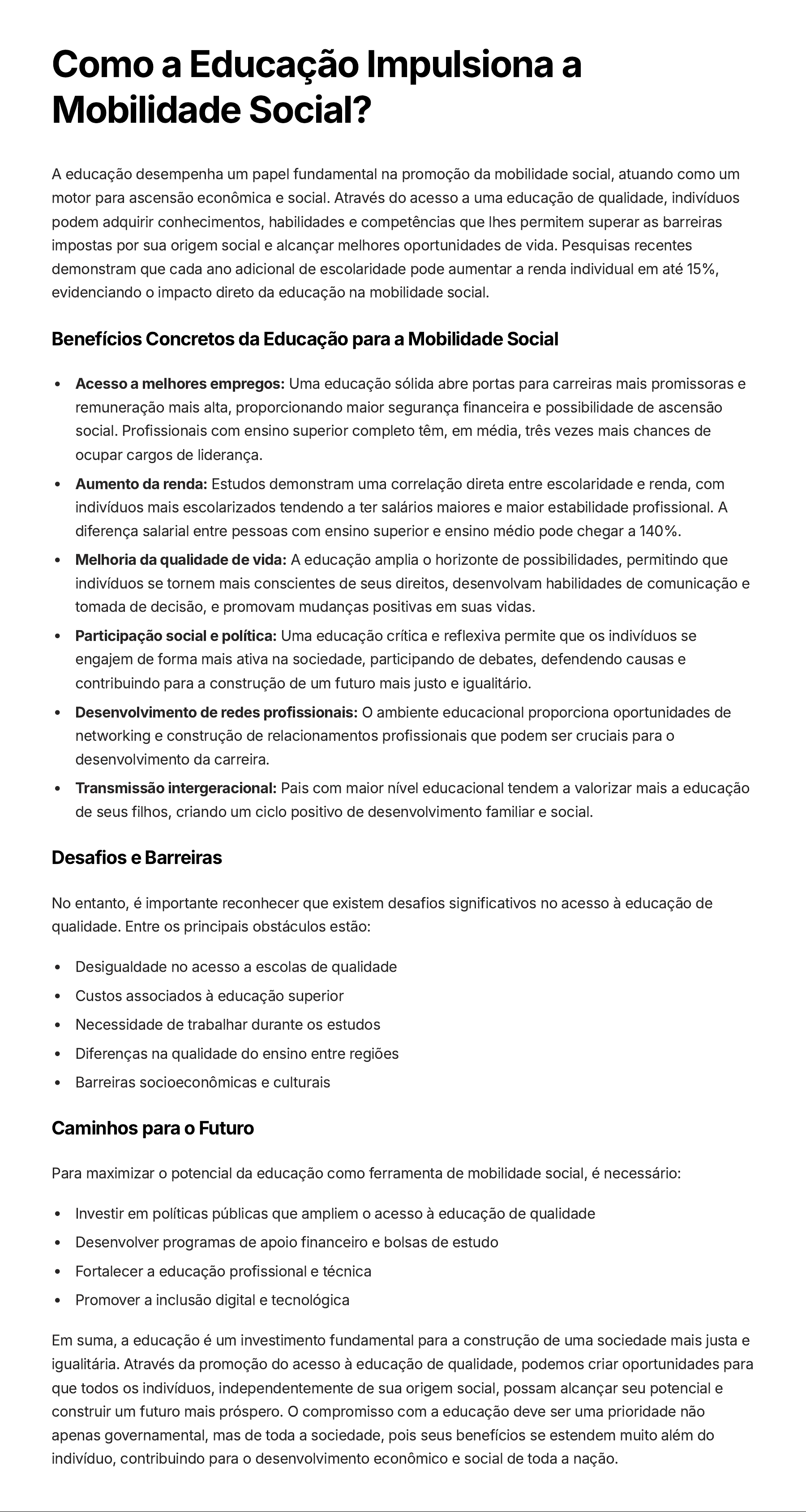 Como a Educação Impulsiona a Mobilidade Social? A educação desempenha um papel fundamental na promoção da mobilidade social, atuando como um motor para ascensão econômica e social. Através do acesso a uma educação de qualidade, indivíduos podem adquirir conhecimentos, habilidades e competências que lhes permitem superar as barreiras impostas por sua origem social e alcançar melhores oportunidades de vida. Pesquisas recentes demonstram que cada ano adicional de escolaridade pode aumentar a renda individual em até 15%, evidenciando o impacto direto da educação na mobilidade social. Benefícios Concretos da Educação para a Mobilidade Social Acesso a melhores empregos: Uma educação sólida abre portas para carreiras mais promissoras e remuneração mais alta, proporcionando maior segurança financeira e possibilidade de ascensão social. Profissionais com ensino superior completo têm, em média, três vezes mais chances de ocupar cargos de liderança. Aumento da renda: Estudos demonstram uma correlação direta entre escolaridade e renda, com indivíduos mais escolarizados tendendo a ter salários maiores e maior estabilidade profissional. A diferença salarial entre pessoas com ensino superior e ensino médio pode chegar a 140%. Melhoria da qualidade de vida: A educação amplia o horizonte de possibilidades, permitindo que indivíduos se tornem mais conscientes de seus direitos, desenvolvam habilidades de comunicação e tomada de decisão, e promovam mudanças positivas em suas vidas. Participação social e política: Uma educação crítica e reflexiva permite que os indivíduos se engajem de forma mais ativa na sociedade, participando de debates, defendendo causas e contribuindo para a construção de um futuro mais justo e igualitário. Desenvolvimento de redes profissionais: O ambiente educacional proporciona oportunidades de networking e construção de relacionamentos profissionais que podem ser cruciais para o desenvolvimento da carreira. Transmissão intergeracional: Pais com maior nível educacional tendem a valorizar mais a educação de seus filhos, criando um ciclo positivo de desenvolvimento familiar e social. Desafios e Barreiras No entanto, é importante reconhecer que existem desafios significativos no acesso à educação de qualidade. Entre os principais obstáculos estão: Desigualdade no acesso a escolas de qualidade Custos associados à educação superior Necessidade de trabalhar durante os estudos Diferenças na qualidade do ensino entre regiões Barreiras socioeconômicas e culturais Caminhos para o Futuro Para maximizar o potencial da educação como ferramenta de mobilidade social, é necessário: Investir em políticas públicas que ampliem o acesso à educação de qualidade Desenvolver programas de apoio financeiro e bolsas de estudo Fortalecer a educação profissional e técnica Promover a inclusão digital e tecnológica Em suma, a educação é um investimento fundamental para a construção de uma sociedade mais justa e igualitária. Através da promoção do acesso à educação de qualidade, podemos criar oportunidades para que todos os indivíduos, independentemente de sua origem social, possam alcançar seu potencial e construir um futuro mais próspero. O compromisso com a educação deve ser uma prioridade não apenas governamental, mas de toda a sociedade, pois seus benefícios se estendem muito além do indivíduo, contribuindo para o desenvolvimento econômico e social de toda a nação.