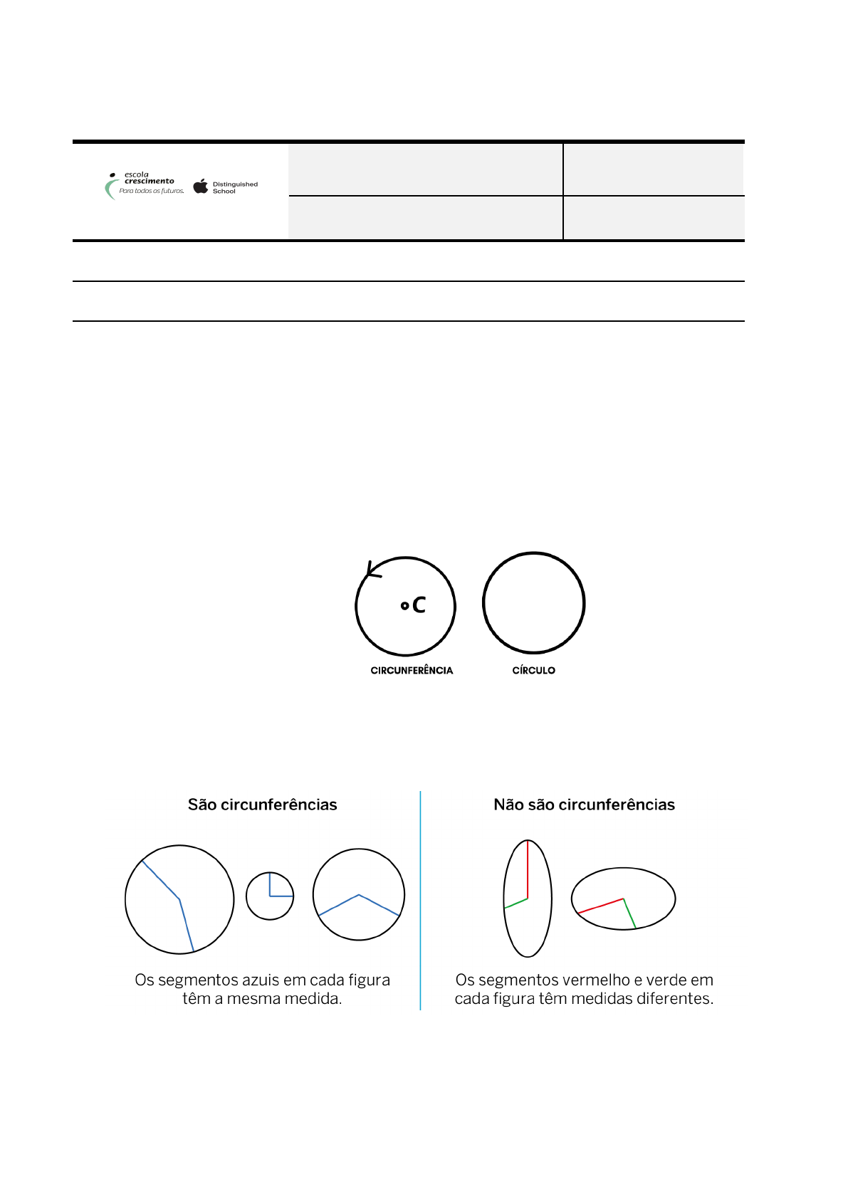 MATEMÁTICA Atividade de sala PROFESSORA: 3° ANO ALUNO (A): DATA: TURMA: CÍRCULO E CIRCUNFERÊNCIA ● Uma circunferência é uma linha curva fechada em que todos os pontos sobre ela estão na mesma distância de um ponto fixo chamado centro. ● Um círculo é uma figura plana formada por todos os pontos de uma circunferência e os que se encontram em seu interior. Para identificar uma circunferência, verifica-se se todos os pontos estão à mesma distância do centro. ● Observe o centro, o raio e o diâmetro na figura abaixo. Para determinar se um segmento é um raio ou um diâmetro da circunferência, observa-se se ele passa pelo centro da circunferência. 1. Determine se cada afirmação é verdadeira ou falsa. a) ( ) A circunferência é uma curva fechada cujos pontos estão a uma distância diferente de um ponto fixo chamado centro. b) ( ) A circunferência é um segmento de reta cujos pontos estão à mesma distância de um ponto fixo chamado centro. c) ( ) A circunferência é uma curva fechada cujos pontos têm a mesma distância de um ponto fixo chamado centro. 2. Marque os três objetos cuja borda externa é uma circunferência. O círculo e a circunferência têm elementos importantes que devemos aprender a identificar. Observe a imagem e a definição de cada uma de suas partes. Centro: é o ponto que está na mesma distância de cada um dos pontos da circunferência. Raio: é o segmento que une o centro a qualquer ponto da circunferência. Diâmetro: é o segmento que une dois pontos da circunferência passando pelo centro. 3. De acordo com a figura, escreva a palavra que corresponde a cada uma das letras. Diâmetro, Raio e Centro. 4. Leia com atenção e marque a definição correspondente a cada conceito. Para desenhar uma circunferência, vamos usar os seguintes instrumentos. UMA RÉGUA UM COMPASSO 5. Desenhe uma circunferência e marque nela seus elementos: raio, diâmetro e centro. 6. Analise os círculos abaixo e marque em qual há um diâmetro representado. 7. Qual é o nome da linha curva apontada na figura a seguir? _______________________________________. 8. Qual é o nome do ponto marcado na circunferência a seguir? _______________________________________.