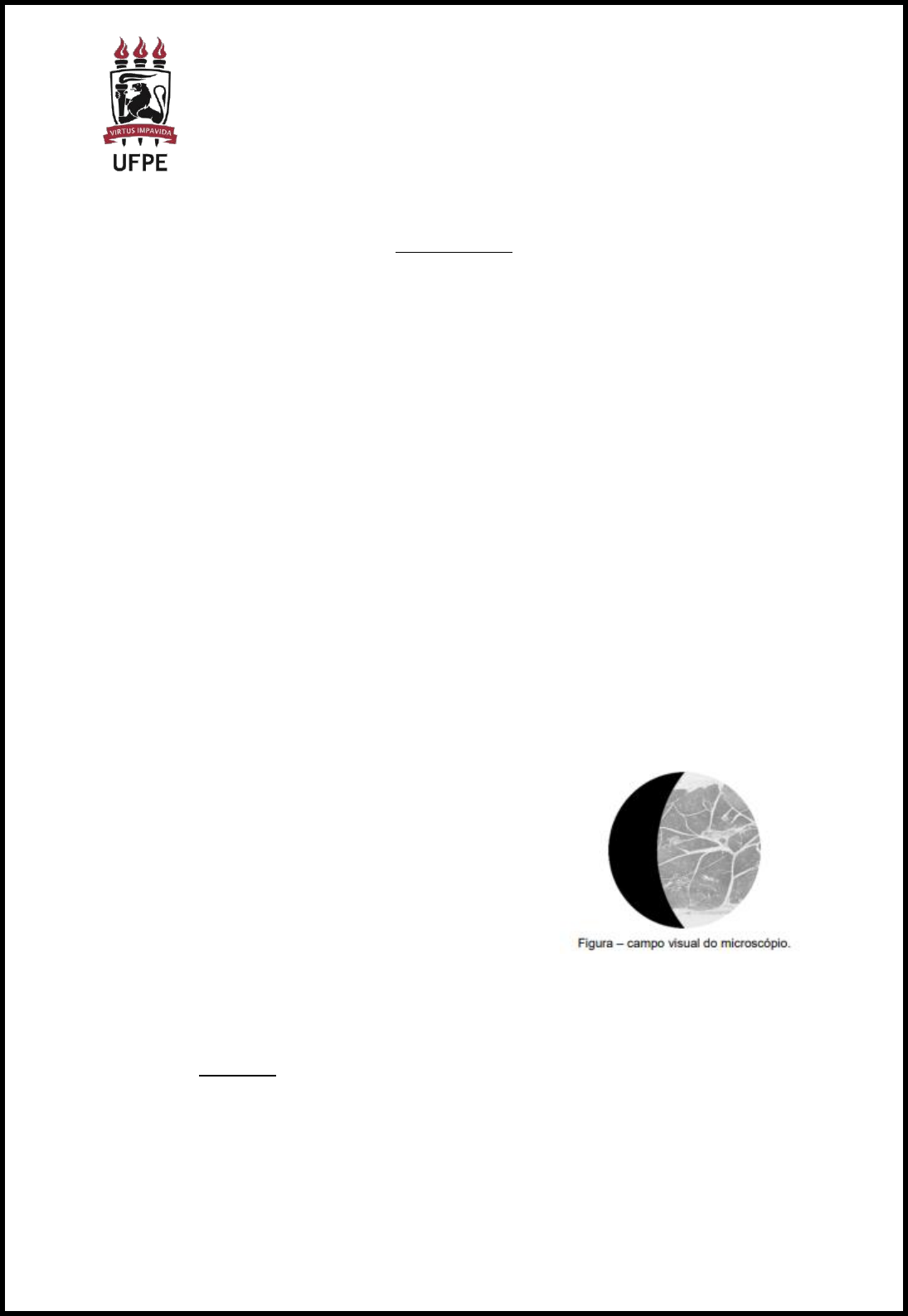 Citologia FARMÁCIA – UFPE – Módulo 1 Emannuel Neris Assuntos abordados: Microscopia -Observações- 1- Essa ficha de exercício não foi passada e nem recomendada por professores ou monitores, portanto não precisa se desesperar. A função dela é servir exclusivamente para complemento nos estudos; 2- Questões: 36 questões de múltipla escolha; 3- As questões foram retiradas de sites confiáveis; 4- O gabarito se encontra na última página, aconselho responder no papel da seguinte forma: “1-X; 2-Y; 3-W ...” e logo após conferir as respostas; 5- Não tem explicação no gabarito, isso foi feito propositalmente para incitar vocês a procurarem a explicação para o erro ou acerto; 6- Espero que essa ficha ajude vocês, bons estudos; 7- Relaxa que vai dar tudo certo. “Caneta dá choque e papel não gagueja” -Desconhecido mais conhecido __________________________________________________ 1- (UFPR – 2023) Durante uma aula de observação de lâmina histológica do pâncreas em microscopia de luz, um estudante chama o auxiliar técnico que está na sala e mostra a imagem a seguir, que apresenta um problema: uma parte do campo visual está escura. Qual ajuste deve ser feito para que o campo visual fique completamente iluminado, nessa situação? a) Abrir completamente o diafragma do condensador. b) Encaixar a lente objetiva na posição correta. c) Aumentar a corrente elétrica da iluminação. d) Remover o filtro fosco do caminho da luz. e) Alinhar a fonte de iluminação. 2- (IBFC – 2023) Quanto ao manuseio de microscópios óticos, assinale a alternativa incorreta. a) Iniciar a observação com a menor objetiva (colocar na de 10x para observação de bactérias) b) Para obtenção do foco deve-se afastar ao máximo a lente da objetiva da lâmina, através do parafuso macrométrico. Este procedimento dever· ser realizado observando-se diretamente o local e não através da ocular, para que não haja o risco de incrustar na objetiva a preparação ou mesmo de quebrar a lâmina c) Na utilização da objetiva de imersão deve-se abaixar totalmente a platina e em seguida subir totalmente o condensador para visualizar claramente o círculo de luz que nos indica a zona onde devemos pingar o Óleo de imersão d) A mudança das objetivas dever ser realizada girando o revólver e visualizando diretamente sobre a preparação para prevenir o contato da lente com a amostra. Nunca mudar de objetiva segurando pelo tubo, nem fazê-lo observando através da ocular 3- (INSTITUTO ACESS – 2023) De acordo com a figura a seguir, que apresenta os componentes básicos de um estereomicroscópio, assinale a afirmativa incorreta. a) 3/Oculares: componente formado por lentes côncavas pelas quais o usuário observa a amostra em estudo. As oculares são normalmente ajustadas para uma ampliação de 10x. b) 9/Platina: componente localizado diretamente sob a lente objetiva. É onde a amostra é colocada para visualização. c) 4/Macrométrico: componente que move a cabeça do estereomicroscópio para cima e para baixo a fim de se obter uma imagem nítida da amostra em estudo. d) 6/Presilhas: clipes que ajudam a manter a amostra sob a platina. e) 2/Micrométrico: componente responsável pela ampliação ou redução da imagem da amostra em estudo. 4- (FEPESE – 2023) Assinale a alternativa correta sobre microscopia e os microscópios ópticos. a) A parte óptica do microscópio óptico visa a suportar o sistema ótico e focar a imagem. b) A ampliação é a menor distância pela qual dois pontos podem ser distinguidos. c) A parte mecânica do microscópio óptico visa a ampliação das imagens. É composta por lentes de ampliação. d) A resolução é uma medida de aumento proporcionado pelo conjunto de lentes. Quanto menor esse valor, menor é o poder de resolução do microscópio. e) O microscópio óptico é um instrumento que faz uso da refração da luz oriunda de uma série de lentes, dotadas ou não de filtros, para ampliar a imagem de objetos invisíveis (ou de difícil visualização) a olho nu. 5- (FGV – 2021) O microscópio para laboratório deve produzir uma imagem ampliada da amostra e separar os detalhes da imagem, tornando-os visíveis ao olho humano ou a uma câmera. Com relação aos componentes do microscópio óptico, avalie as afirmativas a seguir e assinale (V) para a verdadeira e (F) para a falsa. ( ) O ajuste do foco da imagem é obtido através da maior ou menor abertura do diafragma. ( ) O condensador é uma lente que concentra a luz proveniente de uma lâmpada (ou espelho) e direciona esse feixe luminoso para a amostra a ser observada. ( ) A lente objetiva é a que fica mais próxima da amostra observada e projeta uma imagem aumentada em direção à lente ocular. As afirmativas são, na ordem apresentada, respectivamente, a) F – V – F. b) F – V – V. c) V – F – F. d) V – V – F. e) F – F – V. 6- (CESPE/CEBRASPE – 2021) O microscópio de luz é um excelente recurso didático para o ensino de biologia, sendo o microscópio de campo claro o mais comumente utilizado nos laboratórios de ensino de microscopia. Acerca do uso desse tipo de microscópio, e com base nas normas de segurança laboratoriais aplicáveis, julgue o item subsecutivo. Para utilizar a lente objetiva de imersão, um líquido com índice de refração superior ao do ar deve ser posicionado entre a lâmina e a objetiva. a) Certo b) Errado 7- (CESPE/CEBRASPE – 2021) O microscópio de luz é um excelente recurso didático para o ensino de biologia, sendo o microscópio de campo claro o mais comumente utilizado nos laboratórios de ensino de microscopia. Acerca do uso desse tipo de microscópio, e com base nas normas de segurança laboratoriais aplicáveis, julgue o item subsecutivo. Para focalizar a amostra, deve-se girar o parafuso macrométrico ou o parafuso micrométrico, conforme o grau de ajuste necessário. a) Certo b) Errado Texto e imagem para as questões 8,9, 10 e 11 (CESP