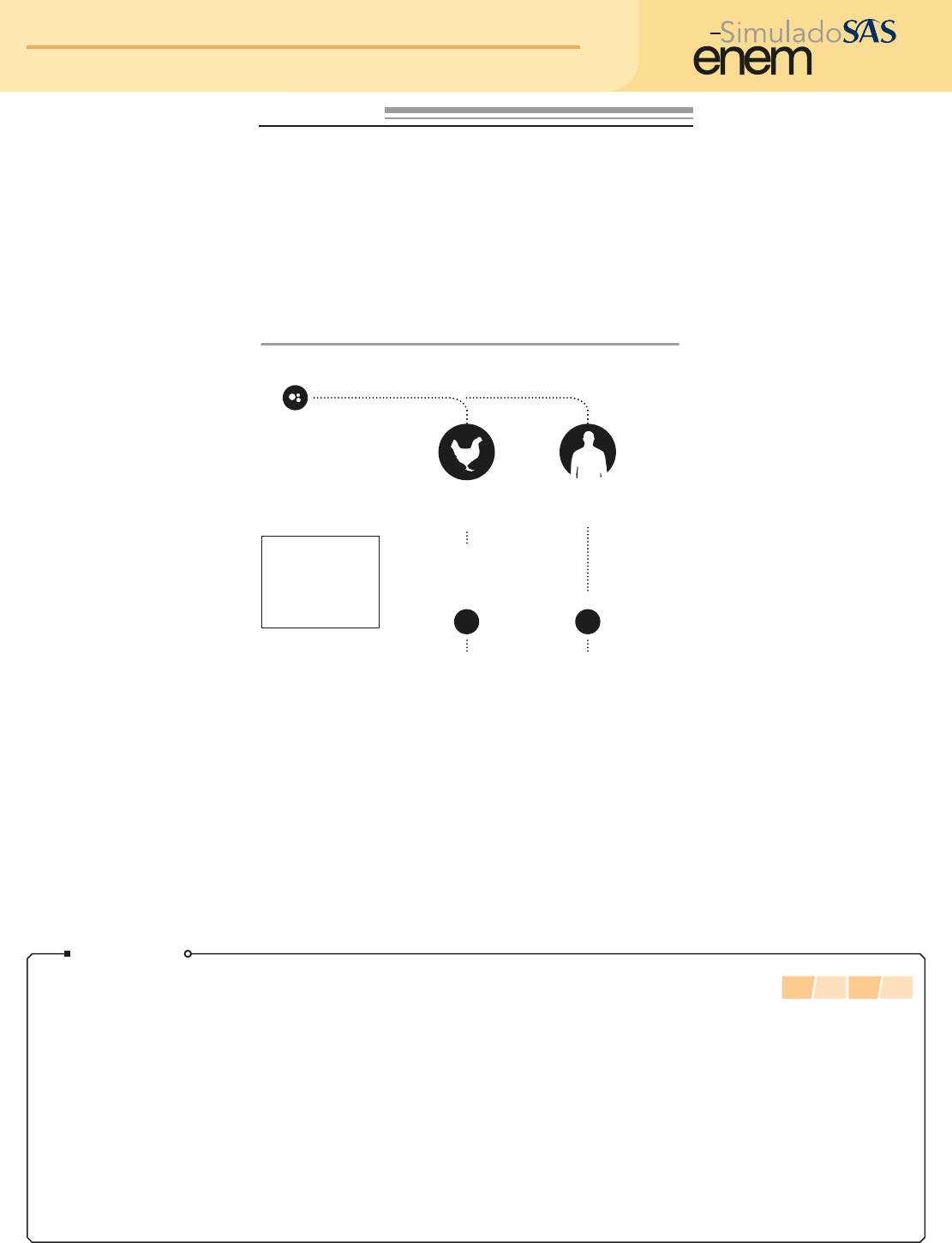 20232023 3oCIÊNCIAS DA NATUREZA E SUAS TECNOLOGIAS Questões de 91 a 135 Resolução Questão 91 Conhecida por ser a maior responsável por quadros de intoxicação alimentar, a salmonela é um tipo de bactéria que causa uma infecção chamada salmonelose. Na maioria dos casos, a doença persiste no corpo humano por um período limitado. O tratamento pode ser feito em casa e é focado em aliviar os sintomas e manter o paciente bem hidratado. Salmonela Anvisa alerta sobre cuidados e prevenção da doença o que é e como ocorre É a causa mais frequente de infecção alimentar Bactéria Presente em alimentos de origem animal: Infectados: • Água • Solo Infectados: • Alimentos • Utensílios Ovos com gema mole ou crua, malcozidos ou malfritos são de alto risco para a doença A ave se torna propagadora da bactéria, que é eliminada nas fezes O frango costuma ser a carne mais contaminada Pessoas também podem transmitir a doença Fezes Fezes • Maionese • Leite e derivados • Ovos crus Disponível em: https://g1.globo.com. Acesso em: 27 jan. 2023. (adaptado) Da leitura do texto, depreende-se que uma medida a ser tomada para evitar a ocorrência de casos de contaminação por esse microrganismo é A A ingerir a quantidade correta de água durante o dia. B B preferir o consumo de alimentos de origem orgânica. C C deixar carnes descongelarem à temperatura ambiente. D D limpar objetos usados na manipulação dos alimentos. E E lavar ovos com água corrente antes de guardá-los na geladeira. 91. Resposta correta: D C 2 H 7 a) (F) A ingestão da quantidade correta de água durante o dia auxilia no tratamento dos sintomas da doença, mas não impede a ocorrência de casos de contaminação. b) (F) Dar preferência ao consumo de alimentos de origem orgânica por si só não é uma medida que auxilia na redução de casos de contaminação pela bactéria, uma vez que alimentos orgânicos (que podem ser de origem animal ou vegetal), se não forem bem tratados, também podem levar à contaminação pelo microrganismo. c) (F) Deixar carnes descongelarem à temperatura ambiente leva à maior possibilidade de proliferação de bactérias, sendo algo que deve ser evitado. d) (V) Limpar bem os objetos que serão utilizados na manipulação dos alimentos é uma ação fundamental para evitar casos de contaminação pela bactéria causadora da salmonelose. e) (F) A lavagem do ovo com água corrente pode facilitar a passagem de microrganismos pela casca. A recomendação é a de que, se for realizar a lavagem, essa deve ocorrer pouco antes do consumo do ovo. 20232023 3oCIÊNCIAS DA NATUREZA E SUAS TECNOLOGIAS Questões de 91 a 135 Resolução Questão 92 O livro Vinte mil léguas submarinas, de Júlio Verne, retrata as aventuras da tripulação a bordo do Náutilus, um imponente submarino com área superficial lateral de cerca de 1 800 m2. Em uma de suas viagens, devido a uma manobra arriscada, o submarino fica cercado por uma massa de gelo a uma temperatura de −30 °C. Considere que a área lateral do submarino é praticamente retangular, que a temperatura inicial no interior dele é de 25 °C e que suas chapas externas têm 5 cm de espessura e são feitas de aço, cuja condutividade térmica é de, aproximadamente, 50 W × m−1 × K−1. A taxa inicial com a qual o submarino perde calor para o meio externo, em watt, é igual a A A 9,9 × 105 B B 9,0 × 106 C C 4,5 × 107 D D 5,4 × 107 E E 9,9 × 107 92. Resposta correta: E C 6 H 21 a) (F) Possivelmente, o valor da espessura não foi convertido para metro. � �� � �� � � � � � � � � � k A T e 50 1800 55 5 9 10 11 9 9 104 5, W b) (F) Possivelmente, o termo DT na equação foi calculado de forma incorreta, sendo tratado como a diferença entre os módulos das temperaturas em Celsius. � �� � � � � � � �� � � � � � � � � � �� � k A T e 50 1800 30 25 5 10 90000 5 5 10 9 10 10 2 2 4 2 99 106� W c) (F) Possivelmente, considerou‑se apenas a temperatura interna do submarino (25 °C) em vez da variação DT. � �� � � � � � � � � � � � � � � � �� � k A T e 50 1800 25 5 10 90000 25 5 10 9 10 5 10 4 2 2 4 2 ,55 107� W d) (F) Possivelmente, considerou‑se apenas a temperatura da massa de gelo (–30 °C), em vez da variação DT, interpretando que o sinal de negativo evidencia a perda de calor pelo submarino. � �� � � � � � � �� � � � � � � � � � � � �� k A T e 50 1800 30 5 10 90000 6 10 540000 10 2 2 2 55 4 107, � W e) (V) De acordo com a Lei de Fourier, a taxa com a qual o interior do submarino perde calor é dada por: � � � ��k A T e Sabe‑se que f corresponde ao fluxo de calor; k, à condutividade térmica do material; A, à área da seção transversal da embarcação; e DT, à diferença de temperatura entre os meios interno e externo, separados pela chapa de espessura e. Transformando a unidade de medida de celsius para kelvin, obtém‑se: 25 + 273 = 298 K −30 + 273 = 243 K Dessa forma, tem‑se: � � � � � � � � �� � � � � � � � � �� � k A T e 50 1800 298 243 5 10 90000 55 5 10 9 10 11 2 2 4 110 9 9 102 7� � �� , W 20232023 3oCIÊNCIAS DA NATUREZA E SUAS TECNOLOGIAS Questões de 91 a 135 Resolução Questão 93 O processo de osmose inversa utiliza a pressão hidráulica para produzir água dessalinizada a partir de uma fonte hídrica de abastecimento, por intermédio de uma membrana, utilizando energia elétrica em função da quantidade de sais a serem removidos. A concentração de sais na água é o parâmetro que indica a pressão necessária para o processo ocorrer. Para soluções iônicas diluídas, a pressão osmótica (π) pode ser calculada pela equação de Van't Hoff, na qual M é a concentração molar, R é a constante universal dos gases, T é a temperatura da solução, em kelvin, e i é o fator 