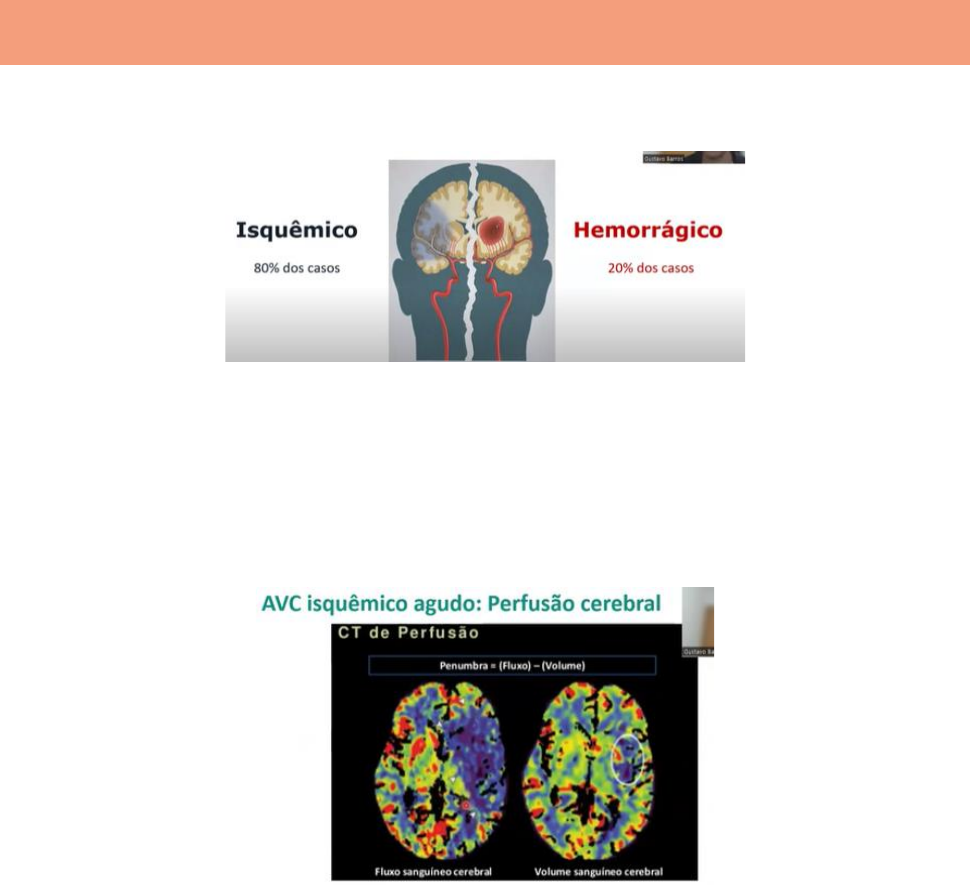 Marcela Bastos, 71C AVC Agudo ❖ Isquêmico: 80% dos casos. ❖ Hemorrágico: 20% dos casos. ❖ Quando um vaso é ocluído, existe uma perda de função imediata (área de penumbra), mas é uma área que ainda não morreu, por isso é possível recanalizar o vaso sem perder essa área do parênquima cerebral. ❖ Essa recanalização é realizada com a trombólise com alteplase em até 4 horas e meia. ❖ Quanto mais tempo demoro para tratar, pior é o prognóstico. ❖ Em 2018, um estudo revolucionou o tratamento do AVEi. Ele usou um software de tomografia para mostrar a perfusão cerebral, com um conceito chamado de mismatch ❖ Á área azul mostra uma perda de fluxo cerebral > zona de penumbra. ❖ O volume sanguíneo cerebral demonstra a área de necrose cerebral, que é bem menor do que a área de penumbra. ❖ Esse trabalho permitiu individualizar cada indivíduo > permite avaliar a área de penumbra de cada um para tomar a decisão entre trombólise venosa ou trombectomia mecânica, sem olhar apenas o tempo de início dos sintomas. ❖ Em 2021, um estudo avaliou a realização de trombólise entre 4,5h até 9h, principalmente nos pacientes que tiveram um AVC ao acordar (não é possível saber o tempo de início do AVC). Ao chegar no hospital, esses pacientes podem fazer uma tomografia de perfusão (mismatch) para saber a área de penumbra. ❖ A perfusão tomográfica infelizmente é pouco acessível. São poucos os lugares que fazem isso em Belo Horizonte, mas a perspectiva é que no futuro possamos passar a tratar o AVC não só olhando para o tempo fixo de início de sintomas, mas sim, individualizando cada área de penumbra de cada paciente utilizando a perfusão tomográfica. Opções de Tratamento que Modificam a História Natural da Doença: Nível I-A de evidência: ❖ Trombólise venosa com alteplase em até 4,5h. ❖ Trombólise venosa com alteplase em até 9 horas ou ‘wake up stroke’ > podemos fazer a trombólise em até 9 horas apenas se for possível realizar uma perfusão tomográfica para avaliar o mismatch do paciente (o mismatch perfusional deve ser favorável para a trombólise). Marcela Bastos, 71C ❖ Trombectomia mecânica em oclusões proximais em até 24h se mismatch perfusional favorável. Se percebermos com uma angiotomografia que o paciente tem uma oclusão em um vaso grande (carótida terminal ou primeiro segmento da artéria cerebral média) já podemos chamar a hemodinâmica para fazer a trombectomia. ❖ Suporte em Unidade de AVC > desfechos melhores. Temos profissionais treinados para tratar AVC. Triagem: ❖ BEFAST: balance (equilíbrio), eyes, face, Arms, speech, time. ❖ SAMU: sorria, abrace, mensagem (fala), urgência. Suspeita Clínica: ❖ Qualquer sintoma neurológico agudo súbito é um sinal de alerta para AVC. ❖ Confusão mental, cefaleia, dificuldade para enxergar, dificuldade de equilíbrio, dificuldade de caminhar, tontura, perda de coordenação, fraqueza, dormência etc. Atendimento na Emergência: ❖ Iniciar protocolo de atendimento, que envolve condutas da enfermagem e condutas médicas. ❖ Cabeceira a 0ºC para melhorar perfusão, se não tiver náuseas ou vômitos. ❖ Dados vitais. ❖ Glicemia capilar. ❖ 2 acessos venosos calibrosos com jelco pelo menos 18. ❖ Oxigênio com cateter nasal APENAS se a saturação estiver baixa. O2 em excesso causa vasoconstrição. ❖ Exames laboratoriais: são úteis, mas não devem atrasar o atendimento. Eles apenas atrasariam a conduta em caso de paciente em uso de Varfarina: RNI > 1,7 contraindica a trombólise. No caso dos NOACS, não podemos anticoagular o paciente, a não ser que tenhamos a segurança de que o paciente não usou a medicação nas últimas 48h. ❖ Agilização do exame de imagem. ❖ Intubação se Glasgow ou igual a 180. ❖ Verificar e corrigir hipoglicemia ( 37,5°C. ❖ Realizar o exame de imagem. TC de Crânio: ❖ É um divisor de águas. ❖ É importante olhar todos os cortes. ❖ Procurar por assimetrias. ❖ O sintoma mais precoce de um AVC isquêmico é a perda de diferenciação entre substância branca e substância cinzenta. ❖ Imagem hiperdensa: sangue > AVC hemorrágico. Marcela Bastos, 71C AngioTC: ❖ Mostra a localização da oclusão. ❖ Imagem: grande oclusão de cerebral média > nesse caso, a chance de a trombólise venosa recanalizar o vaso é baixa, então se for um local com hemodinâmica, começamos a trombólise venosa até 4,5h e devemos enviar para a trombectomia. Se tiver entre 4,5h e 9h de início dos sintomas, só fazemos a trombólise venosa se tiver o software de penumbra com perfusão favorável. Se não tiver o software, ainda podemos indicar a trombectomia mecânica (até 24h). Ictus 4,5h: ❖ Oclusão proximal (carótida distal e primeiro segmento da artéria cerebral média) E penumbra viável: fazer trombectomia mecânica primária. ❖ Com penumbra viável, podemos fazer trombólise venosa em até 9h, se não for uma oclusão proximal. Se for oclusão proximal, a trombectomia mecânica primária ainda tem maior vantagem. ❖ Se não tiver penumbra viável ou se já tiver área de isquemia, não fazemos a trombectomia e entramos com AAS 300mg de ataque. Ele não muda a história do AVC que já aconteceu, mas diminui o risco de um novo AVC no curto prazo. ❖ Iniciar Atorvastatina 80mg se não houver contra-indicação. ❖ Se PA > 180 x 110mmHg, abaixamos cerca de 15% nas primeiras 24h. ❖ Manter cabeceira 0ºC nas primeiras 6h. ❖ Profilaxia para TVP: as duas complicações mais frequentes em quem sobrevive de um AVC são TVP e pneumonia aspirativa. Marcela Bastos, 71C Trombólise Venosa: Critérios de Exclusão ❖ Uso de Varfarina com tempo de protombina com RNI > 1,7. ❖ Uso de heparina nas últimas 48h se TTPA elevado. ❖ TC de crânio com hipodensidade precoce > 1/3 da artéria cerebral média. Se a área já comprometida for >1/3, o risco dessa área sangrar é muito grande. ❖ PA sistólica > ou igual 
