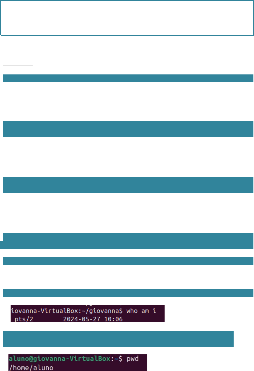 ATIVIDADE DE SISTEMAS OPERACIONAIS PARTE 1: 1) Crie um grupo chamado alunos com GID 4321 · sudo groupadd –g 4321 alunos · sudo useradd alunos1 –g alunos –d /home · sudo passwd alunos1 2) Crie um usuário chamado aluno1, com senha S3nh@aluno1, seu diretório em /home e que pertença ao grupo alunos · sudo useradd alunos1 –g alunos –d /home · sudo passwd alunos1 3) Crie um usuário chamado aluno2, com senha S3nh@aluno2, seu diretório em /home e que pertença ao grupo alunos. · sudo useradd alunos2 –g alunos –d /home · sudo passwd alunos2 4) Use Alt-F2 para abrir uma nova sessão e logue-se com aluno1. sudo su aluno1 5) Use Alt-F3 para abrir uma nova sessão e logue-se com aluno2. · sudo su aluno2 6) Estando na sessão de aluno 1, teste o comando who am i 7) Estando na sessão de aluno 1, use pwd para verificar se está em seu diretório Home (/home/aluno1). Faça o mesmo com aluno2. 8) Volte para a primeira sessão, a de root (Alt-F1) e exclua o aluno2, inclusive com seus arquivos. Caso dê um erro, volte à sessão de aluno2 (Alt-F3) e deslogue-se com comando exit · sudo userdel –r alunos2 9) Volte à sessão de aluno1 e troque sua própria senha. · passwd aluno1 PARTE 2: 1) Na sessão de root (Alt-F1), entre no diretório Home de aluno1 (/home/aluno1). · cd/home/aluno1 2) Crie aí um arquivo chamado teste.sh com o conteúdo: echo "Testando..." · sudo nano /home/aluno1/teste.sh 3) Salve o arquivo e mude suas permissões para 700. · sudo chmod 700 /home/aluno1/teste.sh 4) Teste sua execução, com ./teste.sh 5) Você deve ver a palavra "Testando" em sua tela. 6) Agora, vá par a sessão de aluno1 (Alt-F2) e entre em seu diretório Home (/home/aluno1). 7) Tente rodar o arquivo com ./teste.sh e verá erro de permissão, certo? 8) Com o comando ls -al você verá que este arquivo, apesar de estar no diretório dele (aluno1), pertence a root root. 9) Volte à sessão de root (Alt-F1) e use o comando chown para permitir que o usuário aluno1, do grupo alunos, seja o novo proprietário deste arquivo. · sudo chown aluno1:alunos /home/aluno1/teste.shcd 10) Volte à sessão de aluno1 e novamente tente executar o script. su PARTE 3: 1) Como usuário root, faça a atualização de sua lista de pacotes. · Apt update 2) Em seguida, faça a atualização dos pacotes instalados. · Apt upgrade 3) Depois, instale o editor de textos joe. · Apt install jpe 4) Edite um arquivo teste com o joe (joe teste) 5) Remova o joe completamente, inclusive seus arquivos de configuração. · Apt purge joe 6) Tente editar o arquivo teste novamente com o joe (joe teste) e verá que retornará um erro! image6.png image1.png image2.png image3.png image4.png image5.png