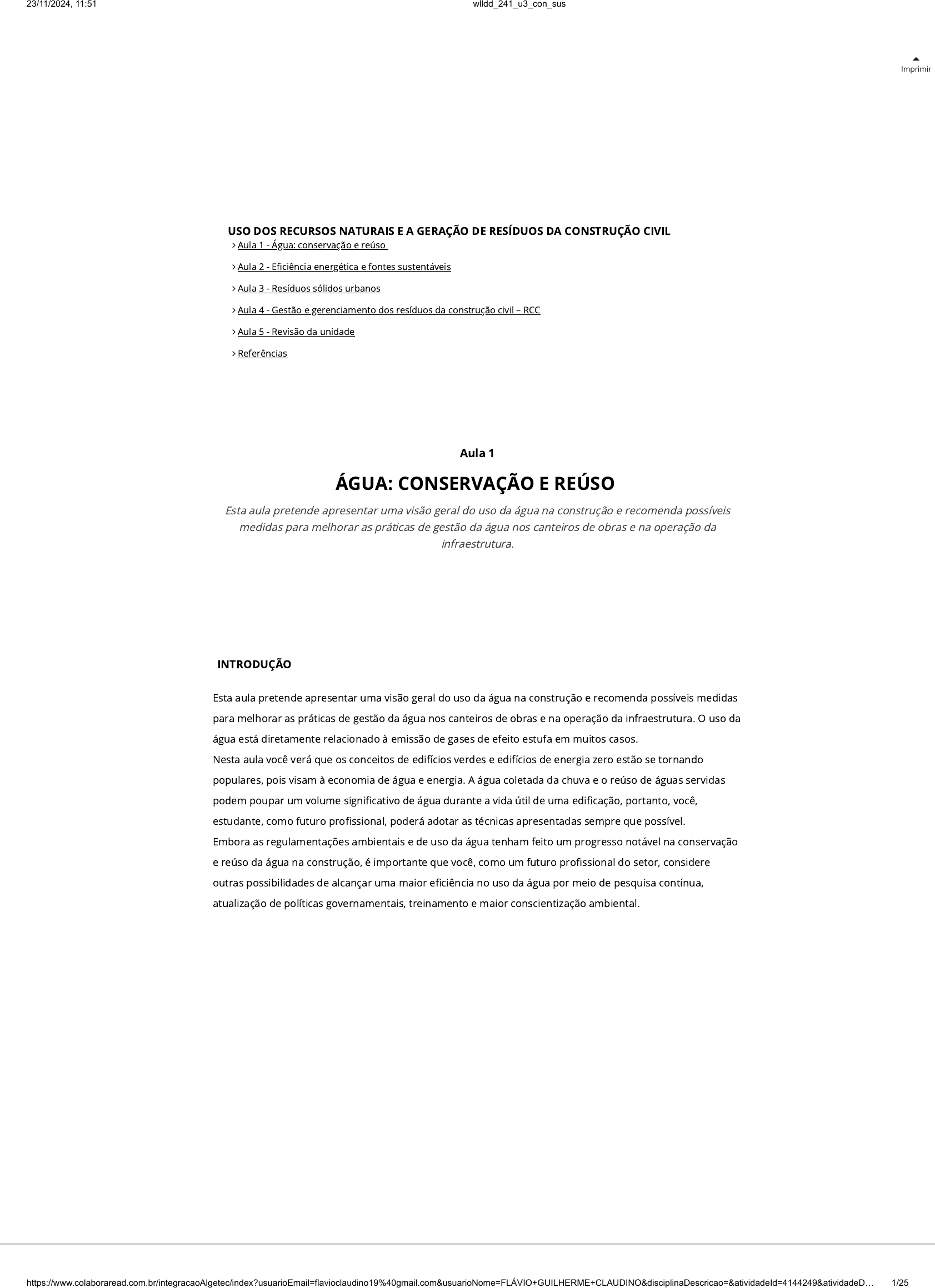 Imprimir INTRODUÇÃO Esta aula pretende apresentar uma visão geral do uso da água na construção e recomenda possíveis medidas para melhorar as práticas de gestão da água nos canteiros de obras e na operação da infraestrutura. O uso da água está diretamente relacionado à emissão de gases de efeito estufa em muitos casos. Nesta aula você verá que os conceitos de edifícios verdes e edifícios de energia zero estão se tornando populares, pois visam à economia de água e energia. A água coletada da chuva e o reúso de águas servidas podem poupar um volume signi�cativo de água durante a vida útil de uma edi�cação, portanto, você, estudante, como futuro pro�ssional, poderá adotar as técnicas apresentadas sempre que possível. Embora as regulamentações ambientais e de uso da água tenham feito um progresso notável na conservação e reúso da água na construção, é importante que você, como um futuro pro�ssional do setor, considere outras possibilidades de alcançar uma maior e�ciência no uso da água por meio de pesquisa contínua, atualização de políticas governamentais, treinamento e maior conscientização ambiental. Aula 1 ÁGUA: CONSERVAÇÃO E REÚSO Esta aula pretende apresentar uma visão geral do uso da água na construção e recomenda possíveis medidas para melhorar as práticas de gestão da água nos canteiros de obras e na operação da infraestrutura. USO DOS RECURSOS NATURAIS E A GERAÇÃO DE RESÍDUOS DA CONSTRUÇÃO CIVIL Aula 1 - Água: conservação e reúso Aula 2 - E�ciência energética e fontes sustentáveis Aula 3 - Resíduos sólidos urbanos Aula 4 - Gestão e gerenciamento dos resíduos da construção civil – RCC Aula 5 - Revisão da unidade Referências 23/11/2024, 11:51 wlldd_241_u3_con_sus https://www.colaboraread.com.br/integracaoAlgetec/index?usuarioEmail=flavioclaudino19%40gmail.com&usuarioNome=FLÁVIO+GUILHERME+CLAUDINO&disciplinaDescricao=&atividadeId=4144249&atividadeD… 1/25 USO DE ÁGUA NO SETOR DE CONSTRUÇÃO CIVIL E SISTEMAS DE DRENAGEM A água é um dos componentes essenciais na construção, sendo necessária em quantidade variável, dependendo do tipo, escala e etapas de um projeto. Exemplos incluem supressão de poeira durante a fase de escavação de uma construção de engenharia civil, compactação do solo, imersão de agregados graúdos, preparação de argamassa, mistura de concreto de cimento, cura de concreto, lavagem de equipamentos, limpeza de canteiros de obras, demolição (por jato de água), paisagismo, combate a incêndios e consumo humano. Além disso, um volume considerável de e�uentes e águas pluviais geralmente é gerado em um canteiro de obras, que muitas vezes necessita de tratamento antes de ser reutilizado ou descartado no ambiente natural. A água para construção pode ser derivada de várias fontes. Uma das fontes mais comuns é a água subterrânea, que é bombeada de aquíferos e usada para atividades de construção. As águas subterrâneas são utilizadas principalmente para atividades de construção mineira em áreas remotas, onde não há água canalizada nem água super�cial facilmente disponível. O aproveitamento das águas subterrâneas envolve o bombeamento, que necessita de energia associada às emissões de gases de efeito estufa. Outra fonte de água é água de superfície, por exemplo, rio e lago. A água reciclada também é utilizada na construção, por exemplo, na preparação de misturas de concreto utilizando águas residuais domésticas tratadas. Um volume signi�cativo de água, denominado “água incorporada”, é usado no processo de fabricação de vários materiais de construção, como aço, tijolo, cimento, alumínio, vidro e carpete. No processo de fabricação desses materiais, a água pode ser usada como lubri�cante, agente de limpeza, selante, meio de transferência de calor, solvente, meio de controle de poluição do ar e uma série de outras �nalidades, dependendo dos materiais que estão sendo fabricados. Além disso, para certas atividades na construção, como mistura e cura de concreto, é importante o uso de água limpa e livre de contaminantes. Água potável é frequentemente usada na preparação de argamassa e concreto fresco. Por exemplo, o uso de aditivos redutores de água na preparação de concreto fresco e argamassa pode reduzir até 10% o consumo de água, enquanto os aditivos aumentam a trabalhabilidade do concreto e da argamassa (Tamura, 2020). Somado a isso, toda essa água precisa ser direcionada de forma segura para os canais de drenagem. Os sistemas de drenagem na construção civil servem para garantir a estabilidade, longevidade e funcionalidade dos ambientes construídos. São intrincadas redes de tubulações, canais e estruturas, devidamente projetadas para gerenciar e redirecionar a água – seja da chuva, subterrânea ou de outras fontes – para longe de áreas críticas, como fundações de edifícios, porões e paisagens circundantes. Ao canalizar efetivamente a água para longe das estruturas, os sistemas de drenagem ajudam a evitar o acúmulo de água, a erosão do solo, danos à fundação e possíveis falhas estruturais. À medida que a urbanização continua a se expandir e os padrões climáticos evoluem, o papel de sistemas de drenagem e�cientes torna-se ainda mais primordial, enfatizando a necessidade de soluções inovadoras de design e práticas sustentáveis em projetos de construção (Tamura, 2020; Curi, 2012). 23/11/2024, 11:51 wlldd_241_u3_con_sus https://www.colaboraread.com.br/integracaoAlgetec/index?usuarioEmail=flavioclaudino19%40gmail.com&usuarioNome=FLÁVIO+GUILHERME+CLAUDINO&disciplinaDescricao=&atividadeId=4144249&atividadeD… 2/25 MEDIDAS SUSTENTÁVEIS DE CONSERVAÇÃO E DRENAGEM DA ÁGUA NA INDÚSTRIA DA CONSTRUÇÃO Nos últimos anos, o uso de água em novos edifícios foi substancialmente reduzido como resultado da aplicação de uma ampla gama de tecnologi