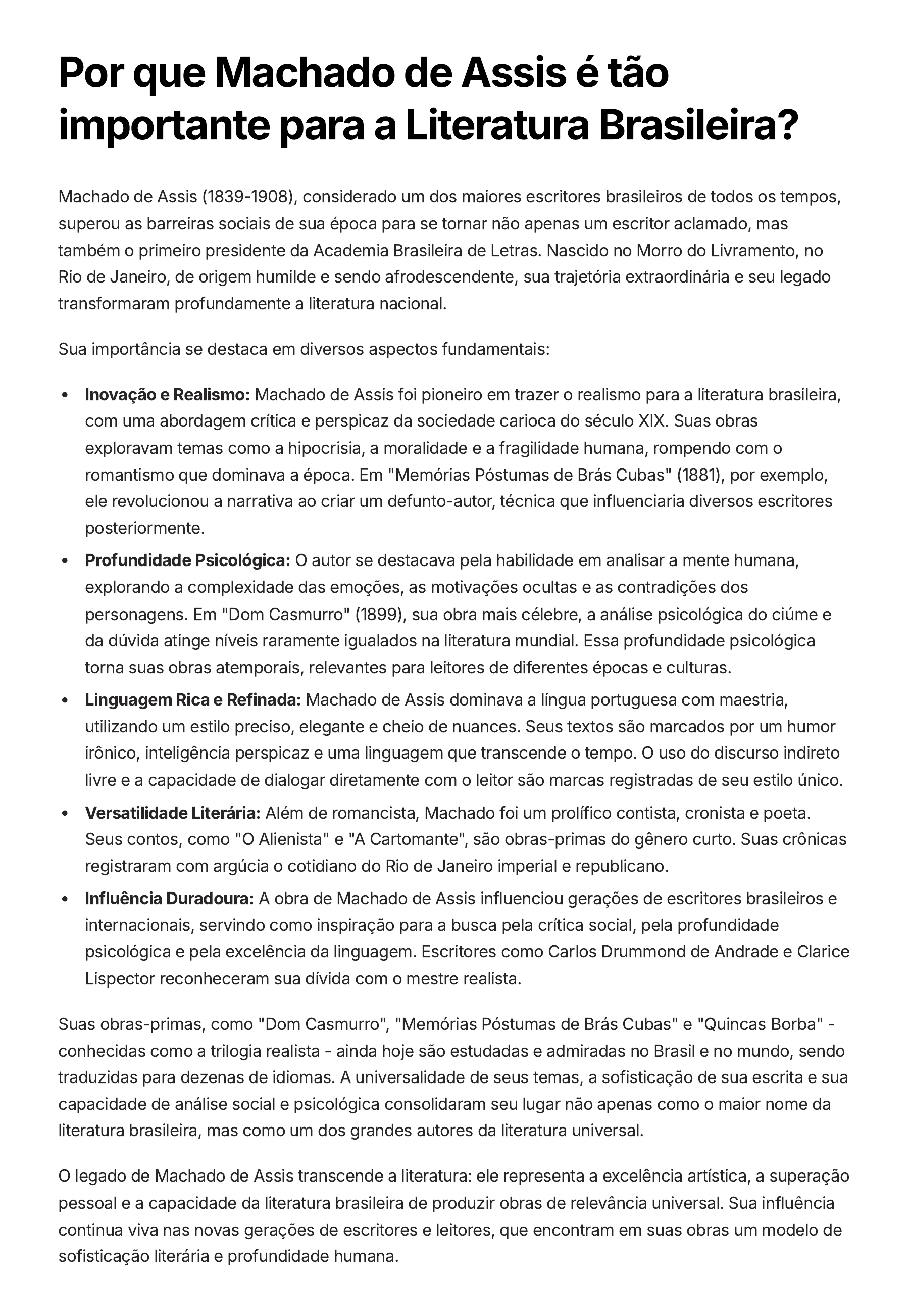 Por que Machado de Assis é tão importante para a Literatura Brasileira? Machado de Assis (1839-1908), considerado um dos maiores escritores brasileiros de todos os tempos, superou as barreiras sociais de sua época para se tornar não apenas um escritor aclamado, mas também o primeiro presidente da Academia Brasileira de Letras. Nascido no Morro do Livramento, no Rio de Janeiro, de origem humilde e sendo afrodescendente, sua trajetória extraordinária e seu legado transformaram profundamente a literatura nacional. Sua importância se destaca em diversos aspectos fundamentais: Inovação e Realismo: Machado de Assis foi pioneiro em trazer o realismo para a literatura brasileira, com uma abordagem crítica e perspicaz da sociedade carioca do século XIX. Suas obras exploravam temas como a hipocrisia, a moralidade e a fragilidade humana, rompendo com o romantismo que dominava a época. Em "Memórias Póstumas de Brás Cubas" (1881), por exemplo, ele revolucionou a narrativa ao criar um defunto-autor, técnica que influenciaria diversos escritores posteriormente. Profundidade Psicológica: O autor se destacava pela habilidade em analisar a mente humana, explorando a complexidade das emoções, as motivações ocultas e as contradições dos personagens. Em "Dom Casmurro" (1899), sua obra mais célebre, a análise psicológica do ciúme e da dúvida atinge níveis raramente igualados na literatura mundial. Essa profundidade psicológica torna suas obras atemporais, relevantes para leitores de diferentes épocas e culturas. Linguagem Rica e Refinada: Machado de Assis dominava a língua portuguesa com maestria, utilizando um estilo preciso, elegante e cheio de nuances. Seus textos são marcados por um humor irônico, inteligência perspicaz e uma linguagem que transcende o tempo. O uso do discurso indireto livre e a capacidade de dialogar diretamente com o leitor são marcas registradas de seu estilo único. Versatilidade Literária: Além de romancista, Machado foi um prolífico contista, cronista e poeta. Seus contos, como "O Alienista" e "A Cartomante", são obras-primas do gênero curto. Suas crônicas registraram com argúcia o cotidiano do Rio de Janeiro imperial e republicano. Influência Duradoura: A obra de Machado de Assis influenciou gerações de escritores brasileiros e internacionais, servindo como inspiração para a busca pela crítica social, pela profundidade psicológica e pela excelência da linguagem. Escritores como Carlos Drummond de Andrade e Clarice Lispector reconheceram sua dívida com o mestre realista. Suas obras-primas, como "Dom Casmurro", "Memórias Póstumas de Brás Cubas" e "Quincas Borba" - conhecidas como a trilogia realista - ainda hoje são estudadas e admiradas no Brasil e no mundo, sendo traduzidas para dezenas de idiomas. A universalidade de seus temas, a sofisticação de sua escrita e sua capacidade de análise social e psicológica consolidaram seu lugar não apenas como o maior nome da literatura brasileira, mas como um dos grandes autores da literatura universal. O legado de Machado de Assis transcende a literatura: ele representa a excelência artística, a superação pessoal e a capacidade da literatura brasileira de produzir obras de relevância universal. Sua influência continua viva nas novas gerações de escritores e leitores, que encontram em suas obras um modelo de sofisticação literária e profundidade humana.